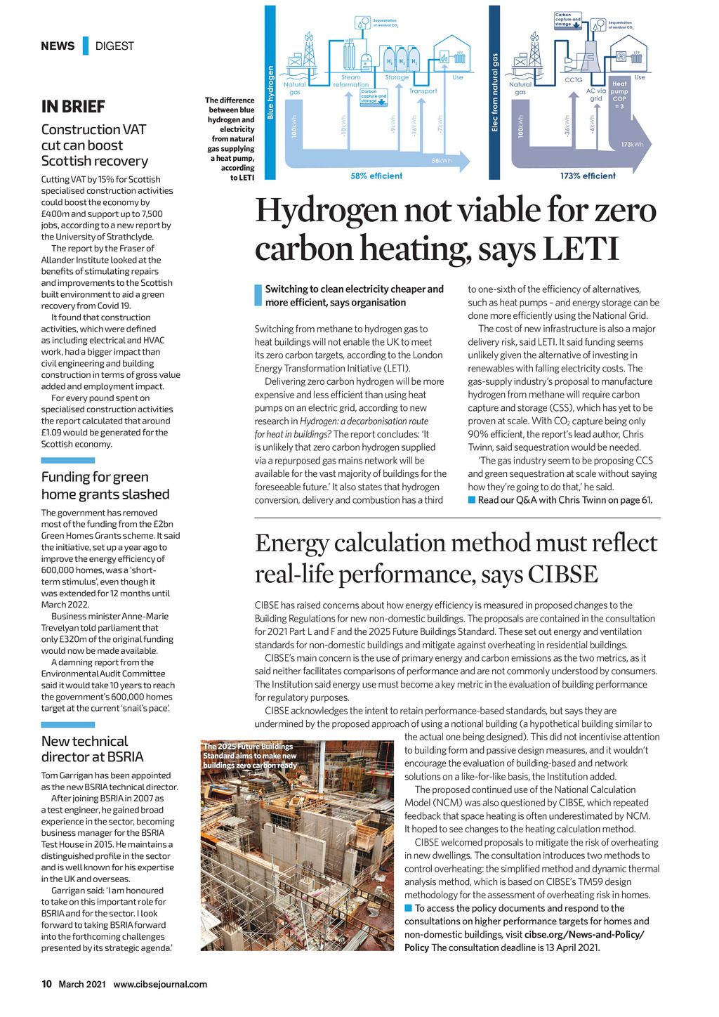 NEWS | DIGEST IN BRIEF Construction VAT cut can boost Scottish recovery Cutting VAT by 15% for Scottish specialised construction activities could boost the economy by 400m and support up to 7,500 jobs, according to a new report by the University of Strathclyde. The report by the Fraser of Allander Institute looked at the benefits of stimulating repairs and improvements to the Scottish built environment to aid a green recovery from Covid 19. It found that construction activities, which were defined as including electrical and HVAC work, had a bigger impact than civil engineering and building construction in terms of gross value added and employment impact. For every pound spent on specialised construction activities the report calculated that around 1.09 would be generated for the Scottish economy. The difference between blue hydrogen and electricity from natural gas supplying a heat pump, according to LETI Hydrogen not viable for zero carbon heating, says LETI Switching to clean electricity cheaper and more efcient, says organisation Switching from methane to hydrogen gas to heat buildings will not enable the UK to meet its zero carbon targets, according to the London Energy Transformation Initiative (LETI). Delivering zero carbon hydrogen will be more expensive and less efcient than using heat pumps on an electric grid, according to new research in Hydrogen: a decarbonisation route for heat in buildings? The report concludes: It is unlikely that zero carbon hydrogen supplied via a repurposed gas mains network will be available for the vast majority of buildings for the foreseeable future. It also states that hydrogen conversion, delivery and combustion has a third Funding for green home grants slashed The government has removed most of the funding from the 2bn Green Homes Grants scheme. It said the initiative, set up a year ago to improve the energy efficiency of 600,000 homes, was a shortterm stimulus, even though it was extended for 12 months until March 2022. Business minister Anne-Marie Trevelyan told parliament that only 320m of the original funding would now be made available. A damning report from the Environmental Audit Committee said it would take 10 years to reach the governments 600,000 homes target at the current snails pace. New technical director at BSRIA Tom Garrigan has been appointed as the new BSRIA technical director. After joining BSRIA in 2007 as a test engineer, he gained broad experience in the sector, becoming business manager for the BSRIA Test House in 2015. He maintains a distinguished profile in the sector and is well known for his expertise in the UK and overseas. Garrigan said: I am honoured to take on this important role for BSRIA and for the sector. I look forward to taking BSRIA forward into the forthcoming challenges presented by its strategic agenda. to one-sixth of the efciency of alternatives, such as heat pumps and energy storage can be done more efciently using the National Grid. The cost of new infrastructure is also a major delivery risk, said LETI. It said funding seems unlikely given the alternative of investing in renewables with falling electricity costs. The gas-supply industrys proposal to manufacture hydrogen from methane will require carbon capture and storage (CSS), which has yet to be proven at scale. With CO2 capture being only 90% efcient, the reports lead author, Chris Twinn, said sequestration would be needed. The gas industry seem to be proposing CCS and green sequestration at scale without saying how theyre going to do that, he said. Read our Q&A with Chris Twinn on page 61. Energy calculation method must reflect real-life performance, says CIBSE CIBSE has raised concerns about how energy efciency is measured in proposed changes to the Building Regulations for new non-domestic buildings. The proposals are contained in the consultation for 2021 Part L and F and the 2025 Future Buildings Standard. These set out energy and ventilation standards for non-domestic buildings and mitigate against overheating in residential buildings. CIBSEs main concern is the use of primary energy and carbon emissions as the two metrics, as it said neither facilitates comparisons of performance and are not commonly understood by consumers. The Institution said energy use must become a key metric in the evaluation of building performance for regulatory purposes. CIBSE acknowledges the intent to retain performance-based standards, but says they are undermined by the proposed approach of using a notional building (a hypothetical building similar to the actual one being designed). This did not incentivise attention The 2025 Future Buildings to building form and passive design measures, and it wouldnt Standard aims to make new encourage the evaluation of building-based and network buildings zero carbon ready solutions on a like-for-like basis, the Institution added. The proposed continued use of the National Calculation Model (NCM) was also questioned by CIBSE, which repeated feedback that space heating is often underestimated by NCM. It hoped to see changes to the heating calculation method. CIBSE welcomed proposals to mitigate the risk of overheating in new dwellings. The consultation introduces two methods to control overheating: the simplied method and dynamic thermal analysis method, which is based on CIBSEs TM59 design methodology for the assessment of overheating risk in homes. To access the policy documents and respond to the consultations on higher performance targets for homes and non-domestic buildings, visit cibse.org/News-and-Policy/ Policy The consultation deadline is 13 April 2021. 10 March 2021 www.cibsejournal.com CIBSE March 21 pp10 News V2.indd 10 19/02/2021 17:34