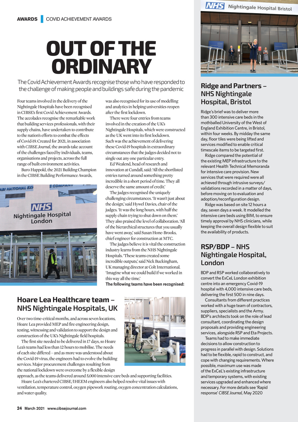 AWARDS | COVID ACHIEVEMENT AWARDS OUT OF THE ORDINARY The Covid Achievement Awards recognise those who have responded to the challenge of making people and buildings safe during the pandemic Four teams involved in the delivery of the Nightingale Hospitals have been recognised in CIBSEs first Covid Achievement Awards. The accolades recognise the remarkable work that building services professionals, with their supply chains, have undertaken to contribute to the nations efforts to combat the effects of Covid-19. Created for 2021, in association with CIBSE Journal, the awards take account of the challenges faced by individuals, teams, organisations and projects, across the full range of built environment activities. Buro Happold, the 2021 Building Champion in the CIBSE Building Performance Awards, was also recognised for its use of modelling and analytics in helping universities reopen after the first lockdown. There were four entries from teams involved in the creation of the UKs Nightingale Hospitals, which were constructed as the UK went into its first lockdown. Such was the achievement of delivering these Covid-19 hospitals in extraordinary circumstances that the judges decided not to single out any one particular entry. Ed Wealend, head of research and innovation at Cundall, said: All the shortlisted entries turned around something pretty incredible in a short period of time. They all deserve the same amount of credit. The judges recognised the uniquely challenging circumstances. It wasnt just about the design, said Hywel Davies, chair of the judges. It was the long hours, with half the supply chain trying to shut down on them. They also praised the level of collaboration. All of the hierarchical structures that you usually have went away, said Susan Hone-Brooks, chief engineer for construction at MTC. The judges believe it is vital the construction industry learns from the NHS Nightingale Hospitals. These teams created some incredible outputs, said Nick Buckingham, UK managing director at Colt International. Imagine what we could build if we worked in this way all the time. The following teams have been recognised: Hoare Lea Healthcare team NHS Nightingale Hospitals, UK Over two time-critical months, and across seven locations, Hoare Lea provided MEP and fire engineering design, testing, witnessing and validation to support the design and construction of the UKs Nightingale field hospitals. The first site needed to be delivered in 17 days, so Hoare Leas teams had less than 12 hours to mobilise. The needs of each site differed and as more was understood about the Covid-19 virus, the engineers had to evolve the building services. Major procurement challenges resulting from the national lockdown were overcome by a flexible design approach, as the teams delivered around 5,000 intensive care beds and supporting facilities. Hoare Leas chartered CIBSE/IHEEM engineers also helped resolve vital issues with ventilation, temperature control, oxygen pipework routing, oxygen concentration calculations, and water quality. Ridge and Partners NHS Nightingale Hospital, Bristol Ridges brief was to deliver more than 300 intensive care beds in the mothballed University of the West of England Exhibition Centre, in Bristol, within four weeks. By midday the same day, floor tiles were being lifted and services modified to enable critical timescale items to be targeted first. Ridge compared the potential of the existing MEP infrastructure to the relevant Health Technical Memoranda for intensive care provision. New services that were required were all achieved through intrusive surveys/ validations recorded in a matter of days, before moving on to evaluation and adoption/reconfiguration design. Ridge was based on site 12 hours a day, seven days a week. It modelled the intensive care beds using BIM, to ensure timely approval by NHS clinicians, while keeping the overall design flexible to suit the availability of products. RSP/BDP NHS Nightingale Hospital, London BDP and RSP worked collaboratively to convert the ExCeL London exhibition centre into an emergency Covid-19 hospital with 4,000 intensive care beds, delivering the first 500 in nine days. Consultants from different practices worked with a huge team of contractors, suppliers, specialists and the Army. BDPs architects took on the role of lead consultant, coordinating the design proposals and providing engineering services, alongside RSP and Eta Projects. Teams had to make immediate decisions to allow construction to progress in parallel with design. Solutions had to be flexible, rapid to construct, and cope with changing requirements. Where possible, maximum use was made of the ExCeLs existing infrastructure and temporary systems, with existing services upgraded and enhanced where necessary. For more details see Rapid response CIBSE Journal, May 2020 24 March 2021 www.cibsejournal.com CIBSE March 21 pp24-25 Covid Achievement Awards.indd 24 19/02/2021 16:19