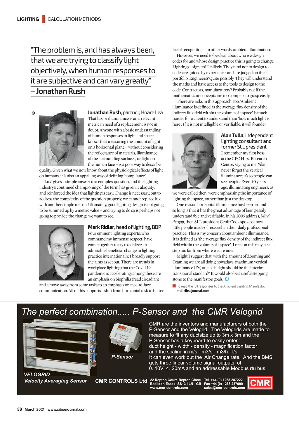 LIGHTING | CALCULATION METHODS The problem is, and has always been, that we are trying to classify light objectively, when human responses to it are subjective and can vary greatly Jonathan Rush Jonathan Rush, partner, Hoare Lea That lux or illuminance is an irrelevant metric in need of a replacement is not in doubt. Anyone with a basic understanding of human responses to light and space knows that measuring the amount of light on a horizontal plane without considering the reflectance of materials, illuminance of the surrounding surfaces, or light on the human face is a poor way to describe quality. Given what we now know about the physiological effects of light on humans, it is also an appalling way of defining compliance. Lux gives a simple answer to a complex question, and the lighting industrys continued championing of the term has given it ubiquity, and reinforced the idea that lighting is easy. Change is necessary, but to address the complexity of the question properly, we cannot replace lux with another simple metric. Ultimately, good lighting design is not going to be summed up by a metric value and trying to do so is perhaps not going to provide the change we want to see. Mark Ridler, head of lighting, BDP Four eminent lighting experts, who command my immense respect, have come together to try to achieve an admirable beneficial change in lighting practice internationally. I broadly support the aims as set out. There are trends in workplace lighting that the Covid-19 pandemic is accelerating; among these are an emphasis on biophilia (read circadian) and a move away from some tasks to an emphasis on face-to-face communication. All of this supports a shift from horizontal task to better facial recognition in other words, ambient illumination. However, we need to be clear about who we design codes for and whose design practice this is going to change. Lighting designers? Unlikely. They tend not to design to code, are guided by experience, and are judged on their portfolio. Engineers? Quite possibly. They will understand the maths and have access to the tools to design to the code. Contractors, manufacturers? Probably not if the mathematics or concepts are too complex to grasp easily. There are risks in this approach, too. Ambient illuminance is defined as the average flux density of the indirect flux field within the volume of a space is much harder for a client to understand than how much light is here. If it is not intelligible or verifiable, it will founder. Alan Tulla, independent lighting consultant and former SLL president I remember my first boss, at the GEC Hirst Research Centre, saying to me: Alan, never forget the vertical illuminance; its so people can see people. Even 40 years ago, illuminating engineers, as we were called then, were emphasising the importance of lighting the space, rather than just the desktop. One reason horizontal illuminance has been around so long is that it has the great advantage of being easily understandable and verifiable. In his 2005 address, Mind the gap, then SLL president Geoff Cook spoke of how little people made of research in their daily professional practice. This is my concern about ambient illuminance. It is defined as the average flux density of the indirect flux field within the volume of a space. I reckon this may be a step too far from where we are now. Might I suggest that, with the amount of Zooming and Teaming we are all doing nowadays, maximum vertical illuminance (Ev) at face height should be the interim transitional standard? It would also be a useful stepping stone to the manifestos goals. CJ T o read the full responses to the Ambient Lighting Manifesto, visit cibsejournal.com 38 March 2021 www.cibsejournal.com CIBSE March 21 pp36-38 Lighting manifesto response.indd 38 19/02/2021 17:46