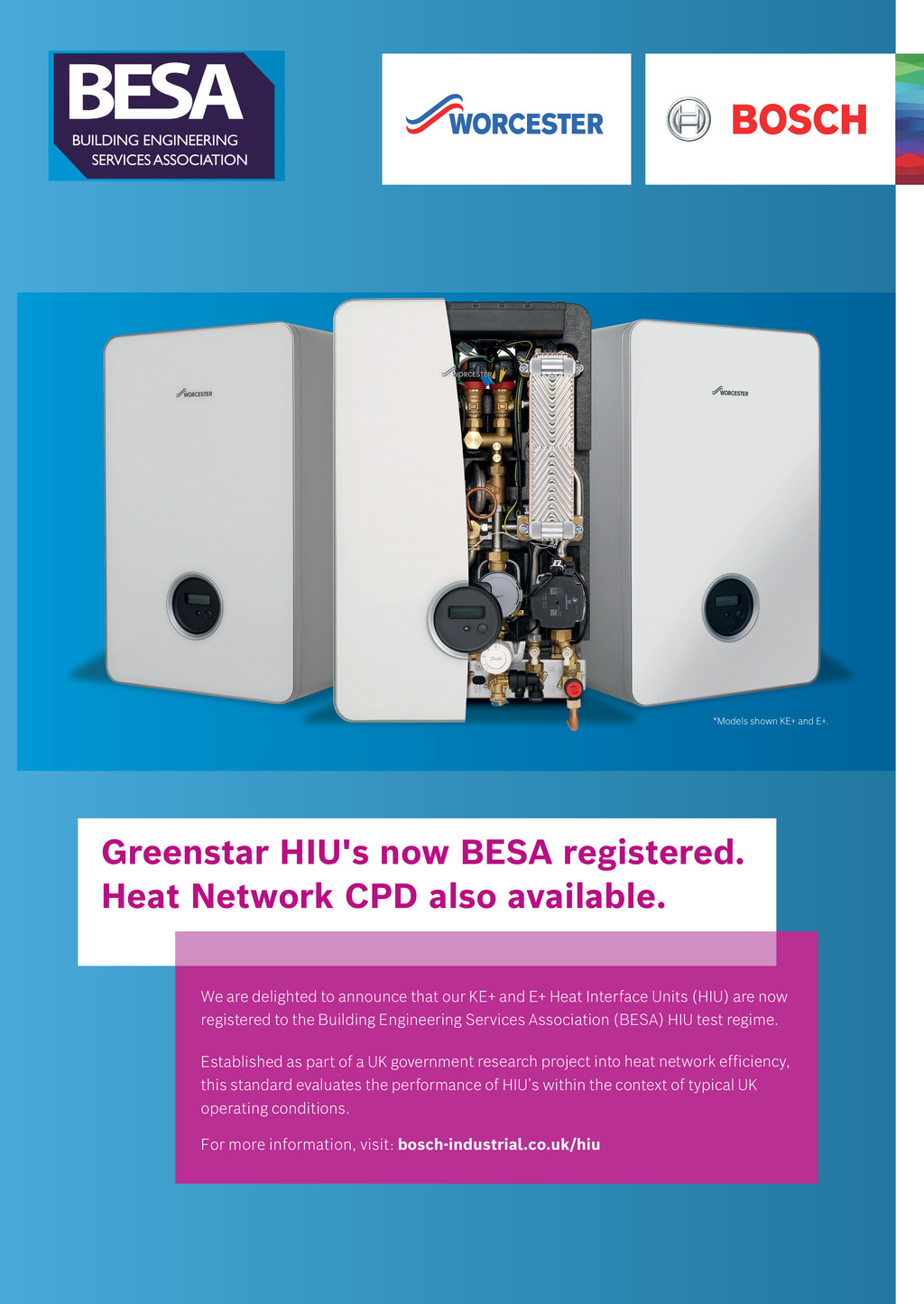 Models shown KE+ and E+. Greenstar HIU s now BESA registered. Heat Network CPD also available. We are delighted to announce that our KE+ and E+ Heat Interface Units (HIU) are now registered to the Building Engineering Services Association (BESA) HIU test regime. Established as part of a UK government research project into heat network efficiency, this standard evaluates the performance of HIUs within the context of typical UK operating conditions. PSNPSFJOGPSNBUJPO WJTJUCPTDIJOEVTUSJBMDPVLIJV 4 March 2021 www.cibsejournal.com p04.CIBSEMagMar21.indd 4 16/02/2021 11:52