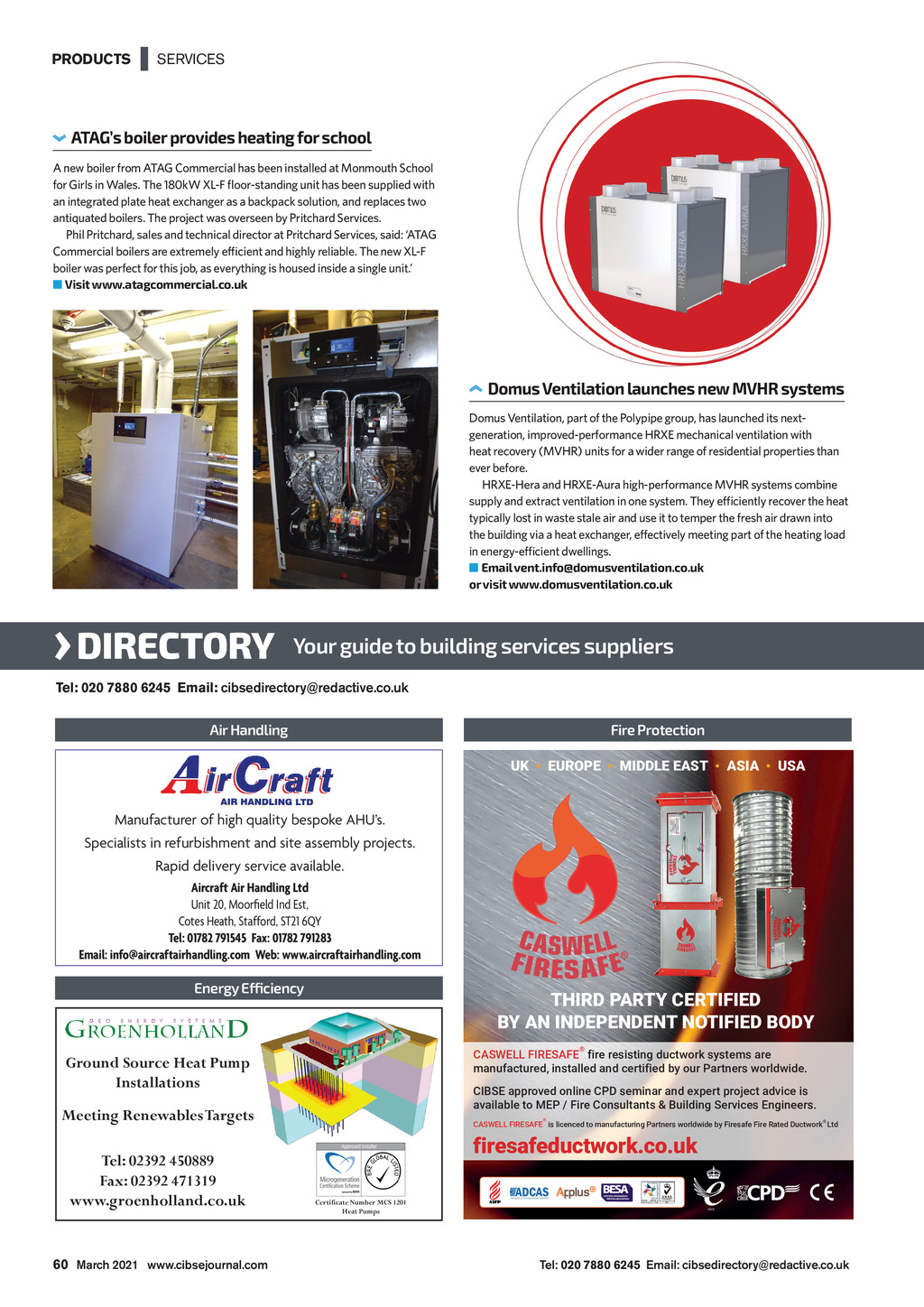 PRODUCTS | SERVICES ATAGs boiler provides heating for school A new boiler from ATAG Commercial has been installed at Monmouth School for Girls in Wales. The 180kW XL-F floor-standing unit has been supplied with an integrated plate heat exchanger as a backpack solution, and replaces two antiquated boilers. The project was overseen by Pritchard Services. Phil Pritchard, sales and technical director at Pritchard Services, said: ATAG Commercial boilers are extremely efficient and highly reliable. The new XL-F boiler was perfect for this job, as everything is housed inside a single unit. Visit www.atagcommercial.co.uk Domus Ventilation launches new MVHR systems Domus Ventilation, part of the Polypipe group, has launched its nextgeneration, improved-performance HRXE mechanical ventilation with heat recovery (MVHR) units for a wider range of residential properties than ever before. HRXE-Hera and HRXE-Aura high-performance MVHR systems combine supply and extract ventilation in one system. They efficiently recover the heat typically lost in waste stale air and use it to temper the fresh air drawn into the building via a heat exchanger, effectively meeting part of the heating load in energy-efficient dwellings. Email vent.info@domusventilation.co.uk or visit www.domusventilation.co.uk DIRECTORY Your guide suppliers guideto tobuilding buildingservices services suppliers Tel: 020 020 7880 78806245 6245 Email: Email:cibsedirectory@redactive.co.uk cibsedirectory@redactive.co.uk Air Handling Fire Protection UK EUROPE MIDDLE EAST ASIA USA Manufacturer of high quality bespoke AHUs. Specialists in refurbishment and site assembly projects. Rapid delivery service available. Aircraft Air Handling Ltd Unit 20, Mooreld Ind Est, Cotes Heath, Stafford, ST21 6QY Tel: 01782 791545 Fax: 01782 791283 Email: info@aircraftairhandling.com Web: www.aircraftairhandling.com Energy Efficiency THIRD PARTY CERTIFIED BY AN INDEPENDENT NOTIFIED BODY &$6:(//),5(6$)(ILUHUHVLVWLQJGXFWZRUNV\VWHPVDUH CASWELL FIRESAFE fire resisting ductwork systems are PDQXIDFWXUHGLQVWDOOHGDQGFHUWLILHGE\RXU3DUWQHUVZRUOGZLGH manufactured, installed and certified by our Partners worldwide. &,%6(DSSURYHGRQOLQH&3 VHPLQDUDQGH[SHUWSURMHFWDGYLFHLV CIBSE approved online CPD seminar and expert project advice is DYDLODEOHWR0(3)LUH&RQVXOWDQWV %XLOGLQJ6HUYLFHV(QJLQHHUV available to MEP / Fire Consultants & Building Services Engineers. Ground Source Heat Pump Installations Meeting Renewables Targets Tel: 02392 450889 Fax: 02392 471319 www.groenholland.co.uk 1 March 60 March2021 2021 www.cibsejournal.com www.cibsejournal.com Groenholland 5x2.indd 1 CIBSEMarch Directory March 2021.indd 1 CIBSE 21 pp57-60 Products.indd 60 CASWELL FIRESAFE is licenced to manufacturing Partners worldwide by Firesafe Fire Rated Ductwork Ltd firesafeductwork.co.uk Certificate Number MCS 1201 Heat Pumps 27/1/09 09:40:29 Tel: 020 7880 6245 Email: cibsedirectory@redactive.co.uk 05/02/2021 15:26 08:48 19/02/2021