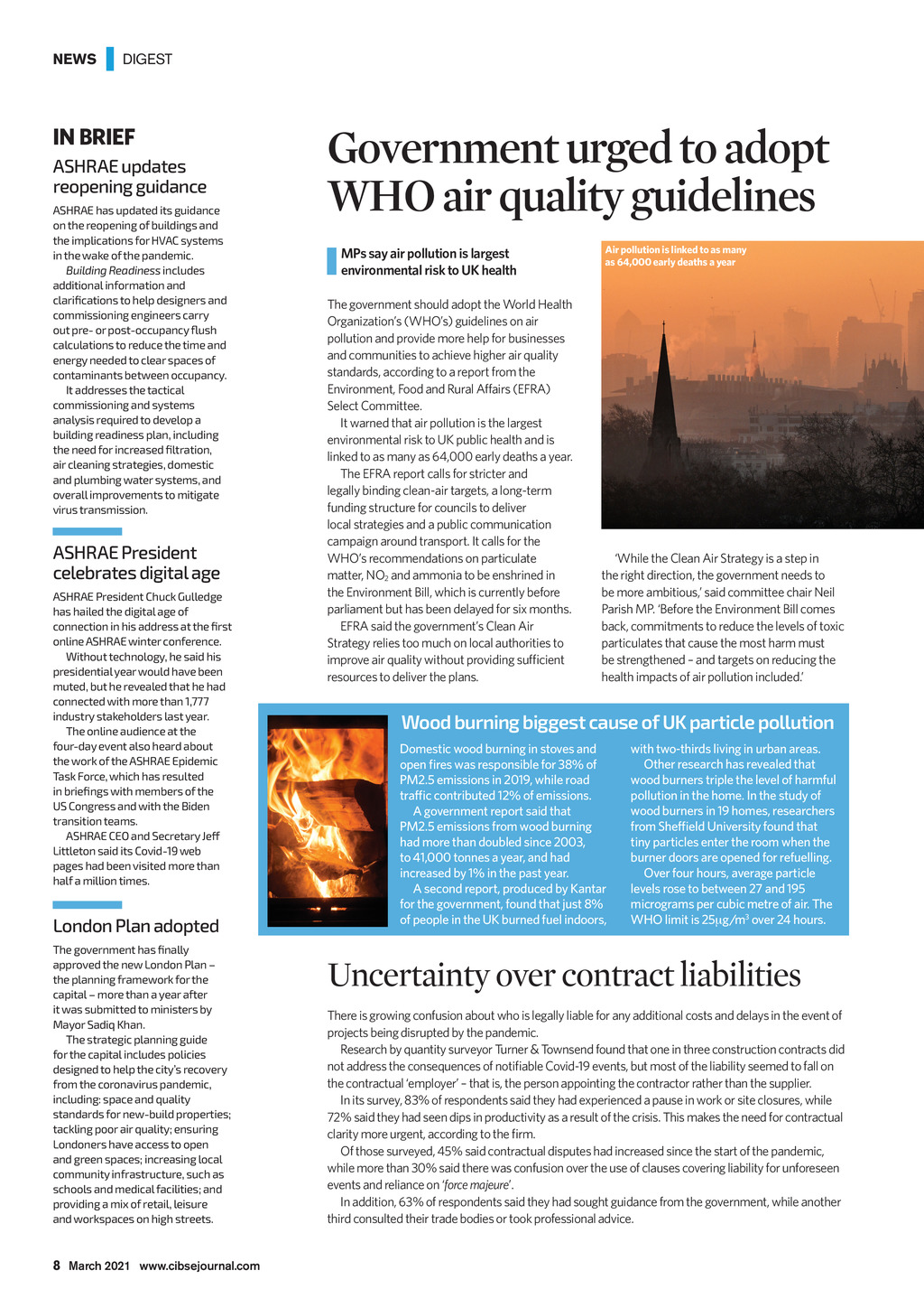 EWS | DIGEST IN BRIEF ASHRAE updates reopening guidance ASHRAE has updated its guidance on the reopening of buildings and the implications for HVAC systems in the wake of the pandemic. Building Readiness includes additional information and clarifications to help designers and commissioning engineers carry out pre- or post-occupancy flush calculations to reduce the time and energy needed to clear spaces of contaminants between occupancy. It addresses the tactical commissioning and systems analysis required to develop a building readiness plan, including the need for increased filtration, air cleaning strategies, domestic and plumbing water systems, and overall improvements to mitigate virus transmission. ASHRAE President celebrates digital age ASHRAE President Chuck Gulledge has hailed the digital age of connection in his address at the first online ASHRAE winter conference. Without technology, he said his presidential year would have been muted, but he revealed that he had connected with more than 1,777 industry stakeholders last year. The online audience at the four-day event also heard about the work of the ASHRAE Epidemic Task Force, which has resulted in briefings with members of the US Congress and with the Biden transition teams. ASHRAE CEO and Secretary Jeff Littleton said its Covid-19 web pages had been visited more than half a million times. London Plan adopted The government has finally approved the new London Plan the planning framework for the capital more than a year after it was submitted to ministers by Mayor Sadiq Khan. The strategic planning guide for the capital includes policies designed to help the citys recovery from the coronavirus pandemic, including: space and quality standards for new-build properties; tackling poor air quality; ensuring Londoners have access to open and green spaces; increasing local community infrastructure, such as schools and medical facilities; and providing a mix of retail, leisure and workspaces on high streets. Government urged to adopt WHO air quality guidelines MPs say air pollution is largest environmental risk to UK health The government should adopt the World Health Organizations (WHOs) guidelines on air pollution and provide more help for businesses and communities to achieve higher air quality standards, according to a report from the Environment, Food and Rural Affairs (EFRA) Select Committee. It warned that air pollution is the largest environmental risk to UK public health and is linked to as many as 64,000 early deaths a year. The EFRA report calls for stricter and legally binding clean-air targets, a long-term funding structure for councils to deliver local strategies and a public communication campaign around transport. It calls for the WHOs recommendations on particulate matter, NO2 and ammonia to be enshrined in the Environment Bill, which is currently before parliament but has been delayed for six months. EFRA said the governments Clean Air Strategy relies too much on local authorities to improve air quality without providing sufficient resources to deliver the plans. Air pollution is linked to as many as 64,000 early deaths a year While the Clean Air Strategy is a step in the right direction, the government needs to be more ambitious, said committee chair Neil Parish MP. Before the Environment Bill comes back, commitments to reduce the levels of toxic particulates that cause the most harm must be strengthened and targets on reducing the health impacts of air pollution included. Wood burning biggest cause of UK particle pollution Domestic wood burning in stoves and open fires was responsible for 38% of PM2.5 emissions in 2019, while road traffic contributed 12% of emissions. A government report said that PM2.5 emissions from wood burning had more than doubled since 2003, to 41,000 tonnes a year, and had increased by 1% in the past year. A second report, produced by Kantar for the government, found that just 8% of people in the UK burned fuel indoors, with two-thirds living in urban areas. Other research has revealed that wood burners triple the level of harmful pollution in the home. In the study of wood burners in 19 homes, researchers from Sheffield University found that tiny particles enter the room when the burner doors are opened for refuelling. Over four hours, average particle levels rose to between 27 and 195 micrograms per cubic metre of air. The WHO limit is 25g/m3 over 24 hours. Uncertainty over contract liabilities There is growing confusion about who is legally liable for any additional costs and delays in the event of projects being disrupted by the pandemic. Research by quantity surveyor Turner & Townsend found that one in three construction contracts did not address the consequences of notifiable Covid-19 events, but most of the liability seemed to fall on the contractual employer that is, the person appointing the contractor rather than the supplier. In its survey, 83% of respondents said they had experienced a pause in work or site closures, while 72% said they had seen dips in productivity as a result of the crisis. This makes the need for contractual clarity more urgent, according to the firm. Of those surveyed, 45% said contractual disputes had increased since the start of the pandemic, while more than 30% said there was confusion over the use of clauses covering liability for unforeseen events and reliance on force majeure. In addition, 63% of respondents said they had sought guidance from the government, while another third consulted their trade bodies or took professional advice. 8 March 2021 www.cibsejournal.com CIBSE March 21 pp08 News.indd 8 19/02/2021 17:29