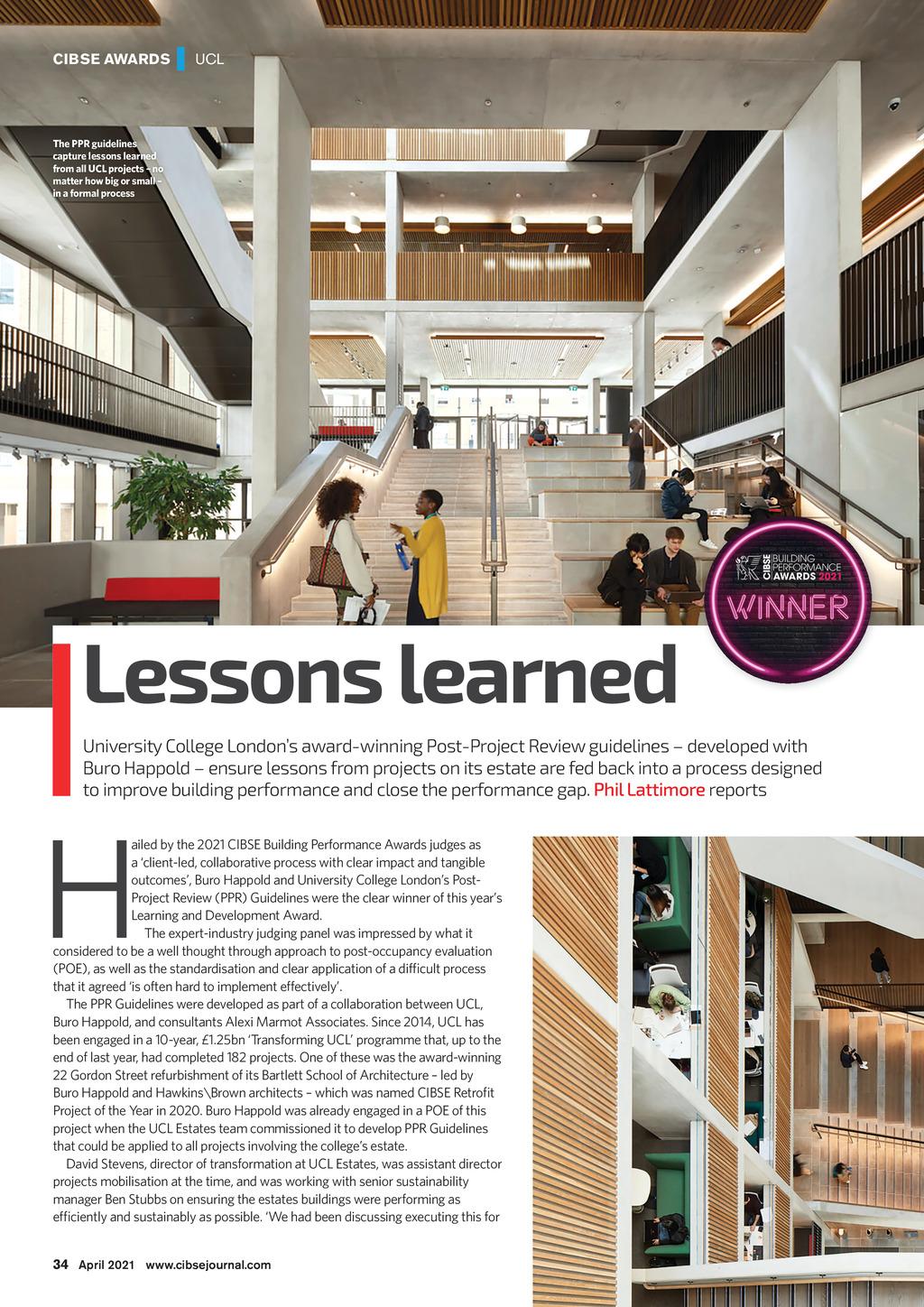 CIBSE AWARDS | UCL The PPR guidelines capture lessons learned from all UCL projects no matter how big or small in a formal process Lessons learned University College Londons award-winning Post-Project Review guidelines developed with Buro Happold ensure lessons from projects on its estate are fed back into a process designed to improve building performance and close the performance gap. Phil Lattimore reports H ailed by the 2021 CIBSE Building Performance Awards judges as a client-led, collaborative process with clear impact and tangible outcomes, Buro Happold and University College Londons PostProject Review (PPR) Guidelines were the clear winner of this years Learning and Development Award. The expert-industry judging panel was impressed by what it considered to be a well thought through approach to post-occupancy evaluation that it agreed is often hard to implement effectively. The PPR Guidelines were developed as part of a collaboration between UCL, Buro Happold, and consultants Alexi Marmot Associates. Since 2014, UCL has been engaged in a 10-year, 1.25bn Transforming UCL programme that, up to the end of last year, had completed 182 projects. One of these was the award-winning 22 Gordon Street refurbishment of its Bartlett School of Architecture led by Project of the Year in 2020. Buro Happold was already engaged in a POE of this project when the UCL Estates team commissioned it to develop PPR Guidelines that could be applied to all projects involving the colleges estate. David Stevens, director of transformation at UCL Estates, was assistant director projects mobilisation at the time, and was working with senior sustainability manager Ben Stubbs on ensuring the estates buildings were performing as 34 April 2021 www.cibsejournal.com CIBSE April 21 pp34-37 UCL learning award Supp.indd 34 26/03/2021 14:53