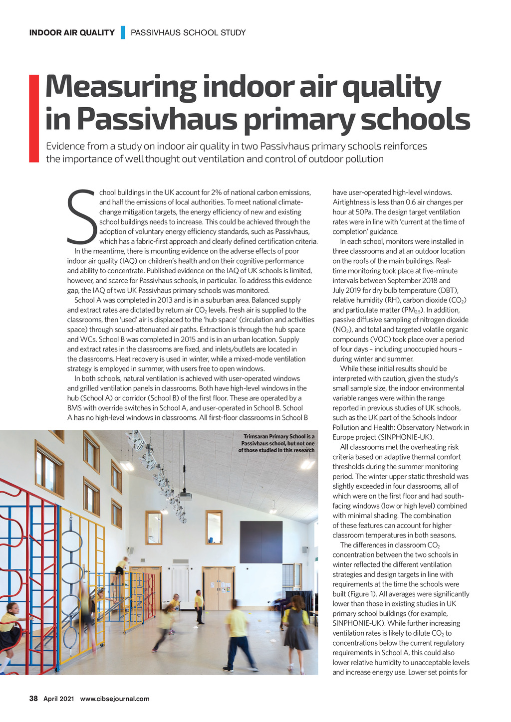 INDOOR AIR QUALITY | PASSIVHAUS SCHOOL STUDY Measuring indoor air quality in Passivhaus primary schools Evidence from a study on indoor air quality in two Passivhaus primary schools reinforces the importance of well thought out ventilation and control of outdoor pollution S chool buildings in the UK account for 2% of national carbon emissions, and half the emissions of local authorities. To meet national climateschool buildings needs to increase. This could be achieved through the In the meantime, there is mounting evidence on the adverse effects of poor indoor air quality (IAQ) on childrens health and on their cognitive performance completion guidance. three classrooms and at an outdoor location on the roofs of the main buildings. Real- ) 2 levels. Fresh air is supplied to the classrooms, then used air is displaced to the hub space (circulation and activities ). In addition, 2 ), and total and targeted volatile organic 2 of four days including unoccupied hours While these initial results should be small sample size, the indoor environmental reported in previous studies of UK schools, such as the UK part of the Schools Indoor Trimsaran Primary School is a Passivhaus school, but not one of those studied in this research All classrooms met the overheating risk criteria based on adaptive thermal comfort thresholds during the summer monitoring of these features can account for higher classroom temperatures in both seasons. 2 2 to requirements in School A, this could also 38 April 2021 www.cibsejournal.com CIBSE April 21 pp38-39 Passivhaus school IAQ study Supp.indd 38 26/03/2021 14:54