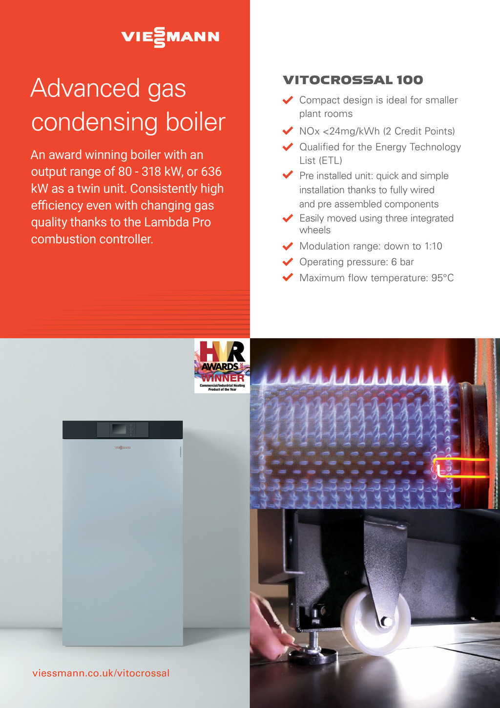 Advanced gas condensing boiler An award winning boiler with an output range of 80 - 318 kW, or 636 kW as a twin unit. Consistently high IGMIRG]IZIR[MXLGLERKMRKKEW quality thanks to the Lambda Pro GSQFYWXMSRGSRXVSPPIV VITOCROSSAL 100 Compact design is ideal for smaller plant rooms NOx <24mg/kWh (2 Credit Points) Qualied for the Energy Technology List (ETL) Pre installed unit: quick and simple installation thanks to fully wired and pre assembled components Easily moved using three integrated wheels Modulation range: down to 1:10 Operating pressure: 6 bar Maximum ow temperature: 95C viessmann.co.uk/vitocrossal 42 April 2021 www.cibsejournal.com p42.CIBSEMagApr21.indd 42 23/03/2021 11:59