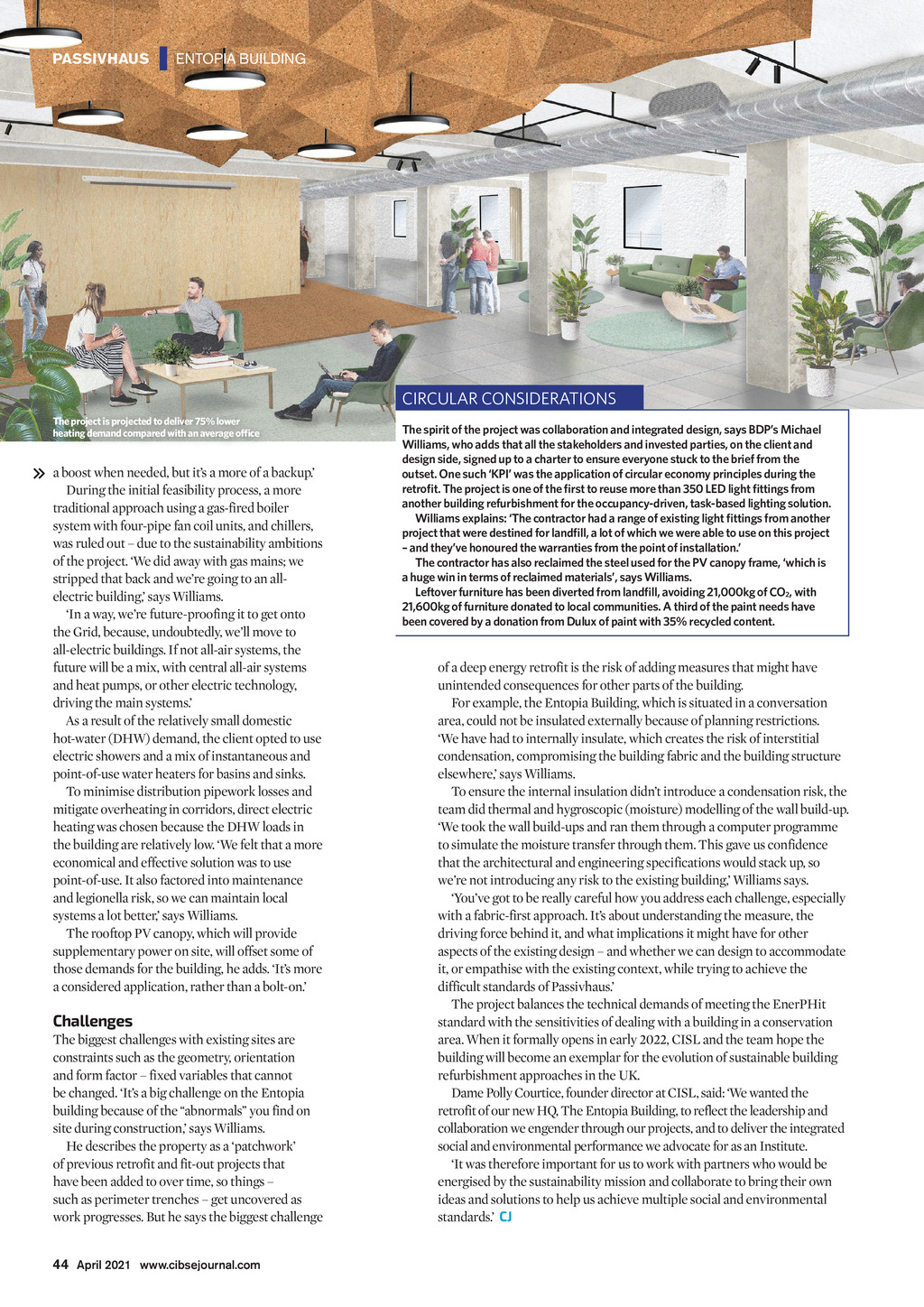 PASSIVHAUS | ENTOPIA BUILDING CIRCULAR CONSIDERATIONS The project is projected to deliver 75% lower heating demand compared with an average office a boost when needed, but its a more of a backup. During the initial feasibility process, a more traditional approach using a gas-fired boiler system with four-pipe fan coil units, and chillers, was ruled out due to the sustainability ambitions of the project. We did away with gas mains; we stripped that back and were going to an allelectric building, says Williams. In a way, were future-proofing it to get onto the Grid, because, undoubtedly, well move to all-electric buildings. If not all-air systems, the future will be a mix, with central all-air systems and heat pumps, or other electric technology, driving the main systems. As a result of the relatively small domestic hot-water (DHW) demand, the client opted to use electric showers and a mix of instantaneous and point-of-use water heaters for basins and sinks. To minimise distribution pipework losses and mitigate overheating in corridors, direct electric heating was chosen because the DHW loads in the building are relatively low. We felt that a more economical and effective solution was to use point-of-use. It also factored into maintenance and legionella risk, so we can maintain local systems a lot better, says Williams. The rooftop PV canopy, which will provide supplementary power on site, will offset some of those demands for the building, he adds. Its more a considered application, rather than a bolt-on. Challenges The biggest challenges with existing sites are constraints such as the geometry, orientation and form factor fixed variables that cannot be changed. Its a big challenge on the Entopia building because of the abnormals you find on site during construction, says Williams. He describes the property as a patchwork of previous retrofit and fit-out projects that have been added to over time, so things such as perimeter trenches get uncovered as work progresses. But he says the biggest challenge 44 April 2021 www.cibsejournal.com The spirit of the project was collaboration and integrated design, says BDPs Michael Williams, who adds that all the stakeholders and invested parties, on the client and design side, signed up to a charter to ensure everyone stuck to the brief from the outset. One such KPI was the application of circular economy principles during the retrofit. The project is one of the first to reuse more than 350 LED light fittings from another building refurbishment for the occupancy-driven, task-based lighting solution. Williams explains: The contractor had a range of existing light fittings from another project that were destined for landfill, a lot of which we were able to use on this project and theyve honoured the warranties from the point of installation. The contractor has also reclaimed the steel used for the PV canopy frame, which is a huge win in terms of reclaimed materials, says Williams. Leftover furniture has been diverted from landfill, avoiding 21,000kg of CO2, with 21,600kg of furniture donated to local communities. A third of the paint needs have been covered by a donation from Dulux of paint with 35% recycled content. of a deep energy retrofit is the risk of adding measures that might have unintended consequences for other parts of the building. For example, the Entopia Building, which is situated in a conversation area, could not be insulated externally because of planning restrictions. We have had to internally insulate, which creates the risk of interstitial condensation, compromising the building fabric and the building structure elsewhere, says Williams. To ensure the internal insulation didnt introduce a condensation risk, the team did thermal and hygroscopic (moisture) modelling of the wall build-up. We took the wall build-ups and ran them through a computer programme to simulate the moisture transfer through them. This gave us confidence that the architectural and engineering specifications would stack up, so were not introducing any risk to the existing building, Williams says. Youve got to be really careful how you address each challenge, especially with a fabric-first approach. Its about understanding the measure, the driving force behind it, and what implications it might have for other aspects of the existing design and whether we can design to accommodate it, or empathise with the existing context, while trying to achieve the difficult standards of Passivhaus. The project balances the technical demands of meeting the EnerPHit standard with the sensitivities of dealing with a building in a conservation area. When it formally opens in early 2022, CISL and the team hope the building will become an exemplar for the evolution of sustainable building refurbishment approaches in the UK. Dame Polly Courtice, founder director at CISL, said: We wanted the retrofit of our new HQ, The Entopia Building, to reflect the leadership and collaboration we engender through our projects, and to deliver the integrated social and environmental performance we advocate for as an Institute. It was therefore important for us to work with partners who would be energised by the sustainability mission and collaborate to bring their own ideas and solutions to help us achieve multiple social and environmental standards. CJ