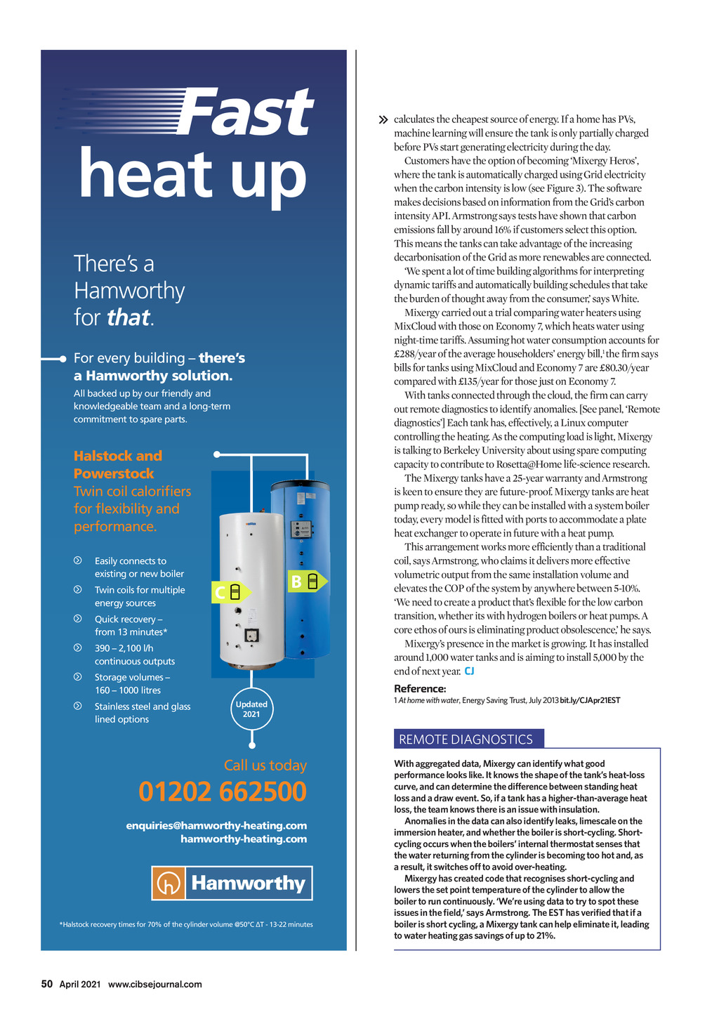 Fast heat up Theres a Hamworthy for that. For every building theres a Hamworthy solution. All backed up by our friendly and knowledgeable team and a long-term commitment to spare parts. Halstock and Powerstock Twin coil calorifiers for flexibility and performance. Easily connects to existing or new boiler Twin coils for multiple energy sources B C Quick recovery from 13 minutes* 390 2,100 l/h continuous outputs Storage volumes 160 1000 litres Stainless steel and glass lined options calculates the cheapest source of energy. If a home has PVs, machine learning will ensure the tank is only partially charged before PVs start generating electricity during the day. Customers have the option of becoming Mixergy Heros, where the tank is automatically charged using Grid electricity when the carbon intensity is low (see Figure 3). The software makes decisions based on information from the Grids carbon intensity API. Armstrong says tests have shown that carbon emissions fall by around 16% if customers select this option. This means the tanks can take advantage of the increasing decarbonisation of the Grid as more renewables are connected. We spent a lot of time building algorithms for interpreting dynamic tariffs and automatically building schedules that take the burden of thought away from the consumer, says White. Mixergy carried out a trial comparing water heaters using MixCloud with those on Economy 7, which heats water using night-time tariffs. Assuming hot water consumption accounts for 288/year of the average householders energy bill,1 the firm says bills for tanks using MixCloud and Economy 7 are 80.30/year compared with 135/year for those just on Economy 7. With tanks connected through the cloud, the firm can carry out remote diagnostics to identify anomalies. [See panel, Remote diagnostics] Each tank has, effectively, a Linux computer controlling the heating. As the computing load is light, Mixergy is talking to Berkeley University about using spare computing capacity to contribute to Rosetta@Home life-science research. The Mixergy tanks have a 25-year warranty and Armstrong is keen to ensure they are future-proof. Mixergy tanks are heat pump ready, so while they can be installed with a system boiler today, every model is fitted with ports to accommodate a plate heat exchanger to operate in future with a heat pump. This arrangement works more efficiently than a traditional coil, says Armstrong, who claims it delivers more effective volumetric output from the same installation volume and elevates the COP of the system by anywhere between 5-10%. We need to create a product thats flexible for the low carbon transition, whether its with hydrogen boilers or heat pumps. A core ethos of ours is eliminating product obsolescence, he says. Mixergys presence in the market is growing. It has installed around 1,000 water tanks and is aiming to install 5,000 by the end of next year. CJ Reference: Updated 2021 1 At home with water, Energy Saving Trust, July 2013 REMOTE DIAGNOSTICS Call us today 01202 662500 enquiries@hamworthy-heating.com hamworthy-heating.com *Halstock recovery times for 70% of the cylinder volume @50C T - 13-22 minutes With aggregated data, Mixergy can identify what good performance looks like. It knows the shape of the tanks heat-loss curve, and can determine the difference between standing heat loss and a draw event. So, if a tank has a higher-than-average heat loss, the team knows there is an issue with insulation. Anomalies in the data can also identify leaks, limescale on the immersion heater, and whether the boiler is short-cycling. Shortcycling occurs when the boilers internal thermostat senses that the water returning from the cylinder is becoming too hot and, as a result, it switches off to avoid over-heating. Mixergy has created code that recognises short-cycling and lowers the set point temperature of the cylinder to allow the boiler to run continuously. Were using data to try to spot these boiler is short cycling, a Mixergy tank can help eliminate it, leading to water heating gas savings of up to 21%. 50 April 2021 www.cibsejournal.com CIBSE April 21 pp48-50 Mixergy smart water tank.indd 50 26/03/2021 14:52