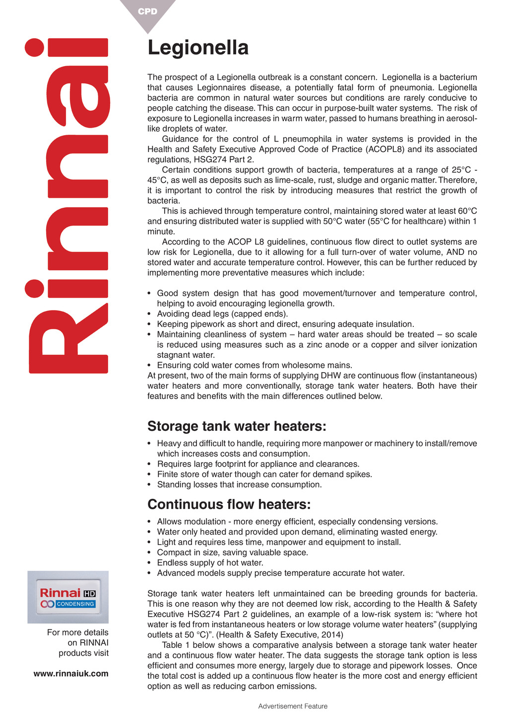 CPD Legionella The prospect of a Legionella outbreak is a constant concern. Legionella is a bacterium that causes Legionnaires disease, a potentially fatal form of pneumonia. Legionella bacteria are common in natural water sources but conditions are rarely conducive to people catching the disease. This can occur in purpose-built water systems. The risk of exposure to Legionella increases in warm water, passed to humans breathing in aerosollike droplets of water. Guidance for the control of L pneumophila in water systems is provided in the Health and Safety Executive Approved Code of Practice (ACOPL8) and its associated regulations, HSG274 Part 2. Certain conditions support growth of bacteria, temperatures at a range of 25C 45C, as well as deposits such as lime-scale, rust, sludge and organic matter. Therefore, it is important to control the risk by introducing measures that restrict the growth of bacteria. This is achieved through temperature control, maintaining stored water at least 60C and ensuring distributed water is supplied with 50C water (55C for healthcare) within 1 minute. According to the ACOP L8 guidelines, continuous ow direct to outlet systems are low risk for Legionella, due to it allowing for a full turn-over of water volume, AND no stored water and accurate temperature control. However, this can be further reduced by implementing more preventative measures which include: s OOD SYSTEM DESIGN THAT HAS GOOD MOVEMENTTURNOVER AND TEMPERATURE CONTROL helping to avoid encouraging legionella growth. s !VOIDING DEAD LEGS CAPPED ENDS s +EEPING PIPEWORK AS SHORT AND DIRECT ENSURING ADEQUATE INSULATION s -AINTAINING CLEANLINESS OF SYSTEM n HARD WATER AREAS SHOULD BE TREATED n SO SCALE is reduced using measures such as a zinc anode or a copper and silver ionization stagnant water. s %NSURING COLD WATER COMES FROM WHOLESOME MAINS At present, two of the main forms of supplying DHW are continuous ow (instantaneous) water heaters and more conventionally, storage tank water heaters. Both have their features and benets with the main differences outlined below. Storage tank water heaters: s (EAVY AND DIFlCULT TO HANDLE REQUIRING MORE MANPOWER OR MACHINERY TO INSTALLREMOVE which increases costs and consumption. s 2EQUIRES LARGE FOOTPRINT FOR APPLIANCE AND CLEARANCES s &INITE STORE OF WATER THOUGH CAN CATER FOR DEMAND SPIKES s 3TANDING LOSSES THAT INCREASE CONSUMPTION Continuous ow heaters: s s s s s s For more details on RINNAI products visit www.rinnaiuk.com !LLOWS MODULATION MORE ENERGY EFlCIENT ESPECIALLY CONDENSING VERSIONS 7ATER ONLY HEATED AND PROVIDED UPON DEMAND ELIMINATING WASTED ENERGY ,IGHT AND REQUIRES LESS TIME MANPOWER AND EQUIPMENT TO INSTALL #OMPACT IN SIZE SAVING VALUABLE SPACE %NDLESS SUPPLY OF HOT WATER !DVANCED MODELS SUPPLY PRECISE TEMPERATURE ACCURATE HOT WATER Storage tank water heaters left unmaintained can be breeding grounds for bacteria. This is one reason why they are not deemed low risk, according to the Health & Safety Executive HSG274 Part 2 guidelines, an example of a low-risk system is: where hot water is fed from instantaneous heaters or low storage volume water heaters (supplying outlets at 50 C). (Health & Safety Executive, 2014) Table 1 below shows a comparative analysis between a storage tank water heater and a continuous ow water heater. The data suggests the storage tank option is less efcient and consumes more energy, largely due to storage and pipework losses. Once the total cost is added up a continuous ow heater is the more cost and energy efcient option as well as reducing carbon emissions. 52 April 2021 www.cibsejournal.com Advertisement Feature p51-54.CIBSEMagApr21.indd 52 23/03/2021 12:07