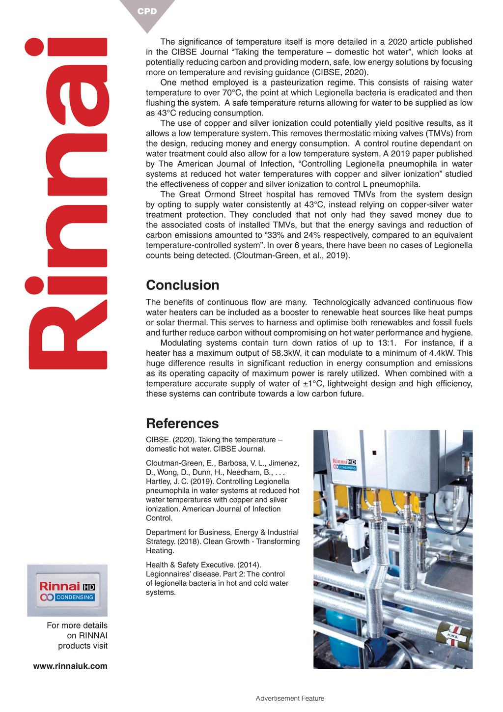 CPD The signicance of temperature itself is more detailed in a 2020 article published IN THE #) 3% *OURNAL h4AKING THE TEMPERATURE n DOMESTIC HOT WATERv WHICH LOOKS AT potentially reducing carbon and providing modern, safe, low energy solutions by focusing more on temperature and revising guidance (CIBSE, 2020). One method employed is a pasteurization regime. This consists of raising water temperature to over 70C, the point at which Legionella bacteria is eradicated and then ushing the system. A safe temperature returns allowing for water to be supplied as low AS # REDUCING CONSUMPTION The use of copper and silver ionization could potentially yield positive results, as it ALLOWS A LOW TEMPERATURE SYSTEM 4HIS REMOVES THERMOSTATIC MIXING VALVES 4-6S FROM the design, reducing money and energy consumption. A control routine dependant on water treatment could also allow for a low temperature system. A 2019 paper published by The American Journal of Infection, Controlling Legionella pneumophila in water systems at reduced hot water temperatures with copper and silver ionization studied the effectiveness of copper and silver ionization to control L pneumophila. 4HE REAT /RMOND 3TREET HOSPITAL HAS REMOVED 4-6S FROM THE SYSTEM DESIGN BY OPTING TO SUPPLY WATER CONSISTENTLY AT # INSTEAD RELYING ON COPPER SILVER WATER treatment protection. They concluded that not only had they saved money due to THE ASSOCIATED COSTS OF INSTALLED 4-6S BUT THAT THE ENERGY SAVINGS AND REDUCTION OF CARBON EMISSIONS AMOUNTED TO h AND RESPECTIVELY COMPARED TO AN EQUIVALENT temperature-controlled system. In over 6 years, there have been no cases of Legionella counts being detected. (Cloutman-Green, et al., 2019). Conclusion The benets of continuous ow are many. Technologically advanced continuous ow water heaters can be included as a booster to renewable heat sources like heat pumps or solar thermal. This serves to harness and optimise both renewables and fossil fuels and further reduce carbon without compromising on hot water performance and hygiene. -ODULATING SYSTEMS CONTAIN TURN DOWN RATIOS OF UP TO &OR INSTANCE IF A HEATER HAS A MAXIMUM OUTPUT OF K7 IT CAN MODULATE TO A MINIMUM OF K7 4HIS huge difference results in signicant reduction in energy consumption and emissions as its operating capacity of maximum power is rarely utilized. When combined with a temperature accurate supply of water of 1C, lightweight design and high efciency, these systems can contribute towards a low carbon future. References #) 3% 4AKING THE TEMPERATURE n domestic hot water. CIBSE Journal. #LOUTMAN REEN % ARBOSA 6 , *IMENEZ D., Wong, D., Dunn, H., Needham, B., . . . Hartley, J. C. (2019). Controlling Legionella pneumophila in water systems at reduced hot water temperatures with copper and silver ionization. American Journal of Infection Control. Department for Business, Energy & Industrial Strategy. (2018). Clean Growth - Transforming Heating. Health & Safety Executive. (2014). Legionnaires disease. Part 2: The control of legionella bacteria in hot and cold water systems. For more details on RINNAI products visit www.rinnaiuk.com 54 April 2021 www.cibsejournal.com Advertisement Feature p51-54.CIBSEMagApr21.indd 54 23/03/2021 12:07