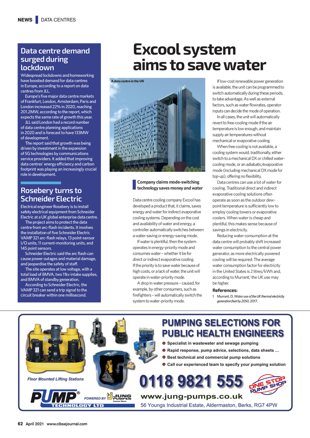NEWS | DATA CENTRES Data centre demand surged during lockdown Widespread lockdowns and homeworking have boosted demand for data centres in Europe, according to a report on data centres from JLL. Excool system aims to save water A data centre in the UK of Frankfurt, London, Amsterdam, Paris and London increased 22% in 2020, reaching 201.2MW, according to the report, which expects the same rate of growth this year. JLL said London had a record number of data centre planning applications in 2020 and is forecast to have 133MW of development. The report said that growth was being driven by investment in the expansion of 5G technologies by communications service providers. It added that improving inputs can decide the mode of operation. In all cases, the unit will automatically revert to free-cooling mode if the air temperature is low enough, and maintain supply air temperatures without mechanical or evaporative cooling. When free cooling is not available, a cooling system would, traditionally, either switch to a mechanical DX or chilled watercooling mode, or an adiabatic/evaporative mode (including mechanical DX mode for footprint was playing an increasingly crucial role in development. Rosebery turns to Schneider Electric Electrical engineer Rosebery is to install safety electrical equipment from Schneider Electric at a UK global enterprise data centre. I/O units, 11 current-monitoring units, and 145 point sensors. cause power outages and material damage, The site operates at low voltage, with a total load of 8MVA, two 11kv intake supplies, and 8MVA of standby generation. According to Schneider Electric, the VAMP 321 can send a trip signal to the circuit breaker within one millisecond. If low-cost renewable power generation is available, the unit can be programmed to switch automatically during these periods, to take advantage. As well as external Company claims mode-switching technology saves money and water Data centres can use a lot of water for cooling. Traditional direct and indirect evaporative cooling solutions often operate as soon as the outdoor dew- Data centre cooling company Excool has developed a product that, it claims, saves energy and water for indirect evaporative cooling systems. Depending on the cost and availability of water and energy, a controller automatically switches between a water-saving or energy-saving mode. If water is plentiful, then the system operates in energy-priority mode and consumes water whether it be for direct or indirect evaporative cooling. If the priority is to save water because of high costs, or a lack of water, the unit will operate in water-priority mode. A drop in water pressure caused, for example, by other consumers, such as References: system to water-priority mode. 1 Murrant, D, Water use of the UK thermal electricity , 2017. employ cooling towers or evaporative coolers. When water is cheap and plentiful, this makes sense because of savings in electricity. Reducing water consumption at the data centre will probably shift increased water consumption to the central power generator, as more electrically powered cooling will be required. The average water consumption factor for electricity in the United States is 2 litres/kWh and, according to Murrant,1 the UK use may be higher. 62 April 2021 www.cibsejournal.com CIBSE April 21 pp62 Data Centre News.indd 62 26/03/2021 14:45