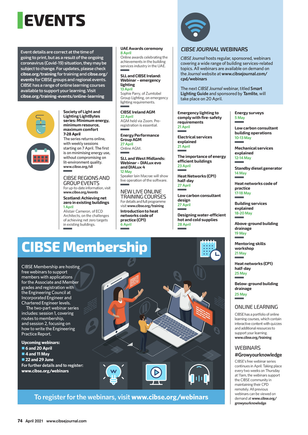 EVENTS Event details are correct at the time of going to print, but as a result of the ongoing coronavirus (Covid-19) situation, they may be subject to change. For updates, please check cibse.org/training for training and cibse.org/ events for CIBSE groups and regional events. CIBSE has a range of online learning courses available to support your learning. Visit cibse.org/training-events/online-learning Society of Light and Lighting LightBytes series: Minimum energy, minimum resource, maximum comfort 7-28 April The series returns online, with weekly sessions starting on is on minimising energy use, without compromising on lit-environment quality. www.cibse.org/sll CIBSE REGIONS AND GROUP EVENTS For up-to-date information, visit www.cibse.org/events Scotland: Achieving net zero in existing buildings 1 April Alistair Cameron, of ECD Architects, on the challenges of achieving net zero targets in existing buildings. UAE Awards ceremony 8 April Online awards celebrating the achievements in the building services industry in the UAE. SLL and CIBSE Ireland: Webinar emergency lighting 13 April Sophie Parry, of Zumtobel Group Lighting, on emergency lighting requirements. CIBSE Ireland AGM 22 April AGM held via Zoom. Preregistration is essential. Energy Performance Group AGM 27 April Online AGM. SLL and West Midlands: Webinar DIALux evo and DIALux 4 12 May Speaker Iain Macrae will show live operation of the software. CIBSE JOURNAL WEBINARS CIBSE Journal hosts regular, sponsored, webinars covering a wide range of building services-related topics. All webinars are available on demand on the Journal website at www.cibsejournal.com/ cpd/webinars The next CIBSE Journal webinar, titled Smart Lighting Guide and sponsored by Tamlite, will take place on 20 April. Emergency lighting to comply with fire-safety requirements 21 April Electrical services explained 21 April The importance of energy efficient buildings 23 April Heat Networks (CP1) half-day 27 April NEW LIVE ONLINE TRAINING COURSES For details and full programme visit www.cibse.org/training Introduction to heat networks code of practice (CP1) 6 April Low carbon consultant design 27 April Designing water-efficient hot and cold supplies 28 April Energy surveys 5 May Low carbon consultant building operations 10-13 May Mechanical services explained 12-14 May Standby diesel generator 14 May Heat networks code of practice 17-18 May Building services explained 18-20 May Above-ground building drainage 19 May CIBSE Membership CIBSE Membership are hosting free webinars to support members with applications for the Associate and Member grades and registration with the Engineering Council at Incorporated Engineer and Chartered Engineer levels. The two-part webinar series includes: session 1, covering routes to membership, and session 2, focusing on how to write the Engineering Practice Report. Upcoming webinars: 6 and 20 April 4 and 11 May 22 and 29 June For further details and to register: www.cibse.org/webinars To register for the webinars, visit www.cibse.org/webinars Mentoring skills workshop 21 May Heat networks (CP1) half-day 25 May Below-ground building drainage 25 May ONLINE LEARNING CIBSE has a portfolio of online learning courses, which contain interactive content with quizzes and additional resources to support your learning. www.cibse.org/training WEBINARS #Growyourknowledge CIBSEs free webinar series continues in April. Taking place every two weeks on Thursday at 11am, the webinars support the CIBSE community in maintaining their CPD remotely. All previous webinars can be viewed on demand at www.cibse.org/ growyourknowledge 74 April 2021 www.cibsejournal.com CIBSE April 21 pp74 Events.indd 74 26/03/2021 14:51