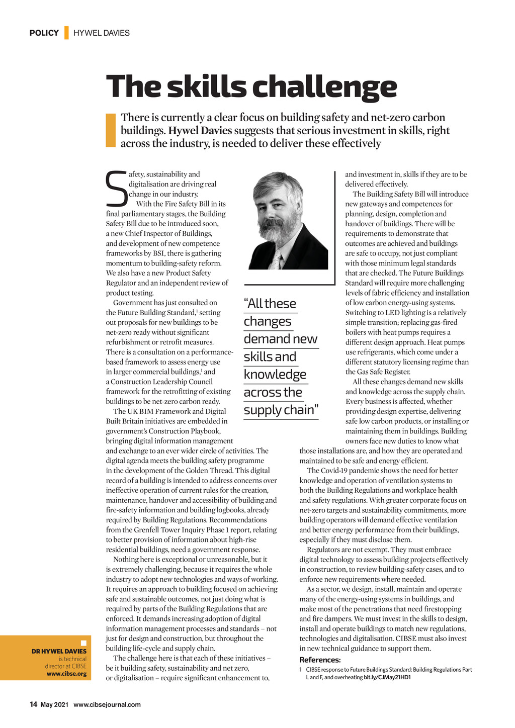 POLICY | HYWEL DAVIES The skills challenge There is currently a clear focus on building safety and net-zero carbon buildings. Hywel Davies suggests that serious investment in skills, right across the industry, is needed to deliver these effectively S afety, sustainability and digitalisation are driving real change in our industry. With the Fire Safety Bill in its final parliamentary stages, the Building Safety Bill due to be introduced soon, a new Chief Inspector of Buildings, and development of new competence frameworks by BSI, there is gathering momentum to building-safety reform. We also have a new Product Safety Regulator and an independent review of product testing. Government has just consulted on the Future Building Standard,1 setting out proposals for new buildings to be net-zero ready without significant refurbishment or retrofit measures. There is a consultation on a performancebased framework to assess energy use in larger commercial buildings,1 and a Construction Leadership Council framework for the retrofitting of existing buildings to be net-zero carbon ready. The UK BIM Framework and Digital Built Britain initiatives are embedded in governments Construction Playbook, bringing digital information management and exchange to an ever wider circle of activities. The digital agenda meets the building safety programme in the development of the Golden Thread. This digital record of a building is intended to address concerns over ineffective operation of current rules for the creation, maintenance, handover and accessibility of building and fire-safety information and building logbooks, already required by Building Regulations. Recommendations from the Grenfell Tower Inquiry Phase 1 report, relating to better provision of information about high-rise residential buildings, need a government response. Nothing here is exceptional or unreasonable, but it is extremely challenging, because it requires the whole industry to adopt new technologies and ways of working. It requires an approach to building focused on achieving safe and sustainable outcomes, not just doing what is required by parts of the Building Regulations that are enforced. It demands increasing adoption of digital information management processes and standards not just for design and construction, but throughout the building life-cycle and supply chain. The challenge here is that each of these initiatives be it building safety, sustainability and net zero, or digitalisation require significant enhancement to, and investment in, skills if they are to be delivered effectively. The Building Safety Bill will introduce new gateways and competences for planning, design, completion and handover of buildings. There will be requirements to demonstrate that outcomes are achieved and buildings are safe to occupy, not just compliant with those minimum legal standards that are checked. The Future Buildings Standard will require more challenging levels of fabric efficiency and installation of low carbon energy-using systems. Switching to LED lighting is a relatively simple transition; replacing gas-fired boilers with heat pumps requires a different design approach. Heat pumps use refrigerants, which come under a different statutory licensing regime than the Gas Safe Register. All these changes demand new skills and knowledge across the supply chain. Every business is affected, whether providing design expertise, delivering safe low carbon products, or installing or maintaining them in buildings. Building owners face new duties to know what those installations are, and how they are operated and maintained to be safe and energy efficient. The Covid-19 pandemic shows the need for better knowledge and operation of ventilation systems to both the Building Regulations and workplace health and safety regulations. With greater corporate focus on net-zero targets and sustainability commitments, more building operators will demand effective ventilation and better energy performance from their buildings, especially if they must disclose them. Regulators are not exempt. They must embrace digital technology to assess building projects effectively in construction, to review building-safety cases, and to enforce new requirements where needed. As a sector, we design, install, maintain and operate many of the energy-using systems in buildings, and make most of the penetrations that need firestopping and fire dampers. We must invest in the skills to design, install and operate buildings to match new regulations, technologies and digitalisation. CIBSE must also invest in new technical guidance to support them. References: All these changes demand new skills and knowledge across the supply chain DR HYWEL DAVIES is technical director at CIBSE www.cibse.org 1 CIBSE response to Future Buildings Standard: Building Regulations Part L and F, and overheating bit.ly/CJMay21HD1 14 May 2021 www.cibsejournal.com CIBSE May 21 pp14 Hywel.indd 14 23/04/2021 15:47