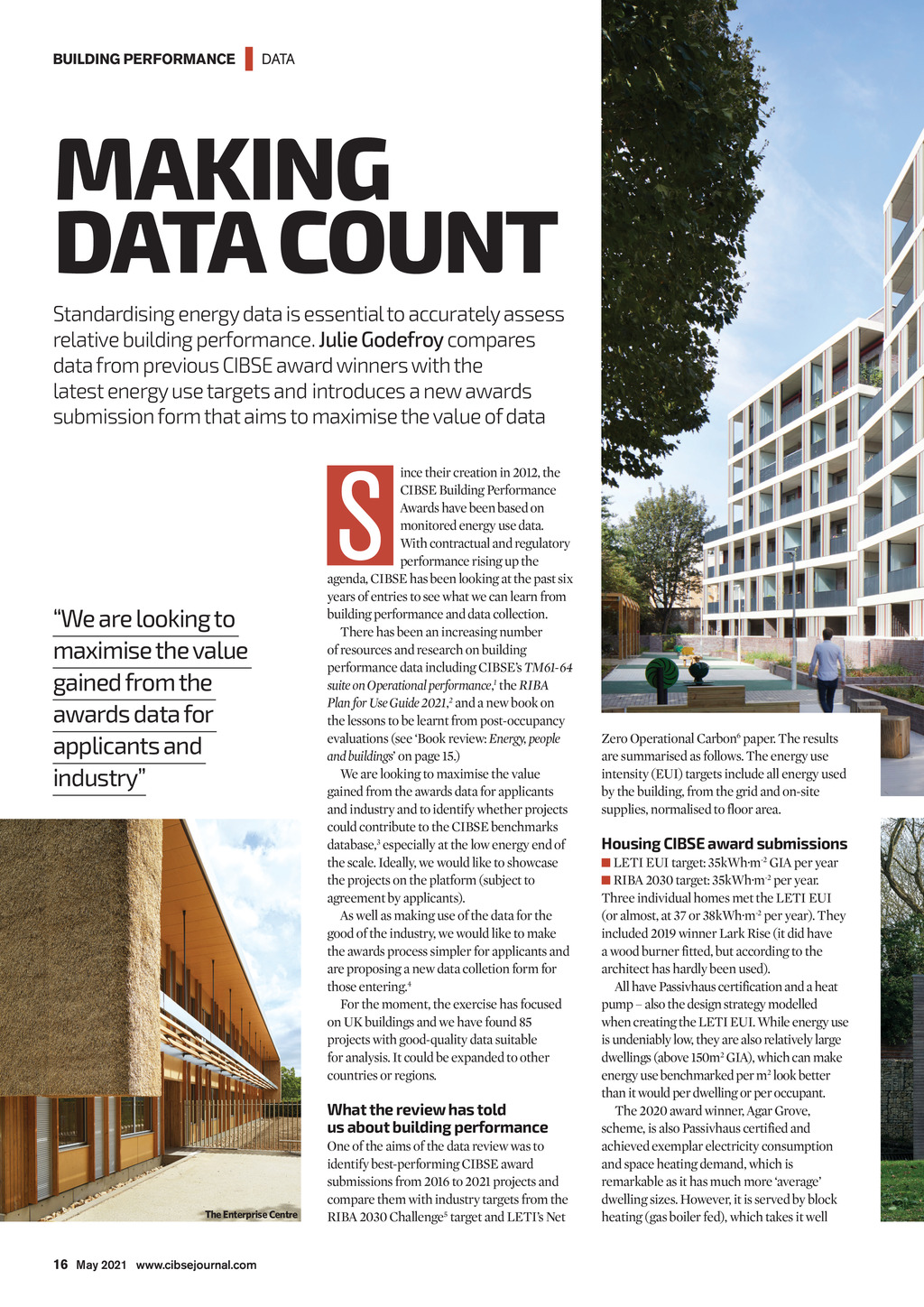BUILDING PERFORMANCE | DATA MAKING DATA COUNT Standardising energy data is essential to accurately assess relative building performance. Julie Godefroy compares data from previous CIBSE award winners with the latest energy use targets and introduces a new awards submission form that aims to maximise the value of data S We are looking to maximise the value gained from the awards data for applicants and industry ince their creation in 2012, the CIBSE Building Performance Awards have been based on monitored energy use data. With contractual and regulatory performance rising up the agenda, CIBSE has been looking at the past six years of entries to see what we can learn from building performance and data collection. There has been an increasing number of resources and research on building performance data including CIBSEs TM61-64 suite on Operational performance,1 the RIBA Plan for Use Guide 2021,2 and a new book on the lessons to be learnt from post-occupancy evaluations (see Book review: Energy, people and buildings on page 15.) We are looking to maximise the value gained from the awards data for applicants and industry and to identify whether projects could contribute to the CIBSE benchmarks database,3 especially at the low energy end of the scale. Ideally, we would like to showcase the projects on the platform (subject to agreement by applicants). As well as making use of the data for the good of the industry, we would like to make the awards process simpler for applicants and are proposing a new data colletion form for those entering.4 For the moment, the exercise has focused on UK buildings and we have found 85 projects with good-quality data suitable for analysis. It could be expanded to other countries or regions. What the review has told us about building performance The Enterprise Centre One of the aims of the data review was to identify best-performing CIBSE award submissions from 2016 to 2021 projects and compare them with industry targets from the RIBA 2030 Challenge5 target and LETIs Net Zero Operational Carbon6 paper. The results are summarised as follows. The energy use intensity (EUI) targets include all energy used by the building, from the grid and on-site supplies, normalised to floor area. Housing CIBSE award submissions LETI EUI target: 35kWhm-2 GIA per year RIBA 2030 target: 35kWhm-2 per year. Three individual homes met the LETI EUI (or almost, at 37 or 38kWhm-2 per year). They included 2019 winner Lark Rise (it did have a wood burner fitted, but according to the architect has hardly been used). All have Passivhaus certification and a heat pump also the design strategy modelled when creating the LETI EUI. While energy use is undeniably low, they are also relatively large dwellings (above 150m2 GIA), which can make energy use benchmarked per m2 look better than it would per dwelling or per occupant. The 2020 award winner, Agar Grove, scheme, is also Passivhaus certified and achieved exemplar electricity consumption and space heating demand, which is remarkable as it has much more average dwelling sizes. However, it is served by block heating (gas boiler fed), which takes it well 16 May 2021 www.cibsejournal.com CIBSE May 21 pp16-18 Performance data.indd 16 23/04/2021 15:52