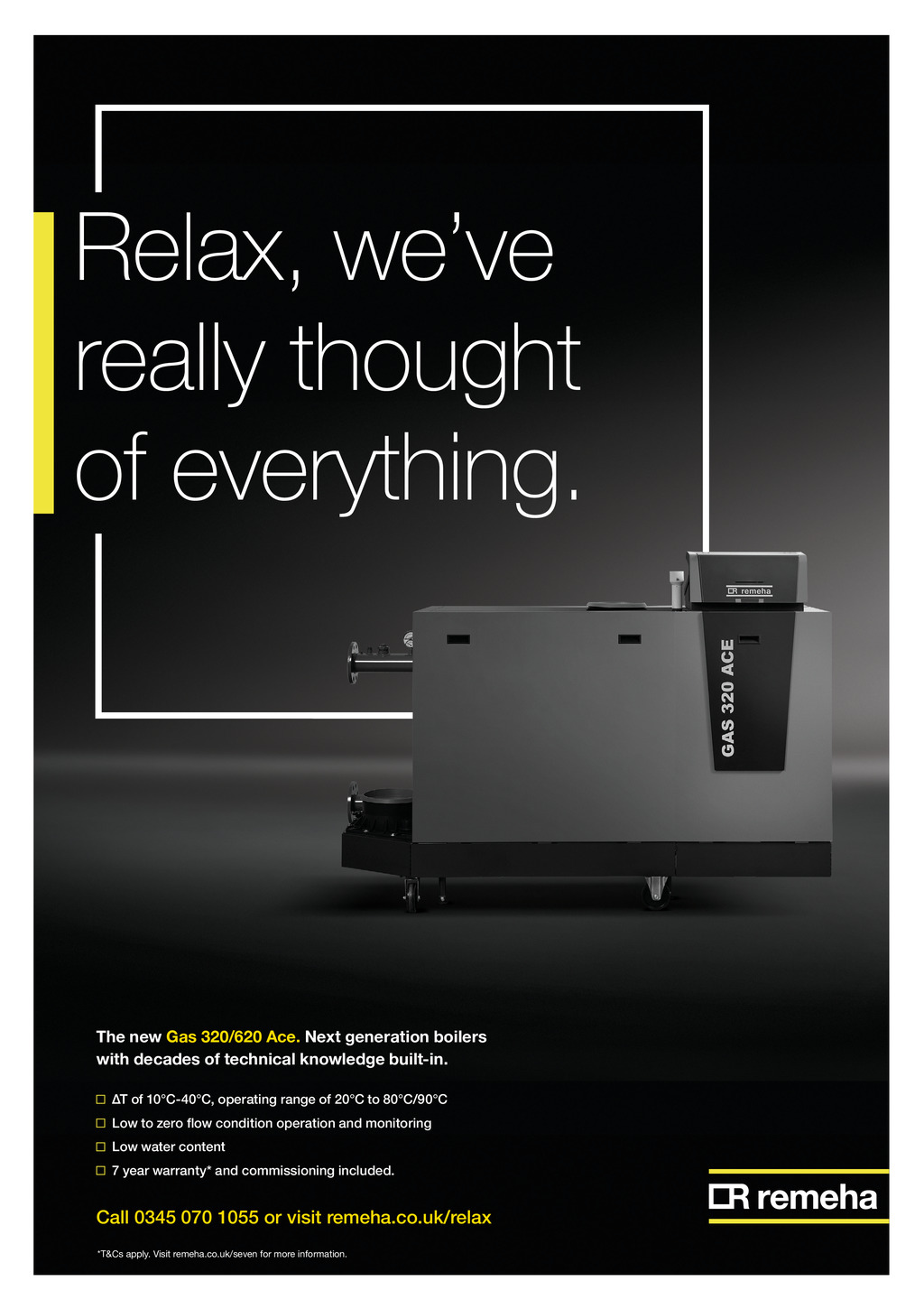 Relax, weve really thought of everything. The new Gas 320/620 Ace. Next generation boilers with decades of technical knowledge built-in. 7RI&&RSHUDWLQJUDQJHRI&WR&& /RZWR]HURRZFRQGLWLRQRSHUDWLRQDQGPRQLWRULQJ /RZZDWHUFRQWHQW \HDUZDUUDQW\ DQGFRPPLVVLRQLQJLQFOXGHG &DOORUYLVLWUHPHKDFRXNUHOD[ *T&Cs apply. Visit remeha.co.uk/seven for more information. 30 May 2021 www.cibsejournal.com p30.CIBSEMagMay21.indd 30 20/04/2021 15:52