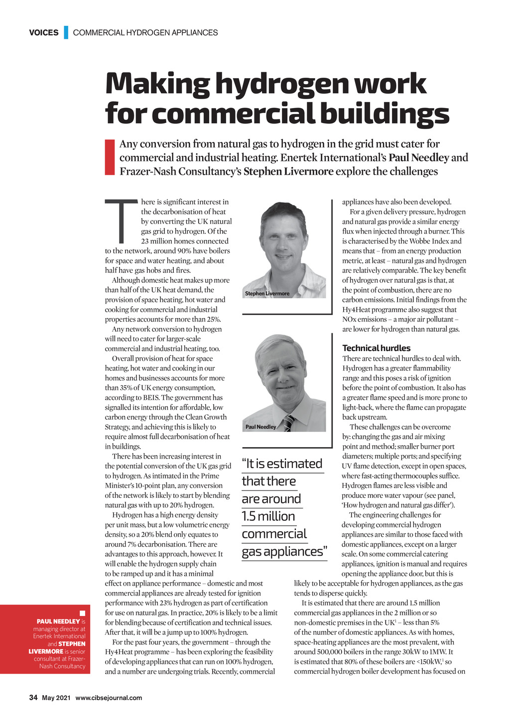 VOICES | COMMERCIAL HYDROGEN APPLIANCES Making hydrogen work for commercial buildings Any conversion from natural gas to hydrogen in the grid must cater for commercial and industrial heating. Enertek Internationals Paul Needley and Frazer-Nash Consultancys Stephen Livermore explore the challenges T here is significant interest in the decarbonisation of heat by converting the UK natural gas grid to hydrogen. Of the 23 million homes connected to the network, around 90% have boilers for space and water heating, and about half have gas hobs and fires. Although domestic heat makes up more than half of the UK heat demand, the Stephen Livermore provision of space heating, hot water and cooking for commercial and industrial properties accounts for more than 25%. Any network conversion to hydrogen will need to cater for larger-scale commercial and industrial heating, too. Overall provision of heat for space heating, hot water and cooking in our homes and businesses accounts for more than 35% of UK energy consumption, according to BEIS. The government has signalled its intention for affordable, low carbon energy through the Clean Growth Paul Needley Strategy, and achieving this is likely to require almost full decarbonisation of heat in buildings. There has been increasing interest in the potential conversion of the UK gas grid to hydrogen. As intimated in the Prime Ministers 10-point plan, any conversion of the network is likely to start by blending natural gas with up to 20% hydrogen. Hydrogen has a high energy density per unit mass, but a low volumetric energy density, so a 20% blend only equates to around 7% decarbonisation. There are advantages to this approach, however. It will enable the hydrogen supply chain to be ramped up and it has a minimal effect on appliance performance domestic and most commercial appliances are already tested for ignition performance with 23% hydrogen as part of certification for use on natural gas. In practice, 20% is likely to be a limit for blending because of certification and technical issues. After that, it will be a jump up to 100% hydrogen. For the past four years, the government through the Hy4Heat programme has been exploring the feasibility of developing appliances that can run on 100% hydrogen, and a number are undergoing trials. Recently, commercial appliances have also been developed. For a given delivery pressure, hydrogen and natural gas provide a similar energy flux when injected through a burner. This is characterised by the Wobbe Index and means that from an energy production metric, at least natural gas and hydrogen are relatively comparable. The key benefit of hydrogen over natural gas is that, at the point of combustion, there are no carbon emissions. Initial findings from the Hy4Heat programme also suggest that NOx emissions a major air pollutant are lower for hydrogen than natural gas. Technical hurdles There are technical hurdles to deal with. Hydrogen has a greater flammability range and this poses a risk of ignition before the point of combustion. It also has a greater flame speed and is more prone to light-back, where the flame can propagate back upstream. These challenges can be overcome by: changing the gas and air mixing point and method; smaller burner port diameters; multiple ports; and specifying UV flame detection, except in open spaces, where fast-acting thermocouples suffice. Hydrogen flames are less visible and produce more water vapour (see panel, How hydrogen and natural gas differ). The engineering challenges for developing commercial hydrogen appliances are similar to those faced with domestic appliances, except on a larger scale. On some commercial catering appliances, ignition is manual and requires opening the appliance door, but this is likely to be acceptable for hydrogen appliances, as the gas tends to disperse quickly. It is estimated that there are around 1.5 million commercial gas appliances in the 2 million or so non-domestic premises in the UK1 less than 5% of the number of domestic appliances. As with homes, space-heating appliances are the most prevalent, with around 500,000 boilers in the range 30kW to 1MW. It is estimated that 80% of these boilers are <150kW,1 so commercial hydrogen boiler development has focused on It is estimated that there are around 1.5 million commercial gas appliances PAUL NEEDLEY is managing director at Enertek International and STEPHEN LIVERMORE is senior consultant at FrazerNash Consultancy 34 May 2021 www.cibsejournal.com CIBSE May 21 pp34-35 Hydrogen appliances Supp.indd 34 23/04/2021 16:25
