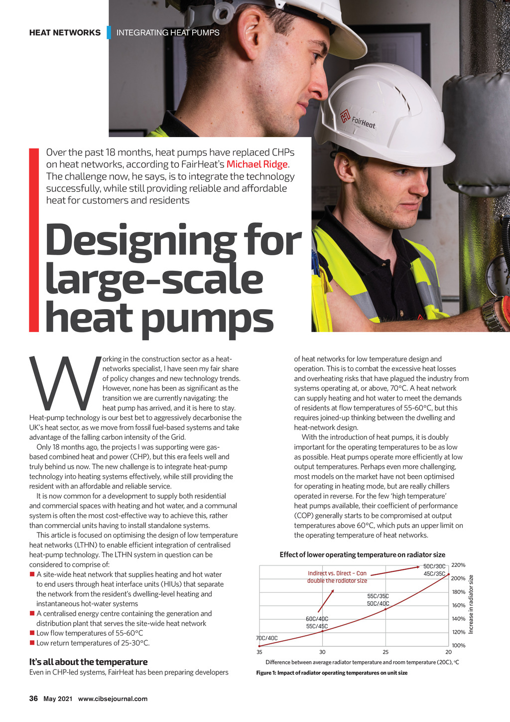 HEAT NETWORKS | INTEGRATING HEAT PUMPS Over the past 18 months, heat pumps have replaced CHPs on heat networks, according to FairHeats Michael Ridge. The challenge now, he says, is to integrate the technology successfully, while still providing reliable and affordable heat for customers and residents Designing for large-scale heat pumps W orking in the construction sector as a heatnetworks specialist, I have seen my fair share of policy changes and new technology trends. of heat networks for low temperature design and operation. This is to combat the excessive heat losses and overheating risks that have plagued the industry from transition we are currently navigating: the heat pump has arrived, and it is here to stay. Heat-pump technology is our best bet to aggressively decarbonise the UKs heat sector, as we move from fossil fuel-based systems and take advantage of the falling carbon intensity of the Grid. Only 18 months ago, the projects I was supporting were gasbased combined heat and power (CHP), but this era feels well and truly behind us now. The new challenge is to integrate heat-pump technology into heating systems effectively, while still providing the resident with an affordable and reliable service. It is now common for a development to supply both residential and commercial spaces with heating and hot water, and a communal system is often the most cost-effective way to achieve this, rather than commercial units having to install standalone systems. This article is focused on optimising the design of low temperature can supply heating and hot water to meet the demands requires joined-up thinking between the dwelling and heat-network design. With the introduction of heat pumps, it is doubly important for the operating temperatures to be as low output temperatures. Perhaps even more challenging, most models on the market have not been optimised for operating in heating mode, but are really chillers operated in reverse. For the few high temperature (COP) generally starts to be compromised at output the operating temperature of heat networks. Effect of lower operating temperature on radiator size heat-pump technology. The LTHN system in question can be considered to comprise of: A site-wide heat network that supplies heating and hot water to end users through heat interface units (HIUs) that separate the network from the residents dwelling-level heating and instantaneous hot-water systems A centralised energy centre containing the generation and distribution plant that serves the site-wide heat network 200% 180% 160% 140% 120% 35 Its all about the temperature Even in CHP-led systems, FairHeat has been preparing developers 30 25 20 Increase in radiator size 220% 100% Difference between average radiator temperature and room temperature (20C), oC Figure 1: Impact of radiator operating temperatures on unit size 36 May 2021 www.cibsejournal.com CIBSE May 21 pp36-38 CHP to Heat Pumps.indd 36 23/04/2021 18:09