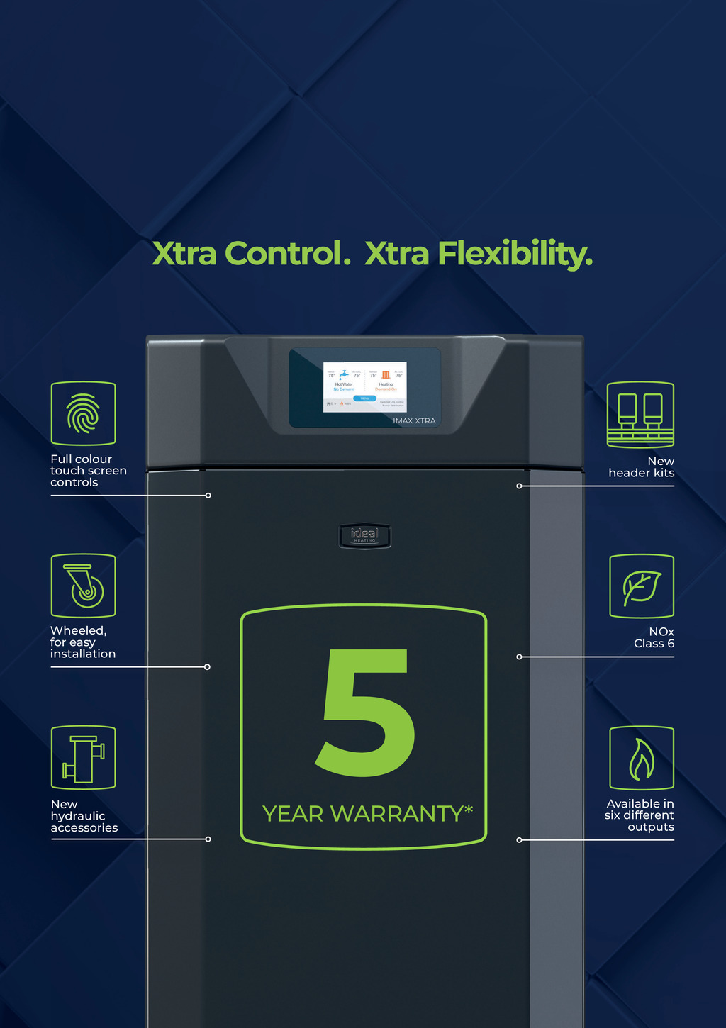 Xtra Control. Xtra Flexibility. Full colour touch screen controls Wheeled, for easy installation New hydraulic accessories New header kits 5 YEAR WARRANTY* NOx Class 6 Available in six different outputs 50 May 2021 www.cibsejournal.com p50-51.CIBSEMagMay21.indd 50 20/04/2021 15:55