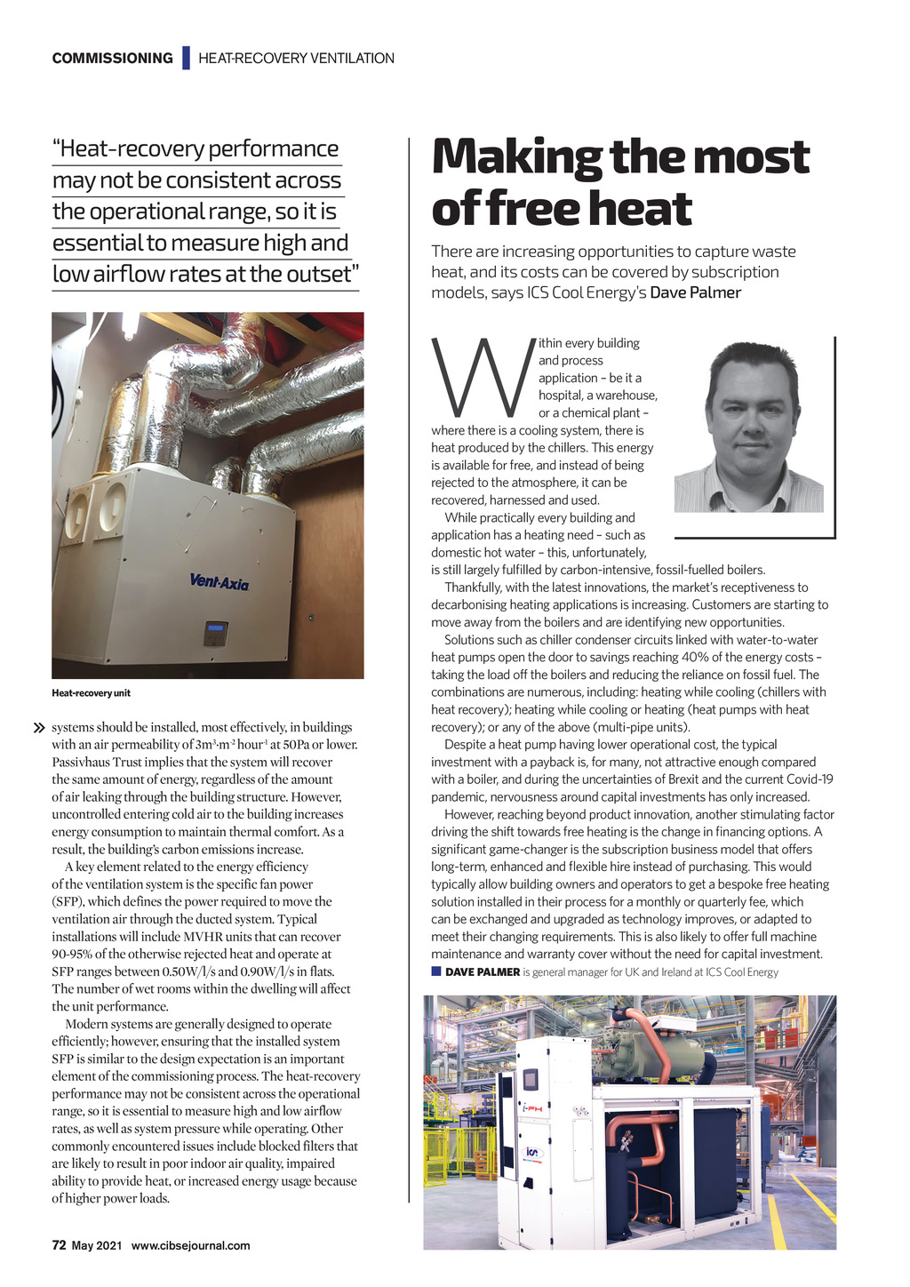 COMMISSIONING | HEAT-RECOVERY VENTILATION Heat-recovery performance may not be consistent across the operational range, so it is essential to measure high and low airflow rates at the outset Making the most of free heat There are increasing opportunities to capture waste heat, and its costs can be covered by subscription models, says ICS Cool Energys Dave Palmer W ithin every building and process application be it a hospital, a warehouse, or a chemical plant where there is a cooling system, there is heat produced by the chillers. This energy is available for free, and instead of being rejected to the atmosphere, it can be recovered, harnessed and used. While practically every building and application has a heating need such as domestic hot water this, unfortunately, Thankfully, with the latest innovations, the markets receptiveness to decarbonising heating applications is increasing. Customers are starting to move away from the boilers and are identifying new opportunities. Heat-recovery unit systems should be installed, most effectively, in buildings with an air permeability of 3m3.m-2 hour-1 at 50Pa or lower. Passivhaus Trust implies that the system will recover the same amount of energy, regardless of the amount of air leaking through the building structure. However, uncontrolled entering cold air to the building increases energy consumption to maintain thermal comfort. As a result, the buildings carbon emissions increase. A key element related to the energy efficiency of the ventilation system is the specific fan power (SFP), which defines the power required to move the ventilation air through the ducted system. Typical installations will include MVHR units that can recover 90-95% of the otherwise rejected heat and operate at SFP ranges between 0.50W/l/s and 0.90W/l/s in flats. The number of wet rooms within the dwelling will affect the unit performance. Modern systems are generally designed to operate efficiently; however, ensuring that the installed system SFP is similar to the design expectation is an important element of the commissioning process. The heat-recovery performance may not be consistent across the operational range, so it is essential to measure high and low airflow rates, as well as system pressure while operating. Other commonly encountered issues include blocked filters that are likely to result in poor indoor air quality, impaired ability to provide heat, or increased energy usage because of higher power loads. heat pumps open the door to savings reaching 40% of the energy costs taking the load off the boilers and reducing the reliance on fossil fuel. The combinations are numerous, including: heating while cooling (chillers with heat recovery); heating while cooling or heating (heat pumps with heat Despite a heat pump having lower operational cost, the typical investment with a payback is, for many, not attractive enough compared pandemic, nervousness around capital investments has only increased. However, reaching beyond product innovation, another stimulating factor typically allow building owners and operators to get a bespoke free heating solution installed in their process for a monthly or quarterly fee, which can be exchanged and upgraded as technology improves, or adapted to meet their changing requirements. This is also likely to offer full machine maintenance and warranty cover without the need for capital investment. DAVE PALMER is general manager for UK and Ireland at ICS Cool Energy 72 May 2021 www.cibsejournal.com CIBSE May 21 pp71-72 Heat Recovery.indd 72 23/04/2021 16:15