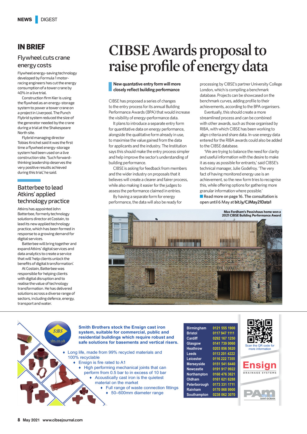 EWS | DIGEST IN BRIEF Flywheel cuts crane energy costs Flywheel energy-saving technology developed by Formula 1 motorracing engineers has cut the energy consumption of a tower crane by 40% in a live trial. Construction firm Kier is using the flywheel as an energy-storage system to power a tower crane on a project in Liverpool. The Punch Flybrid system reduced the size of the generator needed by the crane during a trial at the Shakespeare North site. Flybrid managing director Tobias Knichel said it was the first time a flywheel energy-storage system had been used on a live construction site. Such forwardthinking leadership deserves the very positive results achieved during this trial, he said. Batterbee to lead Atkins applied technology practice Atkins has appointed John Batterbee, formerly technology solutions director at Costain, to lead its new applied technology practice, which has been formed in response to a growing demand for digital services. Batterbee will bring together and expand Atkins digital services and data analytics to create a service that will help clients unlock the benefits of digital transformation. At Costain, Batterbee was responsible for helping clients with digital disruption and to realise the value of technology transformation. He has delivered solutions across a diverse range of sectors, including defence, energy, transport and water. CIBSE Awards proposal to New quantative entry form will more CIBSE has proposed a series of changes to the entry process for its annual Building Performance Awards (BPA) that would increase the visibility of energy-performance data. It plans to introduce a separate entry form for quantitative data on energy performance, alongside the qualitative form already in use, to maximise the value gained from the data for applicants and the industry. The Institution says this should make the entry process simpler and help improve the sectors understanding of building performance. CIBSE is asking for feedback from members and the wider industry on proposals that it believes will create a clearer and fairer process, while also making it easier for the judges to assess the performance claimed in entries. By having a separate form for energy performance, the data will also be ready for processing by CIBSEs partner University College London, which is compiling a benchmark database. Projects can be showcased on the achievements, according to the BPA organisers. Eventually, this should create a more streamlined process and can be combined with other awards, such as those organised by RIBA, with which CIBSE has been working to align criteria and share data. In-use energy data entered for the RIBA awards could also be added to the CIBSE database. We are trying to balance the need for clarity and useful information with the desire to make it as easy as possible for entrants, said CIBSEs technical manager, Julie Godefroy. The very fact of having monitored energy use is an achievement, so the new form tries to recognise this, while offering options for gathering more granular information where possible. Read more on page 16. The consultation is open until 6 May at Max Fordhams Passivhaus home won a 2021 CIBSE Building Performance Award 8 May 2021 www.cibsejournal.com CIBSE May 21 pp08-09 News 2.indd 8 23/04/2021 15:43