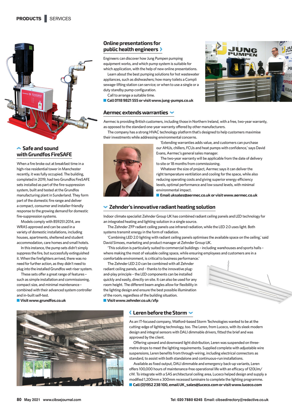 PRODUCTS | SERVICES Online presentations for public health engineers Engineers can discover how Jung Pumpen pumping equipment works, and which pump system is suitable for which application, with the help of new online presentations. Learn about the best pumping solutions for hot wastewater appliances, such as dishwashers; how many toilets a Compli sewage-lifting station can service; or when to use a single or a Call to arrange a suitable time. Call 0118 9821 555 or visit www.jung-pumps.co.uk Aermec extends warranties Aermec is providing British customers, including those in Northern Ireland, with a free, two-year warranty, as opposed to the standard one-year warranty offered by other manufacturers. their investments while addressing environmental concerns. Safe and sound with Grundfos FireSAFE high-rise residential tower in Manchester recently, it was fully occupied. The building, Evans, Aermecs general sales manager. The two-year warranty will be applicable from the date of delivery to site or 18 months from commissioning. Whatever the size of project, Aermec says it can deliver the right temperature ventilation and cooling for the space, while also manufacturing plant in Sunderland. They form levels, optimal performance and low sound levels, with minimal environmental impact. Email uksales@aermec.co.uk or visit www.aermec.co.uk a compact, consumer and installer-friendly response to the growing demand for domestic Zehnders innovative radiant heating solution an integrated heating and lighting solution in a single source. WRAS approved and can be used in a variety of domestic installations, including houses, apartments, sheltered and student accommodation, care homes and small hotels. In this instance, the pump sets didnt simply systems transmit energy in the form of radiation. This solution is particularly suited to commercial buildings including warehouses and sports halls where making the most of valuable ceiling space, while ensuring employees and customers are in a comfortable environment, is critical to business performance. need for further action, as they didnt need to These sets offer a great range of features such as simple installation and commissioning, compact size, and minimal maintenance combined with their advanced system controller and in-built self-test. Visit www.grundfos.co.uk radiant ceiling panels, and thanks to the innovative plugand-play principle the LED components can be installed quickly and easily, directly on site. It can also be used for any the lighting design and ensure the best possible illumination of the room, regardless of the building situation. Visit www.zehnder.co.uk/zfp Leren before the Storm As an IT-focused company, Watford-based Storm Technologies wanted to be at the cutting-edge of lighting technology, too. The Leren, from Luceco, with its sleek modern approved by the client. Offering upward and downward light distribution, Leren was suspended on threemetre drops to meet the lighting requirements. Supplied complete with adjustable wire standard, to assist with both standalone and continuous-run installations. cW. To integrate with a SAS architectural ceiling area, Luceco helped design and supply a Call (0)1952 238 100, email UK_sales@luceco.com or visit www.luceco.com 80 May 2021 www.cibsejournal.com CIBSE May 21 pp79-81 Products.indd 80 Tel: 020 7880 6245 Email: cibsedirectory@redactive.co.uk 23/04/2021 16:19