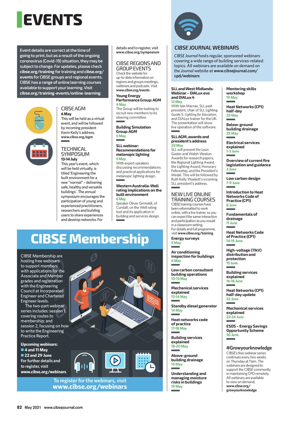 EVENTS Event details are correct at the time of going to print, but as a result of the ongoing coronavirus (Covid-19) situation, they may be subject to change. For updates, please check cibse.org/training for training and cibse.org/ events for CIBSE groups and regional events. CIBSE has a range of online learning courses available to support your learning. Visit cibse.org/training-events/online-learning CIBSE AGM 6 May This will be held as a virtual event, and will be followed by incoming president Kevin Kellys address. details and to register, visit CIBSE JOURNAL WEBINARS CIBSE REGIONS AND GROUP EVENTS CIBSE Journal hosts regular, sponsored webinars covering a wide range of building services-related topics. All webinars are available on demand on the Journal website at www.cibsejournal.com/ cpd/webinars www.cibse.org/symposium Check the website for up-to-date information on regions and groups meetings, webinars and podcasts. Visit www.cibse.org/events Young Energy Performance Group: AGM 4 May The Group will be looking to recruit new members to its steering committee. Building Simulation Group: AGM www.cibse.org/agm 5 May TECHNICAL SYMPOSIUM SLL webinar: Recommendations for melanopic lighting 13-14 July This years event, which will be held virtually, is titled Engineering the built environment for a new normal delivering safe, healthy and versatile buildings. The annual symposium encourages the participation of young and experienced practitioners, researchers and building users to share experiences and develop networks. For 5 May With expert speakers discussing recommendations and practical applications for melanopic lighting design. Western Australia: Well rating implications on the built environment 6 May Speaker Oliver Grimaldi, of Cundall, on the Well rating tool and its application in building and services design. CIBSE Membership CIBSE Membership are hosting free webinars to support members with applications for the Associate and Member grades and registration with the Engineering Council at Incorporated Engineer and Chartered Engineer levels. The two-part webinar series includes: session 1, covering routes to membership; and session 2, focusing on how to write the Engineering Practice Report. Upcoming webinars: 4 and 11 May 22 and 29 June For further details and to register, visit www.cibse.org/webinars To register for the webinars, visit www.cibse.org/webinars SLL and West Midlands: Webinar DIALux evo and DIALux 4 12 May With Iain Macrae, SLL past president, chair of SLL Lighting Guide 5: Lighting for Education, and DIALux trainer for the UK. The presentation will show live operation of the software. SLL AGM, awards and presidents address 20 May SLL will present the Leon Gaster and Walsh Weston Awards for research papers, the Regional Lighting Award, the Lighting Award, Honorary Fellowship, and the Presidents Medal. This will be followed by Ruth Kelly Wasketts incoming SLL presidents address. NEW LIVE ONLINE TRAINING COURSES CIBSE training courses have been reformatted to work online, with a live trainer, so you can expect the same interaction and participation as you would in a classroom setting. For details and full programme, visit www.cibse.org/training Energy surveys Mentoring skills workshop 19 May Heat Networks (CP1) half-day 25 May Below-ground building drainage 25 May Electrical services explained 1-3 June Overview of current fire legislation and guidance 3 June Low carbon design 7-9 June Introduction to Heat Networks Code of Practice (CP1) 8 June Fundamentals of drainage 11 June Heat Networks Code of Practice (CP1) 5 May 14-15 June Air conditioning inspection for buildings High-voltage (11kV) distribution and protection 6 May Low carbon consultant building operations 10-13 May Mechanical services explained 12-14 May Standby diesel generator 14 May Heat networks code of practice 17-18 May Building services explained 18-20 May Above-ground building drainage 19 May Understanding and managing moisture risks in buildings 19 May 15 June Building services explained 16-18 June Heat Networks (CP1) half-day update 22 June Mechanical services explained 22-24 June ESOS Energy Savings Opportunity Scheme 30 June #Growyourknowledge CIBSEs free webinar series continues every two weeks on Thursday at 11am. The webinars are designed to support the CIBSE community in maintaining CPD remotely. All webinars are available to view on demand, www.cibse.org/ growyourknowledge 82 May 2021 www.cibsejournal.com CIBSE May 21 pp82 Events.indd 82 23/04/2021 16:20