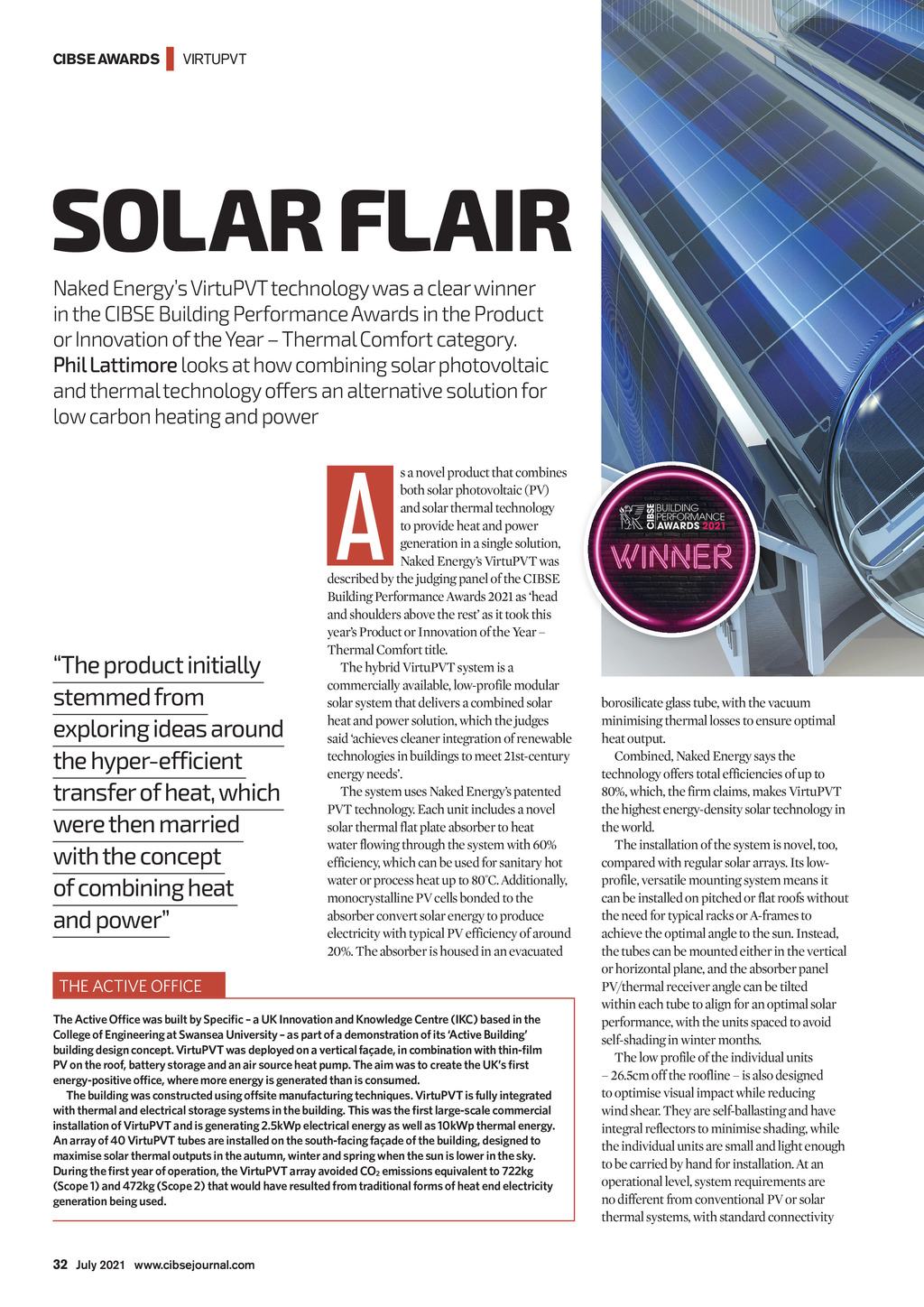 CIBSE AWARDS | VIRTUPVT SOLAR FLAIR Naked Energys VirtuPVT technology was a clear winner in the CIBSE Building Performance Awards in the Product or Innovation of the Year Thermal Comfort category. Phil Lattimore looks at how combining solar photovoltaic and thermal technology offers an alternative solution for low carbon heating and power A The product initially stemmed from exploring ideas around the hyper-efficient transfer of heat, which were then married with the concept of combining heat and power THE ACTIVE OFFICE s a novel product that combines both solar photovoltaic (PV) and solar thermal technology to provide heat and power generation in a single solution, Naked Energys VirtuPVT was described by the judging panel of the CIBSE Building Performance Awards 2021 as head and shoulders above the rest as it took this years Product or Innovation of the Year Thermal Comfort title. The hybrid VirtuPVT system is a commercially available, low-profile modular solar system that delivers a combined solar heat and power solution, which the judges said achieves cleaner integration of renewable technologies in buildings to meet 21st-century energy needs. The system uses Naked Energys patented PVT technology. Each unit includes a novel solar thermal flat plate absorber to heat water flowing through the system with 60% efficiency, which can be used for sanitary hot water or process heat up to 80C. Additionally, monocrystalline PV cells bonded to the absorber convert solar energy to produce electricity with typical PV efficiency of around 20%. The absorber is housed in an evacuated borosilicate glass tube, with the vacuum minimising thermal losses to ensure optimal heat output. Combined, Naked Energy says the technology offers total efficiencies of up to 80%, which, the firm claims, makes VirtuPVT the highest energy-density solar technology in the world. The installation of the system is novel, too, compared with regular solar arrays. Its lowprofile, versatile mounting system means it can be installed on pitched or flat roofs without the need for typical racks or A-frames to achieve the optimal angle to the sun. Instead, the tubes can be mounted either in the vertical or horizontal plane, and the absorber panel PV/thermal receiver angle can be tilted within each tube to align for an optimal solar performance, with the units spaced to avoid self-shading in winter months. The low profile of the individual units 26.5cm off the roofline is also designed to optimise visual impact while reducing wind shear. They are self-ballasting and have integral reflectors to minimise shading, while the individual units are small and light enough to be carried by hand for installation. At an operational level, system requirements are no different from conventional PV or solar thermal systems, with standard connectivity 32 July 2021 www.cibsejournal.com CIBSE July 21 pp32-34 Innovation award.indd 32 25/06/2021 16:36