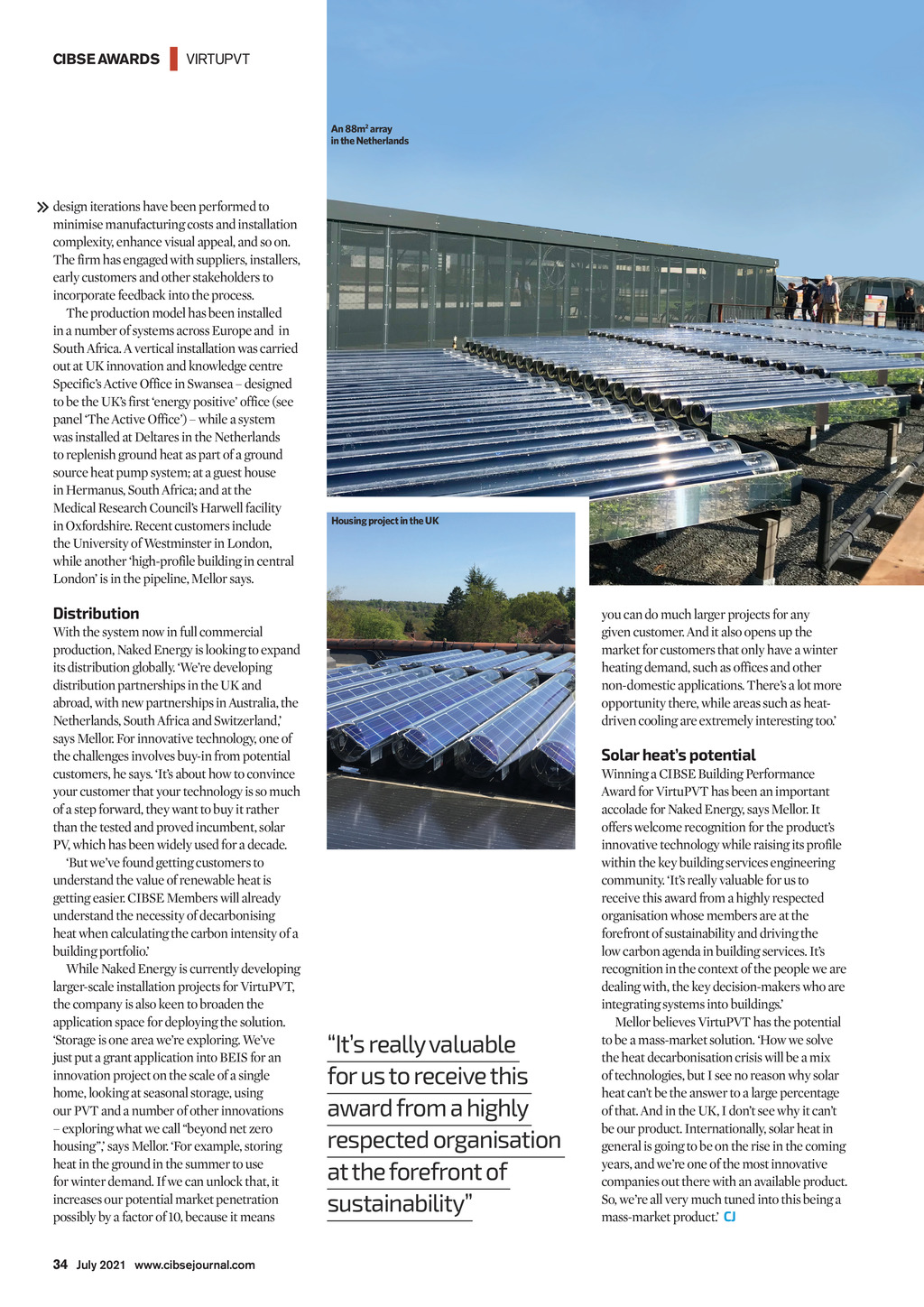 CIBSE AWARDS | VIRTUPVT An 88m2 array in the Netherlands design iterations have been performed to minimise manufacturing costs and installation complexity, enhance visual appeal, and so on. The firm has engaged with suppliers, installers, early customers and other stakeholders to incorporate feedback into the process. The production model has been installed in a number of systems across Europe and in South Africa. A vertical installation was carried out at UK innovation and knowledge centre Specifics Active Office in Swansea designed to be the UKs first energy positive office (see panel The Active Office) while a system was installed at Deltares in the Netherlands to replenish ground heat as part of a ground source heat pump system; at a guest house in Hermanus, South Africa; and at the Medical Research Councils Harwell facility in Oxfordshire. Recent customers include the University of Westminster in London, while another high-profile building in central London is in the pipeline, Mellor says. Housing project in the UK Distribution With the system now in full commercial production, Naked Energy is looking to expand its distribution globally. Were developing distribution partnerships in the UK and abroad, with new partnerships in Australia, the Netherlands, South Africa and Switzerland, says Mellor. For innovative technology, one of the challenges involves buy-in from potential customers, he says. Its about how to convince your customer that your technology is so much of a step forward, they want to buy it rather than the tested and proved incumbent, solar PV, which has been widely used for a decade. But weve found getting customers to understand the value of renewable heat is getting easier. CIBSE Members will already understand the necessity of decarbonising heat when calculating the carbon intensity of a building portfolio. While Naked Energy is currently developing larger-scale installation projects for VirtuPVT, the company is also keen to broaden the application space for deploying the solution. Storage is one area were exploring. Weve just put a grant application into BEIS for an innovation project on the scale of a single home, looking at seasonal storage, using our PVT and a number of other innovations exploring what we call beyond net zero housing, says Mellor. For example, storing heat in the ground in the summer to use for winter demand. If we can unlock that, it increases our potential market penetration possibly by a factor of 10, because it means you can do much larger projects for any given customer. And it also opens up the market for customers that only have a winter heating demand, such as offices and other non-domestic applications. Theres a lot more opportunity there, while areas such as heatdriven cooling are extremely interesting too. Solar heats potential Its really valuable for us to receive this award from a highly respected organisation at the forefront of sustainability Winning a CIBSE Building Performance Award for VirtuPVT has been an important accolade for Naked Energy, says Mellor. It offers welcome recognition for the products innovative technology while raising its profile within the key building services engineering community. Its really valuable for us to receive this award from a highly respected organisation whose members are at the forefront of sustainability and driving the low carbon agenda in building services. Its recognition in the context of the people we are dealing with, the key decision-makers who are integrating systems into buildings. Mellor believes VirtuPVT has the potential to be a mass-market solution. How we solve the heat decarbonisation crisis will be a mix of technologies, but I see no reason why solar heat cant be the answer to a large percentage of that. And in the UK, I dont see why it cant be our product. Internationally, solar heat in general is going to be on the rise in the coming years, and were one of the most innovative companies out there with an available product. So, were all very much tuned into this being a mass-market product. CJ 34 July 2021 www.cibsejournal.com CIBSE July 21 pp32-34 Innovation award.indd 34 25/06/2021 18:29