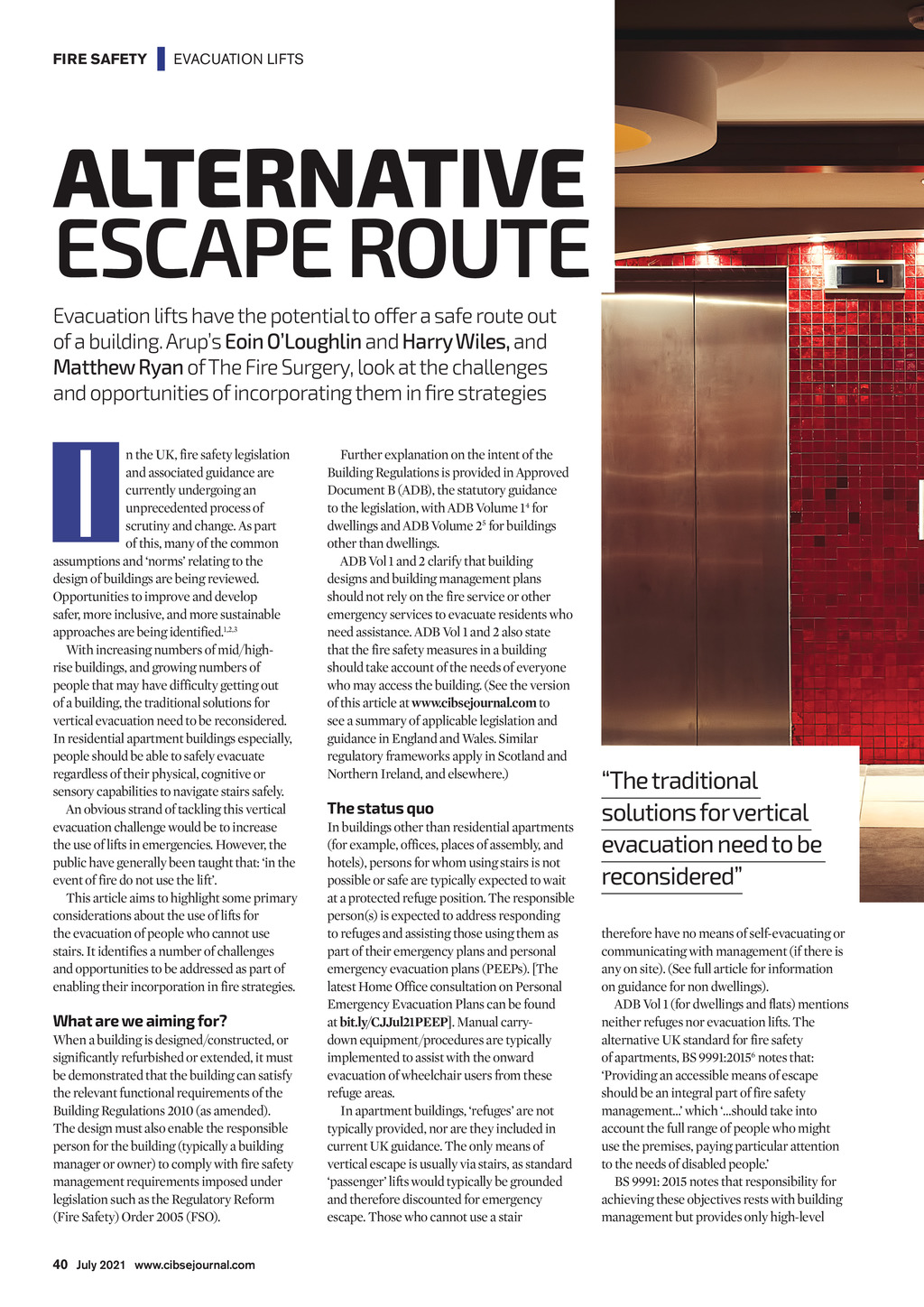 FIRE SAFETY | EVACUATION LIFTS ALTERNATIVE ESCAPE ROUTE Evacuation lifts have the potential to offer a safe route out of a building. Arups Eoin OLoughlin and Harry Wiles, and Matthew Ryan of The Fire Surgery, look at the challenges and opportunities of incorporating them in fire strategies I n the UK, fire safety legislation and associated guidance are currently undergoing an unprecedented process of scrutiny and change. As part of this, many of the common assumptions and norms relating to the design of buildings are being reviewed. Opportunities to improve and develop safer, more inclusive, and more sustainable approaches are being identified.1,2,3 With increasing numbers of mid/highrise buildings, and growing numbers of people that may have difficulty getting out of a building, the traditional solutions for vertical evacuation need to be reconsidered. In residential apartment buildings especially, people should be able to safely evacuate regardless of their physical, cognitive or sensory capabilities to navigate stairs safely. An obvious strand of tackling this vertical evacuation challenge would be to increase the use of lifts in emergencies. However, the public have generally been taught that: in the event of fire do not use the lift. This article aims to highlight some primary considerations about the use of lifts for the evacuation of people who cannot use stairs. It identifies a number of challenges and opportunities to be addressed as part of enabling their incorporation in fire strategies. What are we aiming for? When a building is designed/constructed, or significantly refurbished or extended, it must be demonstrated that the building can satisfy the relevant functional requirements of the Building Regulations 2010 (as amended). The design must also enable the responsible person for the building (typically a building manager or owner) to comply with fire safety management requirements imposed under legislation such as the Regulatory Reform (Fire Safety) Order 2005 (FSO). Further explanation on the intent of the Building Regulations is provided in Approved Document B (ADB), the statutory guidance to the legislation, with ADB Volume 14 for dwellings and ADB Volume 25 for buildings other than dwellings. ADB Vol 1 and 2 clarify that building designs and building management plans should not rely on the fire service or other emergency services to evacuate residents who need assistance. ADB Vol 1 and 2 also state that the fire safety measures in a building should take account of the needs of everyone who may access the building. (See the version of this article at www.cibsejournal.com to see a summary of applicable legislation and guidance in England and Wales. Similar regulatory frameworks apply in Scotland and Northern Ireland, and elsewhere.) The status quo In buildings other than residential apartments (for example, offices, places of assembly, and hotels), persons for whom using stairs is not possible or safe are typically expected to wait at a protected refuge position. The responsible person(s) is expected to address responding to refuges and assisting those using them as part of their emergency plans and personal emergency evacuation plans (PEEPs). [The latest Home Office consultation on Personal Emergency Evacuation Plans can be found at bit.ly/CJJul21PEEP]. Manual carrydown equipment/procedures are typically implemented to assist with the onward evacuation of wheelchair users from these refuge areas. In apartment buildings, refuges are not typically provided, nor are they included in current UK guidance. The only means of vertical escape is usually via stairs, as standard passenger lifts would typically be grounded and therefore discounted for emergency escape. Those who cannot use a stair The traditional solutions for vertical evacuation need to be reconsidered therefore have no means of self-evacuating or communicating with management (if there is any on site). (See full article for information on guidance for non dwellings). ADB Vol 1 (for dwellings and flats) mentions neither refuges nor evacuation lifts. The alternative UK standard for fire safety of apartments, BS 9991:20156 notes that: Providing an accessible means of escape should be an integral part of fire safety management which should take into account the full range of people who might use the premises, paying particular attention to the needs of disabled people. BS 9991: 2015 notes that responsibility for achieving these objectives rests with building management but provides only high-level 40 July 2021 www.cibsejournal.com CIBSE July 21 pp40-42 Evacuation lift.indd 40 25/06/2021 16:43
