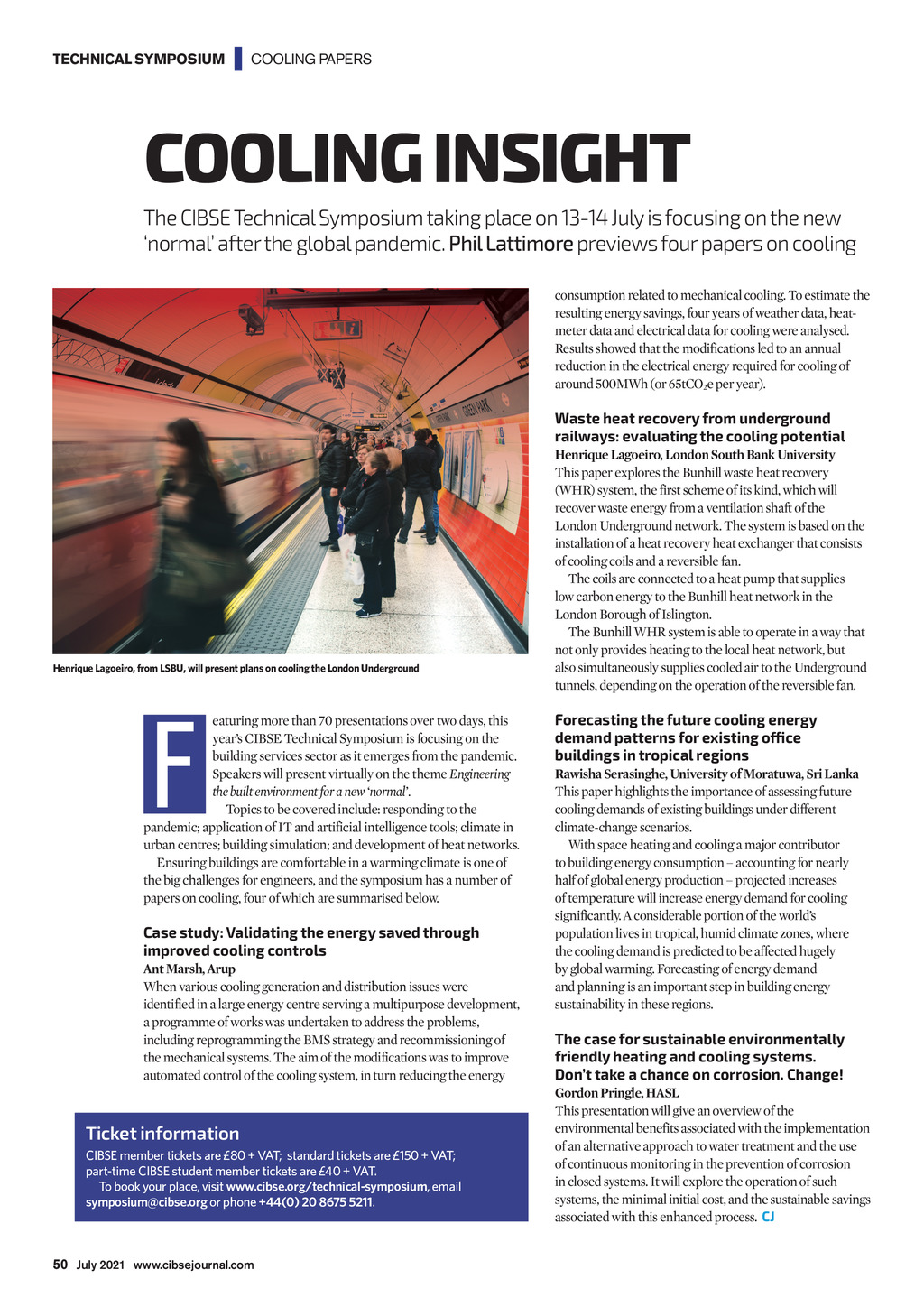 TECHNICAL SYMPOSIUM | COOLING PAPERS COOLING INSIGHT The CIBSE Technical Symposium taking place on 13-14 July is focusing on the new normal after the global pandemic. Phil Lattimore previews four papers on cooling consumption related to mechanical cooling. To estimate the resulting energy savings, four years of weather data, heatmeter data and electrical data for cooling were analysed. Results showed that the modifications led to an annual reduction in the electrical energy required for cooling of around 500MWh (or 65tCO2e per year). Waste heat recovery from underground railways: evaluating the cooling potential Henrique Lagoeiro, from LSBU, will present plans on cooling the London Underground F eaturing more than 70 presentations over two days, this years CIBSE Technical Symposium is focusing on the building services sector as it emerges from the pandemic. Speakers will present virtually on the theme Engineering the built environment for a new normal. Topics to be covered include: responding to the pandemic; application of IT and artificial intelligence tools; climate in urban centres; building simulation; and development of heat networks. Ensuring buildings are comfortable in a warming climate is one of the big challenges for engineers, and the symposium has a number of papers on cooling, four of which are summarised below. Case study: Validating the energy saved through improved cooling controls Ant Marsh, Arup When various cooling generation and distribution issues were identified in a large energy centre serving a multipurpose development, a programme of works was undertaken to address the problems, including reprogramming the BMS strategy and recommissioning of the mechanical systems. The aim of the modifications was to improve automated control of the cooling system, in turn reducing the energy Ticket information CIBSE member tickets are 80 + VAT; standard tickets are 150 + VAT; part-time CIBSE student member tickets are 40 + VAT. To book your place, visit www.cibse.org/technical-symposium, email symposium@cibse.org or phone +44(0) 20 8675 5211. Henrique Lagoeiro, London South Bank University This paper explores the Bunhill waste heat recovery (WHR) system, the first scheme of its kind, which will recover waste energy from a ventilation shaft of the London Underground network. The system is based on the installation of a heat recovery heat exchanger that consists of cooling coils and a reversible fan. The coils are connected to a heat pump that supplies low carbon energy to the Bunhill heat network in the London Borough of Islington. The Bunhill WHR system is able to operate in a way that not only provides heating to the local heat network, but also simultaneously supplies cooled air to the Underground tunnels, depending on the operation of the reversible fan. Forecasting the future cooling energy demand patterns for existing office buildings in tropical regions Rawisha Serasinghe, University of Moratuwa, Sri Lanka This paper highlights the importance of assessing future cooling demands of existing buildings under different climate-change scenarios. With space heating and cooling a major contributor to building energy consumption accounting for nearly half of global energy production projected increases of temperature will increase energy demand for cooling significantly. A considerable portion of the worlds population lives in tropical, humid climate zones, where the cooling demand is predicted to be affected hugely by global warming. Forecasting of energy demand and planning is an important step in building energy sustainability in these regions. The case for sustainable environmentally friendly heating and cooling systems. Dont take a chance on corrosion. Change! Gordon Pringle, HASL This presentation will give an overview of the environmental benefits associated with the implementation of an alternative approach to water treatment and the use of continuous monitoring in the prevention of corrosion in closed systems. It will explore the operation of such systems, the minimal initial cost, and the sustainable savings associated with this enhanced process. CJ 50 July 2021 www.cibsejournal.com CIBSE July 21 pp50 CIBSE Technical Symposium 2021.indd 50 25/06/2021 18:32