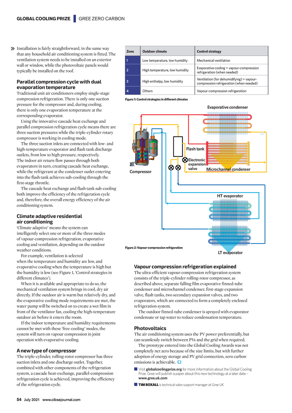 GLOBAL COOLING PRIZE | GREE ZERO CARBON Installation is fairly straightforward, in the same way that any household air conditioning system is fitted. The ventilation system needs to be installed on an exterior wall or window, while the photovoltaic panels would typically be installed on the roof. Parallel compression cycle with dual evaporation temperature Traditional unit air conditioners employ single-stage compression refrigeration. There is only one suction pressure for the compressor and, during cooling, there is only one evaporation temperature at the corresponding evaporator. Using the innovative cascade heat exchange and parallel compression refrigeration cycle means there are three suction pressures while the triple-cylinder rotary compressor is working in cooling mode. The three suction inlets are connected with low- and high-temperature evaporator and flash tank discharge outlets, from low to high pressure, respectively. The indoor air return flow passes through both evaporators in turn, creating cascade heat exchange, while the refrigerant at the condenser outlet entering into the flash tank achieves sub-cooling through the first-stage throttle. The cascade heat exchange and flash tank sub-cooling both improve the efficiency of the refrigeration cycle and, therefore, the overall energy efficiency of the air conditioning system. Zone Outdoor climate Control strategy 1 Low temperature, low humidity Mechanical ventilation 2 High temperature, low humidity Evaporative cooling + vapour-compression refrigeration (when needed) 3 High enthalpy, low humidity Ventilation (for dehumidifying) + vapourcompression refrigeration (when needed) 4 Others Vapour-compression refrigeration Figure 1: Control strategies in different climates Evaporative condenser Flash tank Compressor Electronic expansion valve Microchannel condenser HT evaporator Climate adaptive residential air conditioning Climate adaptive means the system can intelligently select one or more of the three modes of vapour-compression refrigeration, evaporative cooling and ventilation, depending on the outdoor weather conditions. For example, ventilation is selected when the temperature and humidity are low, and evaporative cooling when the temperature is high but the humidity is low (see Figure 1, Control strategies in different climates). When it is available and appropriate to do so, the mechanical ventilation system brings in cool, dry air directly. If the outdoor air is warm but relatively dry, and the evaporative cooling mode requirements are met, the water pump will be switched on to create a wet film in front of the ventilator fan, cooling the high-temperature outdoor air before it enters the room. If the indoor temperature and humidity requirements cannot be met with these free-cooling modes, the system will turn on vapour compression in joint operation with evaporative cooling. A new type of compressor The triple-cylinder, rolling-rotor compressor has three suction inlets and one discharge outlet. Together, combined with other components of the refrigeration system, a cascade heat-exchange, parallel-compression refrigeration cycle is achieved, improving the efficiency of the refrigeration cycle. Figure 2: Vapour-compression refrigeration LT evaporator Vapour compression refrigeration explained The ultra-efficient vapour-compression refrigeration system consists of the triple-cylinder rolling-rotor compressor, as described above, separate falling film evaporative finned-tube condenser and microchannel condenser, first-stage expansion valve, flash tanks, two secondary expansion valves, and two evaporators, which are connected to form a completely enclosed refrigeration system. The outdoor finned-tube condenser is sprayed with evaporator condensate or tap water to reduce condensation temperature. Photovoltaics The air conditioning system uses the PV power preferentially, but can seamlessly switch between PVs and the grid when required. The prototype entered into the Global Cooling Awards was not completely net zero because of the size limits, but with further adoption of energy storage and PV grid connection, zero carbon emissions is achievable. CJ Visit globalcoolingprize.org for more information about the Global Cooling Prize. Gree will publish a paper about this new technology at a later date www.gree.uk.com TIM BOXALL is technical sales support manager at Gree UK 54 July 2021 www.cibsejournal.com CIBSE July 21 pp53-54 Gree Global Cooling Prize.indd 54 25/06/2021 17:03