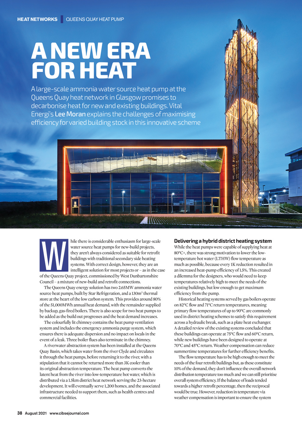 HEAT NETWORKS | QUEENS QUAY HEAT PUMP A NEW ERA FOR HEAT A large-scale ammonia water source heat pump at the Queens Quay heat network in Glasgow promises to decarbonise heat for new and existing buildings. Vital Energis Lee Moran explains the challenges of maximising efficiency for varied building stock in this innovative scheme W hile there is considerable enthusiasm for large-scale water source heat pumps for new-build projects, they arent always considered as suitable for retrofit buildings with traditional secondary side heating systems. With correct design, however, they are an intelligent solution for most projects or as in the case of the Queens Quay project, commissioned by West Dunbartonshire Council a mixture of new-build and retrofit connections. The Queens Quay energy solution has two 2.65MW ammonia water source heat pumps, built by Star Refrigeration, and a 130m3 thermal store at the heart of the low carbon system. This provides around 80% of the 51,000MWh annual heat demand, with the remainder supplied by backup, gas-fired boilers. There is also scope for two heat pumps to be added as the build out progresses and the heat demand increases. The colourfully lit chimney contains the heat pump ventilation system and includes the emergency ammonia purge system, which ensures there is adequate dispersion and no impact on locals in the event of a leak. Three boiler flues also terminate in the chimney. A riverwater abstraction system has been installed at the Queens Quay Basin, which takes water from the river Clyde and circulates it through the heat pumps, before returning it to the river, with a stipulation that it cannot be returned more than 3K cooler than its original abstraction temperature. The heat pump converts the latent heat from the river into low-temperature hot water, which is distributed via a 1.5km district heat network serving the 23-hectare development. It will eventually serve 1,200 homes, and the associated infrastructure needed to support them, such as health centres and commercial facilities. Delivering a hybrid district heating system While the heat pumps were capable of supplying heat at 80C+, there was strong motivation to lower the lowtemperature hot water (LTHW) flow temperature as much as possible, because every 1K reduction resulted in an increased heat-pump efficiency of 1.5%. This created a dilemma for the designers, who would need to keep temperatures relatively high to meet the needs of the existing buildings, but low enough to get maximum efficiency from the pump. Historical heating systems served by gas boilers operate on 82C flow and 71C return temperatures, meaning primary flow temperatures of up to 90C are commonly used in district heating schemes to satisfy this requirement across a hydraulic break, such as a plate heat exchanger. A detailed review of the existing systems concluded that these buildings can operate at 75C flow and 60C return, while new buildings have been designed to operate at 70C and 45C return. Weather compensation can reduce summertime temperatures for further efficiency benefits. The flow temperature has to be high enough to meet the needs of the four retrofit buildings but, as these constitute 10% of the demand, they dont influence the overall network distribution temperature too much and we can still prioritise overall system efficiency. If the balance of loads tended towards a higher retrofit percentage, then the reciprocal would be true. However, reduction in temperature via weather compensation is important to ensure the system 38 August 2021 www.cibsejournal.com CIBSE Aug 21 pp38-40 Queen s Quay.indd 38 23/07/2021 12:13