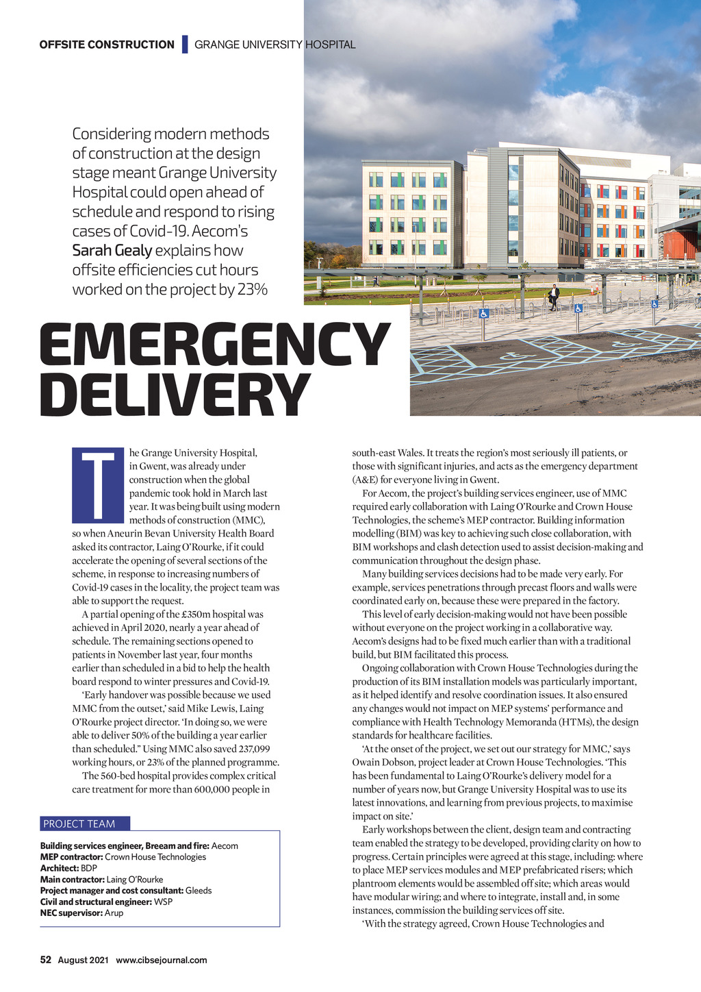 OFFSITE CONSTRUCTION | GRANGE UNIVERSITY HOSPITAL Considering modern methods of construction at the design stage meant Grange University Hospital could open ahead of schedule and respond to rising cases of Covid-19. Aecoms Sarah Gealy explains how offsite efficiencies cut hours worked on the project by 23% EMERGENCY DELIVERY T he Grange University Hospital, in Gwent, was already under construction when the global pandemic took hold in March last year. It was being built using modern methods of construction (MMC), so when Aneurin Bevan University Health Board asked its contractor, Laing ORourke, if it could accelerate the opening of several sections of the scheme, in response to increasing numbers of Covid-19 cases in the locality, the project team was able to support the request. A partial opening of the 350m hospital was achieved in April 2020, nearly a year ahead of schedule. The remaining sections opened to patients in November last year, four months earlier than scheduled in a bid to help the health board respond to winter pressures and Covid-19. Early handover was possible because we used MMC from the outset, said Mike Lewis, Laing ORourke project director. In doing so, we were able to deliver 50% of the building a year earlier than scheduled. Using MMC also saved 237,099 working hours, or 23% of the planned programme. The 560-bed hospital provides complex critical care treatment for more than 600,000 people in PROJECT TEAM BDP Crown House Technologies Laing ORourke Arup WSP Aecom Gleeds south-east Wales. It treats the regions most seriously ill patients, or those with significant injuries, and acts as the emergency department (A&E) for everyone living in Gwent. For Aecom, the projects building services engineer, use of MMC required early collaboration with Laing ORourke and Crown House Technologies, the schemes MEP contractor. Building information modelling (BIM) was key to achieving such close collaboration, with BIM workshops and clash detection used to assist decision-making and communication throughout the design phase. Many building services decisions had to be made very early. For example, services penetrations through precast floors and walls were coordinated early on, because these were prepared in the factory. This level of early decision-making would not have been possible without everyone on the project working in a collaborative way. Aecoms designs had to be fixed much earlier than with a traditional build, but BIM facilitated this process. Ongoing collaboration with Crown House Technologies during the production of its BIM installation models was particularly important, as it helped identify and resolve coordination issues. It also ensured any changes would not impact on MEP systems performance and compliance with Health Technology Memoranda (HTMs), the design standards for healthcare facilities. At the onset of the project, we set out our strategy for MMC, says Owain Dobson, project leader at Crown House Technologies. This has been fundamental to Laing ORourkes delivery model for a number of years now, but Grange University Hospital was to use its latest innovations, and learning from previous projects, to maximise impact on site. Early workshops between the client, design team and contracting team enabled the strategy to be developed, providing clarity on how to progress. Certain principles were agreed at this stage, including: where to place MEP services modules and MEP prefabricated risers; which plantroom elements would be assembled off site; which areas would have modular wiring; and where to integrate, install and, in some instances, commission the building services off site. With the strategy agreed, Crown House Technologies and 52 August 2021 www.cibsejournal.com CIBSE Aug 21 pp52-54 Grange hospital.indd 52 23/07/2021 12:18
