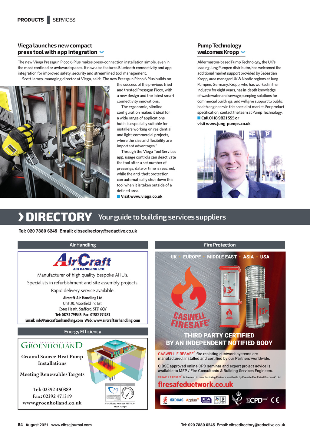 PRODUCTS | SERVICES Viega launches new compact press tool with app integration Pump Technology welcomes Kropp The new Viega Pressgun Picco 6 Plus makes press-connection installation simple, even in Aldermaston-based Pump Technology, the UKs leading Jung Pumpen distributor, has welcomed the additional market support provided by Sebastian Kropp, area manager UK & Nordic regions at Jung Pumpen, Germany. Kropp, who has worked in the industry for eight years, has in-depth knowledge of wastewater and sewage pumping solutions for commercial buildings, and will give support to public health engineers in this specialist market. For product integration for improved safety, security and streamlined tool management. Scott James, managing director at Viega, said: The new Pressgun Picco 6 Plus builds on the success of the previous tried and trusted Pressgun Picco, with a new design and the latest smart connectivity innovations. The ergonomic, slimline a wide range of applications, but it is especially suitable for installers working on residential and light-commercial projects, Call 0118 9821 555 or visit www.jung-pumps.co.uk important advantages. Through the Viega Tool Services app, usage controls can deactivate the tool after a set number of pressings, date or time is reached, while the anti-theft protection can automatically shut down the tool when it is taken outside of a Visit www.viega.co.uk Your guide buildingservices servicessuppliers suppliers guide toto building DIRECTORYYour DIRECTORY Tel:020 0207880 78806245 6245Email: Email: cibsedirectory@redactive.co.uk Tel: cibsedirectory@redactive.co.uk Air Handling Fire Protection UK EUROPE MIDDLE EAST ASIA USA Manufacturer of high quality bespoke AHUs. Specialists in refurbishment and site assembly projects. Rapid delivery service available. Aircraft Air Handling Ltd Unit 20, Moorfield Ind Est, Cotes Heath, Stafford, ST21 6QY Tel: 01782 791545 Fax: 01782 791283 Email: info@aircraftairhandling.com Web: www.aircraftairhandling.com Energy Efficiency THIRD PARTY CERTIFIED BY AN INDEPENDENT NOTIFIED BODY CASWELL FIRESAFE fire resisting ductwork systems are manufactured, installed and certified by our Partners worldwide. CIBSE approved online CPD seminar and expert project advice is available to MEP / Fire Consultants & Building Services Engineers. CASWELL FIRESAFE is licenced to manufacturing Partners worldwide by Firesafe Fire Rated Ductwork Ltd firesafeductwork.co.uk 64 August 2021 www.cibsejournal.com CIBSE Aug 21 pp61-64 Products.indd 64 August 2021 1 Tel: 020 7880 6245 www.cibsejournal.com Email: cibsedirectory@redactive.co.uk 23/07/2021 12:23