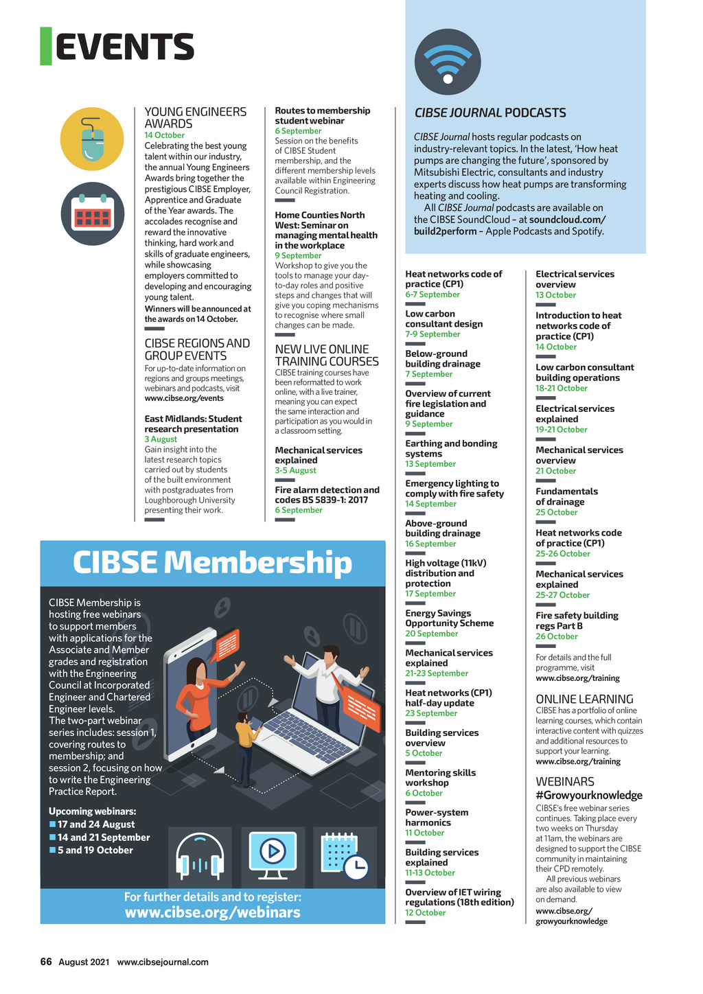 EVENTS YOUNG ENGINEERS AWARDS 14 October Celebrating the best young talent within our industry, the annual Young Engineers Awards bring together the prestigious CIBSE Employer, Apprentice and Graduate of the Year awards. The accolades recognise and reward the innovative thinking, hard work and skills of graduate engineers, while showcasing employers committed to developing and encouraging young talent. Winners will be announced at the awards on 14 October. CIBSE REGIONS AND GROUP EVENTS For up-to-date information on regions and groups meetings, webinars and podcasts, visit www.cibse.org/events East Midlands: Student research presentation 3 August Gain insight into the latest research topics carried out by students of the built environment with postgraduates from Loughborough University presenting their work. Routes to membership student webinar 6 September Session of CIBSE Student membership, and the different membership levels available within Engineering Council Registration. Home Counties North West: Seminar on managing mental health in the workplace 9 September Workshop to give you the tools to manage your dayto-day roles and positive steps and changes that will give you coping mechanisms to recognise where small changes can be made. NEW LIVE ONLINE TRAINING COURSES CIBSE training courses have been reformatted to work online, with a live trainer, meaning you can expect the same interaction and participation as you would in a classroom setting. Mechanical services explained 3-5 August Fire alarm detection and codes BS 5839-1: 2017 6 September CIBSE JOURNAL PODCASTS CIBSE Journal hosts regular podcasts on industry-relevant topics. In the latest, How heat pumps are changing the future, sponsored by Mitsubishi Electric, consultants and industry experts discuss how heat pumps are transforming heating and cooling. All CIBSE Journal podcasts are available on the CIBSE SoundCloud at soundcloud.com/ build2perform Apple Podcasts and Spotify. Heat networks code of practice (CP1) Electrical services overview Low carbon consultant design Introduction to heat networks code of practice (CP1) 6-7 September 7-9 September Below-ground building drainage 7 September Overview of current fire legislation and guidance 9 September Earthing and bonding systems 13 September Emergency lighting to comply with fire safety 14 September Above-ground building drainage CIBSE Membership CIBSE Membership is hosting free webinars to support members with applications for the Associate and Member grades and registration with the Engineering Council at Incorporated Engineer and Chartered Engineer levels. The two-part webinar series includes: session 1, covering routes to membership; and session 2, focusing on how to write the Engineering Practice Report. Upcoming webinars: 17 and 24 August 14 and 21 September 5 and 19 October www.cibse.org/webinars 14 October Low carbon consultant building operations 18-21 October Electrical services explained 19-21 October Mechanical services overview 21 October Fundamentals of drainage 25 October 16 September Heat networks code of practice (CP1) High voltage (11kV) distribution and protection Mechanical services explained 17 September Energy Savings Opportunity Scheme 20 September Mechanical services explained 21-23 September Heat networks (CP1) half-day update 23 September Building services overview 5 October Mentoring skills workshop 6 October Power-system harmonics 11 October Building services explained 11-13 October For further details and to register: 13 October Overview of IET wiring regulations (18th edition) 12 October 25-26 October 25-27 October Fire safety building regs Part B 26 October For details and the full programme, visit www.cibse.org/training ONLINE LEARNING CIBSE has a portfolio of online learning courses, which contain interactive content with quizzes and additional resources to support your learning. www.cibse.org/training WEBINARS #Growyourknowledge CIBSEs free webinar series continues. Taking place every two weeks on Thursday at 11am, the webinars are designed to support the CIBSE community in maintaining their CPD remotely. All previous webinars are also available to view on demand. www.cibse.org/ growyourknowledge 66 August 2021 www.cibsejournal.com CIBSE Aug 21 pp66 Events.indd 66 23/07/2021 12:24