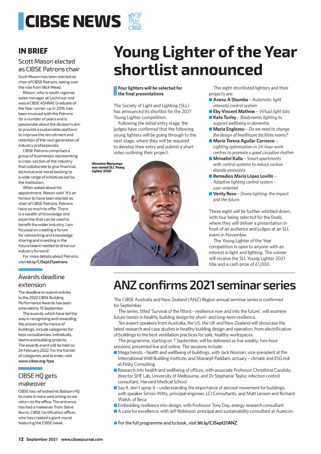 CIBSE NEWS Young Lighter of the Year shortlist announced IN BRIEF Scott Mason elected as CIBSE Patrons chair Scott Mason has been elected as chair of CIBSE Patrons, taking over the role from Nick Mead. Mason, who is south regional sales manager at Lochinvar and was a CIBSE ASHRAE Graduate of the Year runner-up in 2016, has been involved with the Patrons for a number of years and is passionate about the divisions aim to provide a sustainable platform to improve the recruitment and retention of the next generation of industry professionals. CIBSE Patrons comprises a group of businesses representing a cross-section of the industry that collaborate to give financial, technical and moral backing to a wide range of initiatives led by the Institution. When asked about his appointment, Mason said: Its an honour to have been elected as chair of CIBSE Patrons. Patrons have so much to offer. There is a wealth of knowledge and expertise that can be used to benefit the wider industry. I am focused on creating a forum for networking and knowledge sharing and investing in the future talent needed to drive our industry forward. For more details about Patrons, visit bit.ly/CJSept21patrons Four lighters will be selected for The Society of Light and Lighting (SLL) has announced its shortlist for the 2021 Young Lighter competition. Following the initial entry stage, the young lighters will be going through to the to develop their entry and submit a short video outlining their project. Aluwaine Manyonga was named SLL Young Lighter 2020 Awards deadline extension The deadline to submit entries to the 2022 CIBSE Building Performance Awards has been extended to 15 September. The awards, which have led the way in recognising and rewarding the proven performance of buildings, include categories for best consultancies, individuals, teams and building projects. The awards event will be held on 24 February 2022. For the full list of categories, and to enter, visit www.cibse.org/bpa CIBSE HQ gets makeover CIBSE has refreshed its Balham HQ to make it more welcoming as we return to the office. The entrance has had a makeover from Steve Burns, CIBSE Certification officer, who has created a giant mural featuring the CIBSE hawk. The eight shortlisted lighters and their projects are: Automatic light intensity control system Virtual light labs Biodynamic lighting to support wellbeing in dementia Do we need to change the design of healthcare facilities rooms? Lighting optimisation in 24-hour work centres to promote a good circadian rhythm Smart apartments with control systems to reduce carbon dioxide emissions Adaptive lighting control system user-oriented Verity Rose Drone lighting: the impact and the future. These eight will be further whittled down, where they will deliver a presentation in front of an audience and judges at an SLL event in November. The Young Lighter of the Year competition is open to anyone with an interest in light and lighting. The winner will receive the SLL Young Lighter 2021 title and a cash prize of 1,000. ANZ confirms 2021 seminar series for September. future trends in healthy building design for short- and long-term resilience. sessions, presented live and online. The sessions include: at Finity Consulting consultant, Harvard Medical School Walsh, of Beca For the full programme and to book, visit bit.ly/CJSept21ANZ 12 September 2021 www.cibsejournal.com CIBSE Sep 21 pp12-15 CIBSE News.indd 12 27/08/2021 10:01