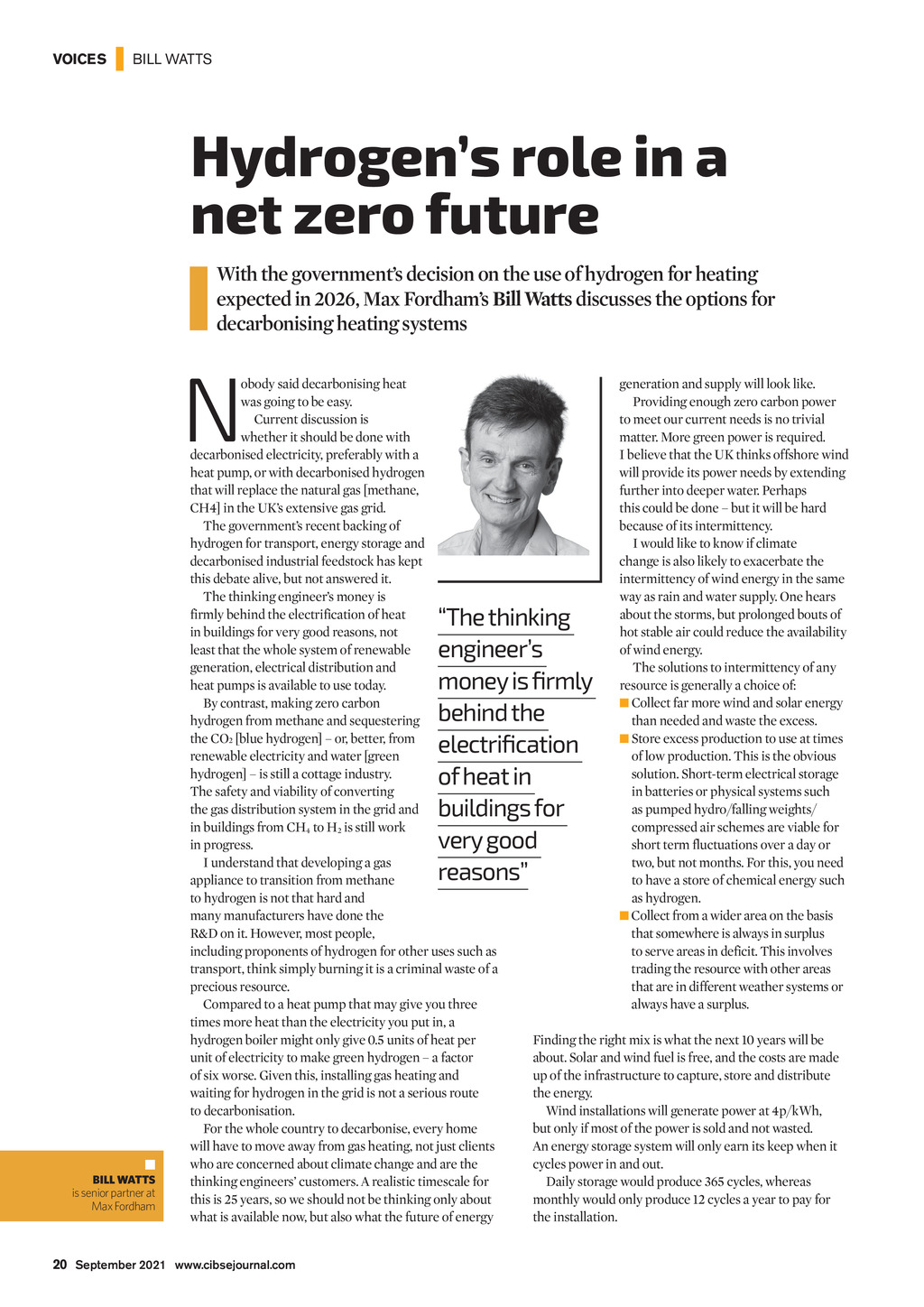 VOICES | BILL WATTS Hydrogens role in a net zero future With the governments decision on the use of hydrogen for heating expected in 2026, Max Fordhams Bill Watts discusses the options for decarbonising heating systems N obody said decarbonising heat was going to be easy. Current discussion is whether it should be done with decarbonised electricity, preferably with a heat pump, or with decarbonised hydrogen that will replace the natural gas [methane, CH4] in the UKs extensive gas grid. The governments recent backing of hydrogen for transport, energy storage and decarbonised industrial feedstock has kept this debate alive, but not answered it. The thinking engineers money is firmly behind the electrification of heat in buildings for very good reasons, not least that the whole system of renewable generation, electrical distribution and heat pumps is available to use today. By contrast, making zero carbon hydrogen from methane and sequestering the CO2 [blue hydrogen] or, better, from renewable electricity and water [green hydrogen] is still a cottage industry. The safety and viability of converting the gas distribution system in the grid and in buildings from CH4 to H2 is still work in progress. I understand that developing a gas appliance to transition from methane to hydrogen is not that hard and many manufacturers have done the R&D on it. However, most people, including proponents of hydrogen for other uses such as transport, think simply burning it is a criminal waste of a precious resource. Compared to a heat pump that may give you three times more heat than the electricity you put in, a hydrogen boiler might only give 0.5 units of heat per unit of electricity to make green hydrogen a factor of six worse. Given this, installing gas heating and waiting for hydrogen in the grid is not a serious route to decarbonisation. For the whole country to decarbonise, every home will have to move away from gas heating, not just clients who are concerned about climate change and are the thinking engineers customers. A realistic timescale for this is 25 years, so we should not be thinking only about what is available now, but also what the future of energy The thinking engineers money is firmly behind the electrification of heat in buildings for very good reasons BILL WATTS is senior partner at Max Fordham generation and supply will look like. Providing enough zero carbon power to meet our current needs is no trivial matter. More green power is required. I believe that the UK thinks offshore wind will provide its power needs by extending further into deeper water. Perhaps this could be done but it will be hard because of its intermittency. I would like to know if climate change is also likely to exacerbate the intermittency of wind energy in the same way as rain and water supply. One hears about the storms, but prolonged bouts of hot stable air could reduce the availability of wind energy. The solutions to intermittency of any resource is generally a choice of: Collect far more wind and solar energy than needed and waste the excess. Store excess production to use at times of low production. This is the obvious solution. Short-term electrical storage in batteries or physical systems such as pumped hydro/falling weights/ compressed air schemes are viable for short term fluctuations over a day or two, but not months. For this, you need to have a store of chemical energy such as hydrogen. Collect from a wider area on the basis that somewhere is always in surplus to serve areas in deficit. This involves trading the resource with other areas that are in different weather systems or always have a surplus. Finding the right mix is what the next 10 years will be about. Solar and wind fuel is free, and the costs are made up of the infrastructure to capture, store and distribute the energy. Wind installations will generate power at 4p/kWh, but only if most of the power is sold and not wasted. An energy storage system will only earn its keep when it cycles power in and out. Daily storage would produce 365 cycles, whereas monthly would only produce 12 cycles a year to pay for the installation. 20 September 2021 www.cibsejournal.com CIBSE Sep 21 pp20-21 Bill Watts.indd 20 27/08/2021 09:35