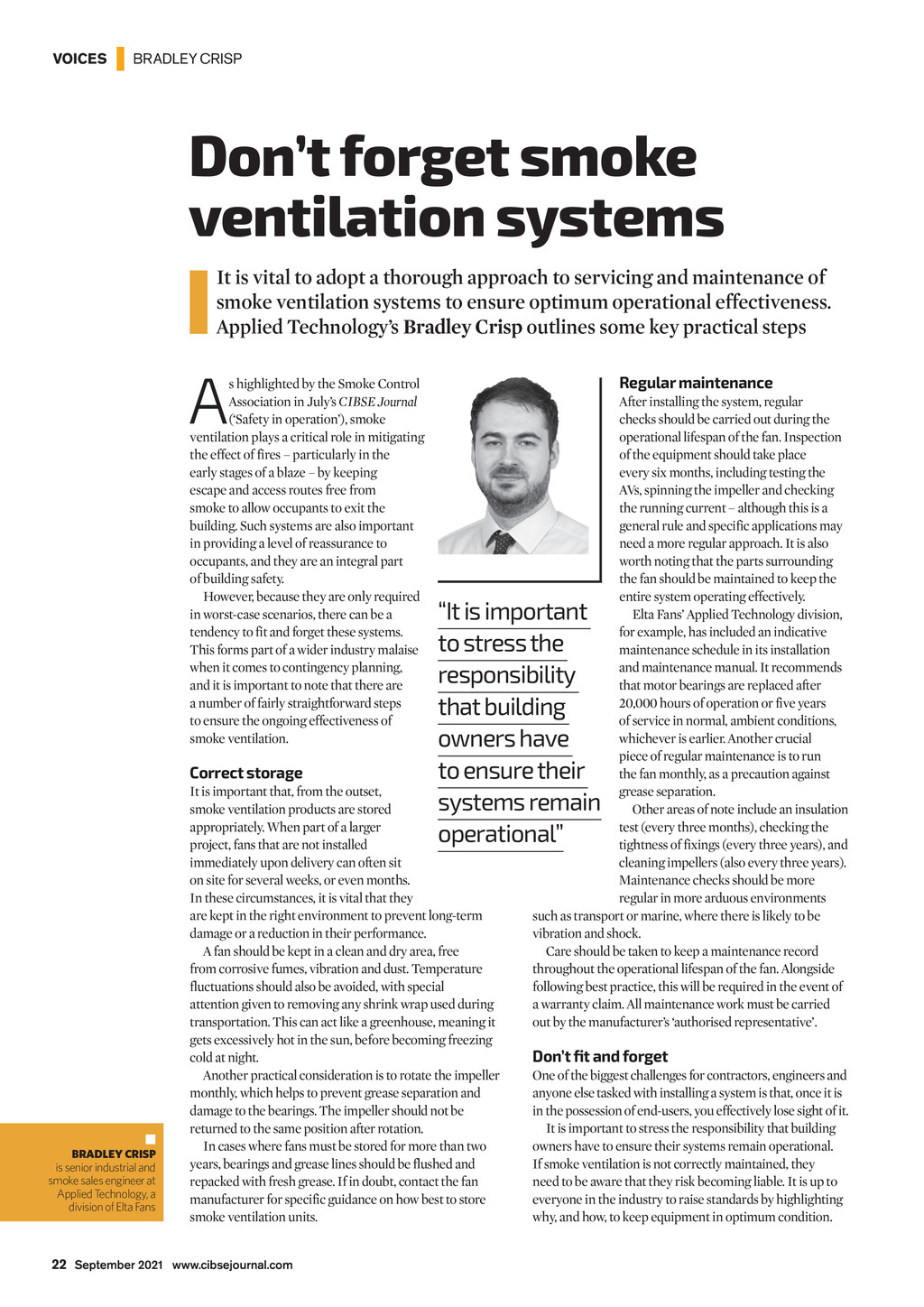 VOICES | BRADLEY CRISP Dont forget smoke ventilation systems It is vital to adopt a thorough approach to servicing and maintenance of smoke ventilation systems to ensure optimum operational effectiveness. Applied Technologys Bradley Crisp outlines some key practical steps A s highlighted by the Smoke Control Association in Julys CIBSE Journal (Safety in operation), smoke ventilation plays a critical role in mitigating the effect of fires particularly in the early stages of a blaze by keeping escape and access routes free from smoke to allow occupants to exit the building. Such systems are also important in providing a level of reassurance to occupants, and they are an integral part of building safety. However, because they are only required in worst-case scenarios, there can be a tendency to fit and forget these systems. This forms part of a wider industry malaise when it comes to contingency planning, and it is important to note that there are a number of fairly straightforward steps to ensure the ongoing effectiveness of smoke ventilation. Correct storage BRADLEY CRISP is senior industrial and smoke sales engineer at Applied Technology, a division of Elta Fans Regular maintenance After installing the system, regular checks should be carried out during the operational lifespan of the fan. Inspection of the equipment should take place every six months, including testing the AVs, spinning the impeller and checking the running current although this is a general rule and specific applications may need a more regular approach. It is also worth noting that the parts surrounding the fan should be maintained to keep the entire system operating effectively. Elta Fans Applied Technology division, for example, has included an indicative maintenance schedule in its installation and maintenance manual. It recommends that motor bearings are replaced after 20,000 hours of operation or five years of service in normal, ambient conditions, whichever is earlier. Another crucial piece of regular maintenance is to run the fan monthly, as a precaution against grease separation. Other areas of note include an insulation test (every three months), checking the tightness of fixings (every three years), and cleaning impellers (also every three years). Maintenance checks should be more regular in more arduous environments such as transport or marine, where there is likely to be vibration and shock. Care should be taken to keep a maintenance record throughout the operational lifespan of the fan. Alongside following best practice, this will be required in the event of a warranty claim. All maintenance work must be carried out by the manufacturers authorised representative. It is important to stress the responsibility that building owners have to ensure their systems remain operational It is important that, from the outset, smoke ventilation products are stored appropriately. When part of a larger project, fans that are not installed immediately upon delivery can often sit on site for several weeks, or even months. In these circumstances, it is vital that they are kept in the right environment to prevent long-term damage or a reduction in their performance. A fan should be kept in a clean and dry area, free from corrosive fumes, vibration and dust. Temperature fluctuations should also be avoided, with special attention given to removing any shrink wrap used during transportation. This can act like a greenhouse, meaning it gets excessively hot in the sun, before becoming freezing cold at night. Another practical consideration is to rotate the impeller monthly, which helps to prevent grease separation and damage to the bearings. The impeller should not be returned to the same position after rotation. In cases where fans must be stored for more than two years, bearings and grease lines should be flushed and repacked with fresh grease. If in doubt, contact the fan manufacturer for specific guidance on how best to store smoke ventilation units. Dont fit and forget One of the biggest challenges for contractors, engineers and anyone else tasked with installing a system is that, once it is in the possession of end-users, you effectively lose sight of it. It is important to stress the responsibility that building owners have to ensure their systems remain operational. If smoke ventilation is not correctly maintained, they need to be aware that they risk becoming liable. It is up to everyone in the industry to raise standards by highlighting why, and how, to keep equipment in optimum condition. 22 September 2021 www.cibsejournal.com CIBSE Sep 21 pp22 Elta Fans.indd 22 27/08/2021 09:29