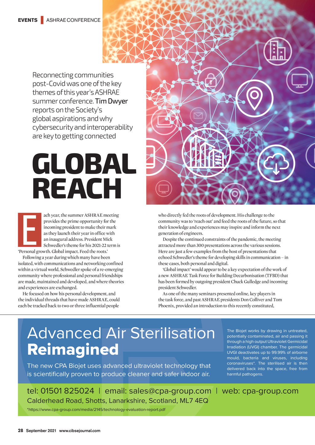 EVENTS | ASHRAE CONFERENCE Reconnecting communities post-Covid was one of the key themes of this years ASHRAE summer conference. Tim Dwyer reports on the Societys global aspirations and why cybersecurity and interoperability are key to getting connected GLOBAL REACH E ach year, the summer ASHRAE meeting provides the prime opportunity for the incoming president to make their mark as they launch their year in office with an inaugural address. President Mick Schwedlers theme for his 2021-22 term is Personal growth. Global impact. Feed the roots. Following a year during which many have been isolated, with communications and networking confined within a virtual world, Schwedler spoke of a re-emerging community where professional and personal friendships are made, maintained and developed, and where theories and experiences are exchanged. He focused on how his personal development, and the individual threads that have made ASHRAE, could each be tracked back to two or three influential people who directly fed the roots of development. His challenge to the community was to reach out and feed the roots of the future, so that their knowledge and experiences may inspire and inform the next generation of engineers. Despite the continued constraints of the pandemic, the meeting attracted more than 300 presentations across the various sessions. Here are just a few examples from the host of presentations that echoed Schwedlers theme for developing skills in communication in these cases, both personal and digital. Global impact would appear to be a key expectation of the work of a new ASHRAE Task Force for Building Decarbonisation (TFBD) that has been formed by outgoing president Chuck Gulledge and incoming president Schwedler. As one of the many seminars presented online, key players in the task force, and past ASHRAE presidents Don Colliver and Tom Phoenix, provided an introduction to this recently constituted, Advanced Air Sterilisation Reimagined The new CPA Biojet uses advanced ultraviolet technology that is scientifically proven to produce cleaner and safer indoor air. The Biojet works by drawing in untreated, potentially contaminated, air and passing it through a high output Ultraviolet Germicidal Irradiation (UVGI) chamber. The germicidal UVGI deactivates up to 99.99% of airborne mould, bacteria and viruses, including coronaviruses*. The sterilised air is then delivered back into the space, free from harmful pathogens. tel: 01501 825024 | email: sales@cpa-group.com | web: cpa-group.com Calderhead Road, Shotts, Lanarkshire, Scotland, ML7 4EQ *https://www.cpa-group.com/media/2145/technology-evaluation-report.pdf 28 September 2021 www.cibsejournal.com CIBSE Sep 21 pp28-30 Ashrae conference.indd 28 27/08/2021 10:55 UV vir Ex to En se En sta