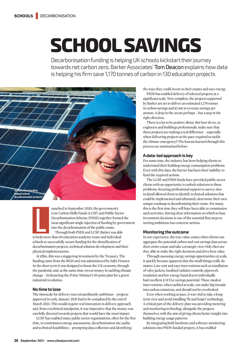 SCHOOLS | DECARBONISATION SCHOOL SAVINGS Decarbonisation funding is helping UK schools kickstart their journey towards net carbon zero. Barker Associates Tom Deacon explains how data is helping his firm save 1,170 tonnes of carbon in 130 education projects the ways they could invest in their estates and save energy. PSDS has enabled delivery of selected projects at a significant scale. Now complete, the projects supported by Barker are set to deliver an estimated 1,178 tonnes in carbon savings and 1.4m in revenue savings per annum. A drop in the ocean perhaps but a step in the right direction. There is a lot to be positive about. But how do we, as engineers and buildings professionals, make sure that these projects are making a real difference especially when delivering projects at the pace required to tackle the climate emergency? The lessons learned through this process are summarised below: A data-led approach is key Government funding helped school decarbonisation projects L aunched in September 2020, the governments Low Carbon Skills Funds (LCSF) and Public Sector Decarbonisation Scheme (PSDS) together formed the most significant single injection of funding by government into the decarbonisation of the public estate. Through both PSDS and LCSF, Barker was able to help more than 60 education academy trusts and individual schools to successfully secure funding for the identification of decarbonisation projects, technical solution development and their physical implementation. At 1bn, this was a staggering investment by the Treasury. The funding came from the BEIS and was administered by Salix Finance In the short term it was designed to boost the UK economy through the pandemic and, at the same time, invest money in tackling climate change kickstarting the Prime Ministers 10-point plan for a green industrial revolution. No time to lose The timescale for delivery was extraordinarily ambitious projects approved in early January 2021 had to be completed by the end of March 2021. This would require real innovation in delivery approach and, from a technical standpoint, it was imperative that the money was carefully directed towards projects that would have the most impact. LCSF has enabled many public sector organisations, often for the first time, to commission energy assessments, decarbonisation site audits and technical feasibilities prompting data collection and identifying For some time, the industry has been helping clients to understand their building energy consumption problems. Even with this data, the barrier has been their inability to fund the required actions. The LCSF and PSDS funds have provided public sector clients with an opportunity to unlock solutions to these problems. Securing professional support to survey sites in detail allowed them to identify technical solutions that could be implemented and ultimately determine their own unique roadmap to decarbonising their estate. For many, this is the first time they will have been able to commission such activities. Having clear information on which to base investment decisions is one of the essential first steps to turning ambitions into concrete actions. Monitoring the outcome In our experience, the true value comes when clients can aggregate the potential carbon and cost savings data across their entire estate and take a strategic view. Only then are they able to make the right decisions and drive best value. Through assessing energy savings opportunities at scale, it quickly became apparent that the small things really do matter. Low-cost and easy interventions such as installation of valve jackets, localised radiator controls, pipework insulation and low energy hand dryers individually had excellent /tCO2e savings potential. These modest interventions, when tackled at scale, can make big inroads into carbon emissions, and should not be overlooked. Even when working at pace, it was vital to take a longterm view and avoid installing fit and forget technology. A critical part of the delivery plan was providing metering and monitoring technology alongside the projects themselves with the aim of giving clients better insight into building energy usage patterns. By integrating both hardware and software monitoring solutions into PSDS-funded projects, it has enabled 38 September 2021 www.cibsejournal.com CIBSE Sep 21 pp38-39 Decarbonising schools.indd 38 27/08/2021 16:08