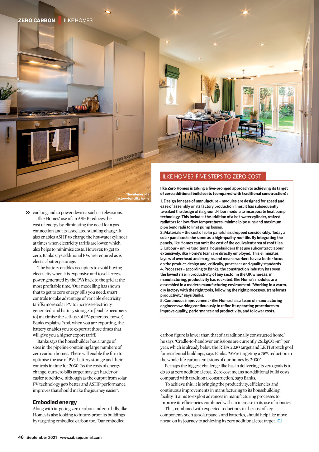 ZERO CARBON | ILKE HOMES ILKE HOMES FIVE STEPS TO ZERO COST 1. Design for ease of manufacture modules are designed for speed and ease of assembly on its factory production lines. It has subsequently cooking and to power devices such as televisions. Ilke Homes use of an ASHP reduces the cost of energy by eliminating the need for a gas connection and its associated standing charge. It also enables ASHP to charge the hot-water cylinder at times when electricity tariffs are lower, which also helps to minimise costs. However, to get to zero, Banks says additional PVs are required as is electric battery storage. The battery enables occupiers to avoid buying electricity when it is expensive and to sell excess power generated by the PVs back to the grid at the most profitable time. Our modelling has shown that to get to zero energy bills you need: smart controls to take advantage of variable electricity tariffs; more solar PV to increase electricity generated; and battery storage to [enable occupiers to] maximise the self-use of PV-generated power, Banks explains. And, when you are exporting, the battery enables you to export at those times that will give you a higher export tariff. Banks says the housebuilder has a range of sites in the pipeline containing large numbers of zero carbon homes. These will enable the firm to optimise the use of PVs, battery storage and their controls in time for 2030. As the costs of energy change, our zero bills target may get harder or easier to achieve, although as the output from solar PV technology gets better and ASHP performance improves that should make the journey easier. Embodied energy Along with targeting zero carbon and zero bills, ilke Homes is also looking to future-proof its buildings by targeting embodied carbon too. Our embodied technology. This includes the addition of a hot-water cylinder, resized pipe bend radii to limit pump losses. 2. Materials the cost of solar panels has dropped considerably. Today a solar panel costs the same as a high-quality roof tile. By integrating the panels, ilke Homes can omit the cost of the equivalent area of roof tiles. 3. Labour unlike traditional housebuilders that use subcontract labour layers of overhead and margins and means workers have a better focus on the product, design and, critically, processes and quality standards. 4. Processes according to Banks, the construction industry has seen the lowest rise in productivity of any sector in the UK whereas, in assembled in a modern manufacturing environment. Working in a warm, dry factory with the right tools, following the right processes, transforms 5. Continuous improvement ilke Homes has a team of manufacturing improve quality, performance and productivity, and to lower costs. carbon figure is lower than that of a traditionally constructed home, he says. Cradle-to-handover emissions are currently 261kgCO2.m-2 per year, which is already below the RIBA 2030 target and LETI stretch goal for residential buildings, says Banks. Were targeting a 75% reduction in the whole-life carbon emissions of our homes by 2030. Perhaps the biggest challenge ilke has in delivering its zero goals is to do so at zero additional cost. Zero cost means no additional build costs compared with traditional construction, says Banks. To achieve this, it is bringing the productivity, efficiencies and continuous improvements in manufacturing to its housebuilding facility. It aims to exploit advances in manufacturing processes to improve its efficiencies combined with an increase in its use of robotics. This, combined with expected reductions in the cost of key components such as solar panels and batteries, should help ilke move ahead on its journey to achieving its zero additional cost target. CJ 46 September 2021 www.cibsejournal.com CIBSE Sep 21 pp44-46 ilke homes.indd 46 27/08/2021 10:17