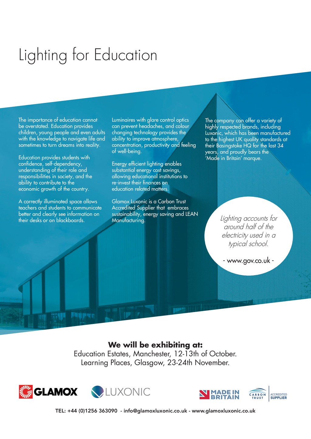 Lighting for Education The importance of education cannot be overstated. Education provides children, young people and even adults with the knowledge to navigate life and sometimes to turn dreams into reality. Luminaires with glare control optics can prevent headaches, and colour changing technology provides the ability to improve atmosphere, concentration, productivity and feeling of well-being. Education provides students with condence, self-dependency, understanding of their role and responsibilities in society, and the ability to contribute to the economic growth of the country. Energy efcient lighting enables substantial energy cost savings, allowing educational institutions to re-invest their nances on education related matters. A correctly illuminated space allows teachers and students to communicate better and clearly see information on their desks or on blackboards. Glamox Luxonic is a Carbon Trust Accredited Supplier that embraces sustainability, energy saving and LEAN Manufacturing. The company can offer a variety of highly respected brands, including Luxonic, which has been manufactured to the highest UK quality standards at their Basingstoke HQ for the last 34 years, and proudly bears the Made in Britain marque. Lighting accounts for around half of the electricity used in a typical school. - www.gov.co.uk - We will be exhibiting at: Education Estates, Manchester, chester, 12-13th of O October. Learning Places, G Glasgow, 23-24th November. TEL: +44 (0)1256 363090 - info@glamoxluxonic.co.uk - www.glamoxluxonic.co.uk 48 September 2021 www.cibsejournal.com p48.CIBSEMagSept21.indd 48 23/08/2021 11:37