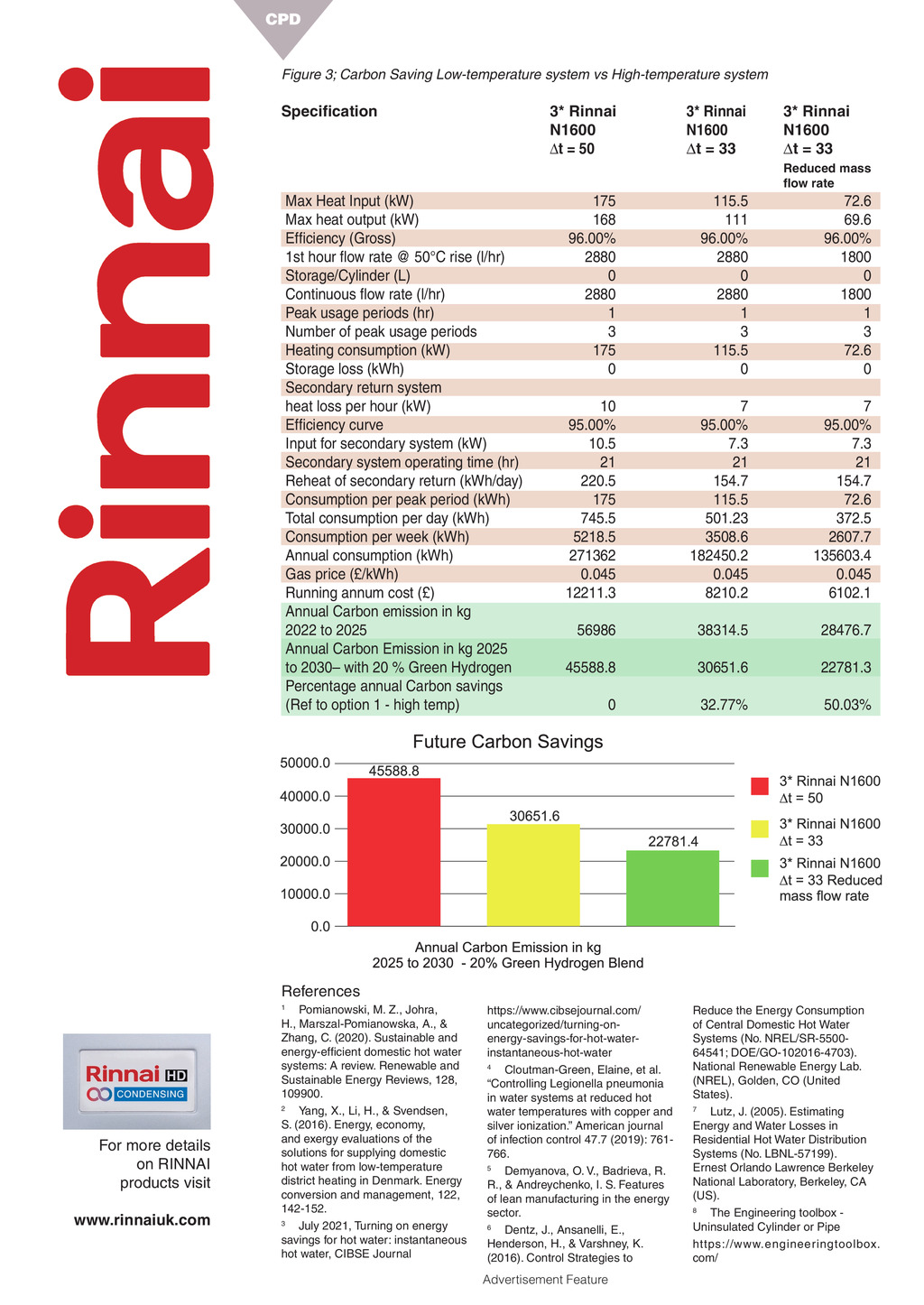 CPD Figure 3; Carbon Saving Low-temperature system vs High-temperature system Specication 3* Rinnai N1600 t = 50 3* Rinnai N1600 t = 33 3* Rinnai N1600 t = 33 Reduced mass ow rate Max Heat Input (kW) Max heat output (kW) Efciency (Gross) 1st hour ow rate @ 50C rise (l/hr) Storage/Cylinder (L) Continuous ow rate (l/hr) Peak usage periods (hr) Number of peak usage periods Heating consumption (kW) Storage loss (kWh) Secondary return system heat loss per hour (kW) Efciency curve Input for secondary system (kW) Secondary system operating time (hr) Reheat of secondary return (kWh/day) Consumption per peak period (kWh) Total consumption per day (kWh) Consumption per week (kWh) Annual consumption (kWh) Gas price (/kWh) Running annum cost () Annual Carbon emission in kg 2022 to 2025 Annual Carbon Emission in kg 2025 to 2030 with 20 % Green Hydrogen Percentage annual Carbon savings (Ref to option 1 - high temp) 175 168 96.00% 2880 0 2880 1 3 175 0 115.5 111 96.00% 2880 0 2880 1 3 115.5 0 72.6 69.6 96.00% 1800 0 1800 1 3 72.6 0 10 95.00% 10.5 21 220.5 175 745.5 5218.5 271362 0.045 12211.3 7 95.00% 7.3 21 154.7 115.5 501.23 3508.6 182450.2 0.045 8210.2 7 95.00% 7.3 21 154.7 72.6 372.5 2607.7 135603.4 0.045 6102.1 56986 38314.5 28476.7 45588.8 30651.6 22781.3 0 32.77% 50.03% References 1 For more details on RINNAI products visit www.rinnaiuk.com Pomianowski, M. Z., Johra, H., Marszal-Pomianowska, A., & Zhang, C. (2020). Sustainable and energy-efcient domestic hot water systems: A review. Renewable and Sustainable Energy Reviews, 128, 109900. 2 Yang, X., Li, H., & Svendsen, S. (2016). Energy, economy, and exergy evaluations of the solutions for supplying domestic hot water from low-temperature district heating in Denmark. Energy conversion and management, 122, 142-152. 3 July 2021, Turning on energy savings for hot water: instantaneous hot water, CIBSE Journal 54 September 2021 www.cibsejournal.com https://www.cibsejournal.com/ uncategorized/turning-onenergy-savings-for-hot-waterinstantaneous-hot-water 4 Cloutman-Green, Elaine, et al. Controlling Legionella pneumonia in water systems at reduced hot water temperatures with copper and silver ionization. American journal of infection control 47.7 (2019): 761766. 5 Demyanova, O. V., Badrieva, R. R., & Andreychenko, I. S. Features of lean manufacturing in the energy sector. 6 Dentz, J., Ansanelli, E., Henderson, H., & Varshney, K. (2016). Control Strategies to Reduce the Energy Consumption of Central Domestic Hot Water Systems (No. NREL/SR-550064541; DOE/GO-102016-4703). National Renewable Energy Lab. (NREL), Golden, CO (United States). 7 Lutz, J. (2005). Estimating Energy and Water Losses in Residential Hot Water Distribution Systems (No. LBNL-57199). Ernest Orlando Lawrence Berkeley National Laboratory, Berkeley, CA (US). 8 The Engineering toolbox Uninsulated Cylinder or Pipe https://www.engineeringtoolbox. com/ Advertisement Feature p54.CIBSEMagSept21.indd 54 23/08/2021 11:45