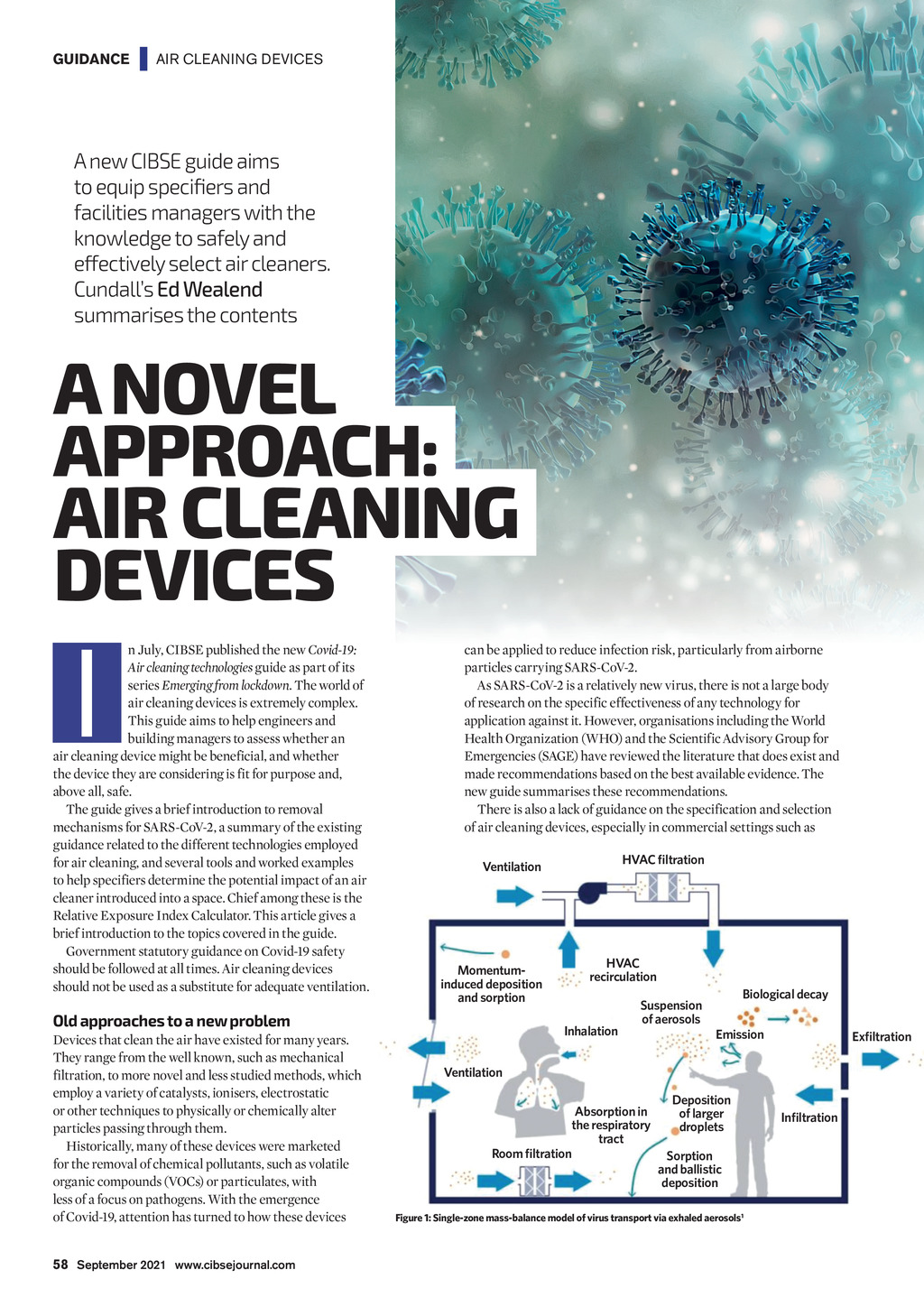 GUIDANCE | AIR CLEANING DEVICES A new CIBSE guide aims to equip specifiers and facilities managers with the knowledge to safely and effectively select air cleaners. Cundalls Ed Wealend summarises the contents A NOVEL APPROACH: AIR CLEANING DEVICES I n July, CIBSE published the new Covid-19: Air cleaning technologies guide as part of its series Emerging from lockdown. The world of air cleaning devices is extremely complex. This guide aims to help engineers and building managers to assess whether an air cleaning device might be beneficial, and whether the device they are considering is fit for purpose and, above all, safe. The guide gives a brief introduction to removal mechanisms for SARS-CoV-2, a summary of the existing guidance related to the different technologies employed for air cleaning, and several tools and worked examples to help specifiers determine the potential impact of an air cleaner introduced into a space. Chief among these is the Relative Exposure Index Calculator. This article gives a brief introduction to the topics covered in the guide. Government statutory guidance on Covid-19 safety should be followed at all times. Air cleaning devices should not be used as a substitute for adequate ventilation. can be applied to reduce infection risk, particularly from airborne particles carrying SARS-CoV-2. As SARS-CoV-2 is a relatively new virus, there is not a large body of research on the specific effectiveness of any technology for application against it. However, organisations including the World Health Organization (WHO) and the Scientific Advisory Group for Emergencies (SAGE) have reviewed the literature that does exist and made recommendations based on the best available evidence. The new guide summarises these recommendations. There is also a lack of guidance on the specification and selection of air cleaning devices, especially in commercial settings such as Ventilation Momentuminduced deposition Biological decay Suspension Old approaches to a new problem Devices that clean the air have existed for many years. They range from the well known, such as mechanical filtration, to more novel and less studied methods, which employ a variety of catalysts, ionisers, electrostatic or other techniques to physically or chemically alter particles passing through them. Historically, many of these devices were marketed for the removal of chemical pollutants, such as volatile organic compounds (VOCs) or particulates, with less of a focus on pathogens. With the emergence of Covid-19, attention has turned to how these devices HVAC Inhalation Emission Ventilation Deposition and ballistic deposition Figure 1: Single-zone mass-balance model of virus transport via exhaled aerosols1 58 September 2021 www.cibsejournal.com CIBSE Sep 21 pp58-61 Air cleaning devices.indd 58 27/08/2021 13:01