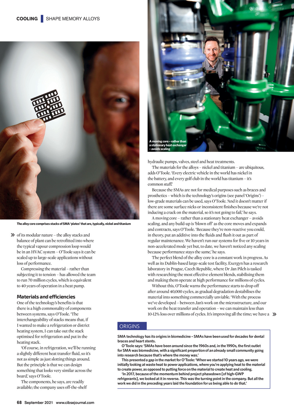 COOLING | SHAPE MEMORY ALLOYS A moving core rather than a stationary heat exchanger avoids scaling The alloy core comprises stacks of SMA plates that are, typically, nickel and titanium of its modular nature the alloy stacks and balance of plant can be retrofitted into where the typical vapour compression loop would be in an HVAC system OToole says it can be scaled up to large-scale applications without loss of performance. Compressing the material rather than subjecting it to tension has allowed the team to run 70 million cycles, which is equivalent to 40 years of operation in a heat pump. Materials and efficiencies One of the technologys benefits is that there is a high commonality of components between systems, says OToole. The interchangeability of stacks means that, if I wanted to make a refrigeration or district heating system, I can take out the stack optimised for refrigeration and put in the heating stack. Of course, in refrigeration, well be running a slightly different heat transfer fluid, so its not as simple as just slotting things around. But the principle is that we can design something that looks very similar across the board, says OToole. The components, he says, are readily available; the company uses off-the-shelf hydraulic pumps, valves, steel and heat treatments. The materials for the alloys nickel and titanium are ubiquitous, adds OToole. Every electric vehicle in the world has nickel in the battery, and every golf club in the world has titanium its common stuff. Because the SMAs are not for medical purposes such as braces and prosthetics which is the technologys origins (see panel Origins) low-grade materials can be used, says OToole. And it doesnt matter if there are some surface nicks or inconsistent finishes because were not inducing a crack on the material, so its not going to fail, he says. A moving core rather than a stationary heat exchanger avoids scaling, and any build-up is blown off as the core moves and expands and contracts, says OToole. Because theyre non-reactive you could, in theory, put an additive into the fluids and flush it out as part of regular maintenance. We havent run our systems for five or 10 years in non-accelerated mode yet but, to date, we havent noticed any scaling because performance stays the same, he says. The perfect blend of the alloy core is a constant work in progress. As well as its Dublin-based large-scale test facility, Exergyn has a research laboratory in Prague, Czech Republic, where Dr Jan Pilch is tasked with researching the most effective element blends, stabilising them and making them operate at high performance for millions of cycles. Without this, OToole warns the performance starts to drop off after around 40,000 cycles, as gradual degradation destabilises the material into something commercially unviable. With the process weve developed between Jans work on the microstructure, and our work on the heat transfer and operation we can maintain less than 10-12% loss over millions of cycles. Its improving all the time; we have a ORIGINS SMA technology has its origins in biomedicine SMAs have been used for decades for dental braces and heart stents. into research because thats where the money was. 68 September 2021 www.cibsejournal.com CIBSE Sep 21 pp67-68, 70 Exergyn.indd 68 27/08/2021 13:43