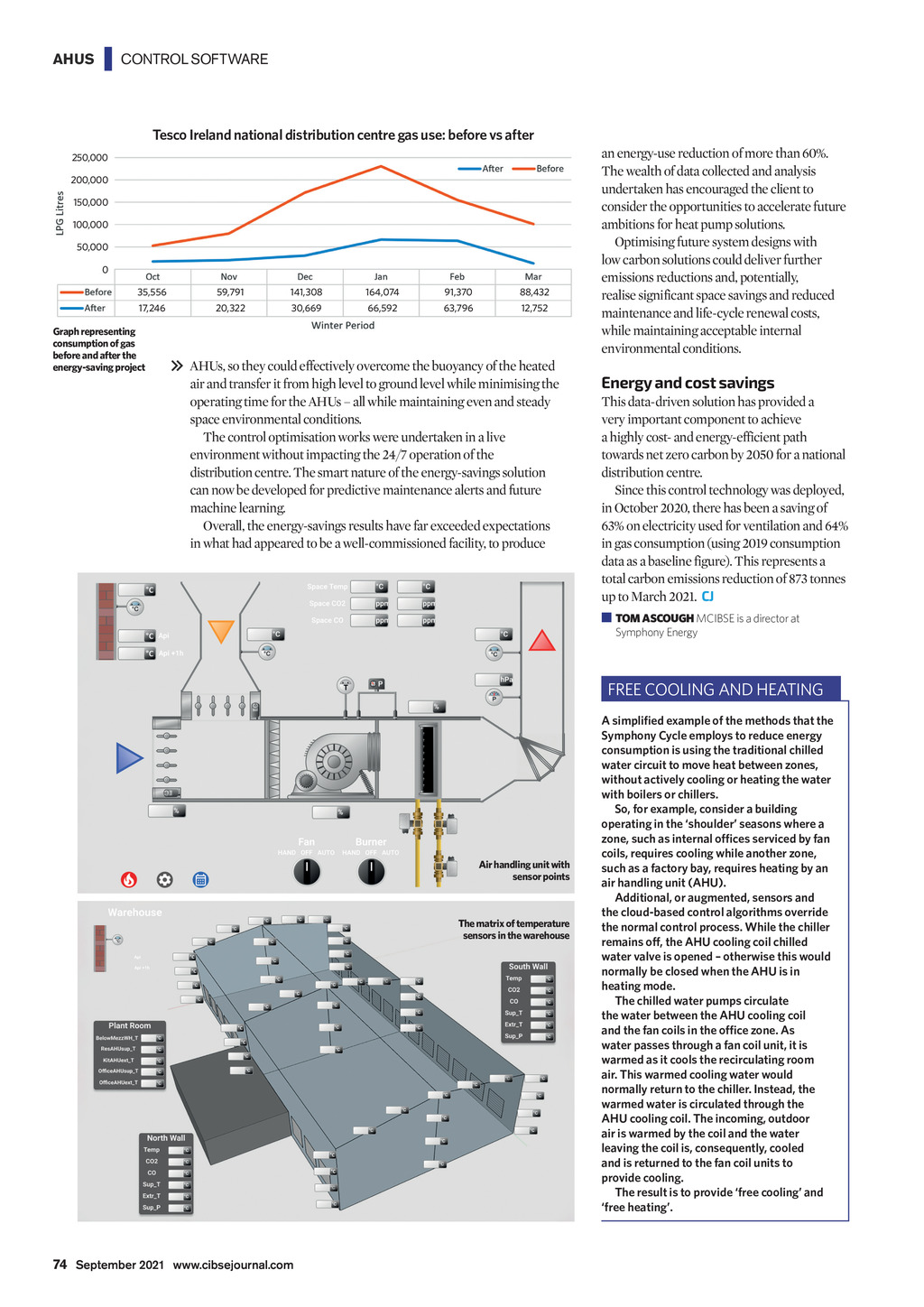 AHUS | CONTROL SOFTWARE Tesco Ireland national distribution centre gas use: before vs after 250,000 200,000 150,000 100,000 50,000 0 35,556 59,791 141,308 164,074 91,370 88,432 17,246 20,322 30,669 66,592 63,796 12,752 Graph representing consumption of gas before and after the energy-saving project AHUs, so they could effectively overcome the buoyancy of the heated air and transfer it from high level to ground level while minimising the operating time for the AHUs all while maintaining even and steady space environmental conditions. The control optimisation works were undertaken in a live environment without impacting the 24/7 operation of the distribution centre. The smart nature of the energy-savings solution can now be developed for predictive maintenance alerts and future machine learning. Overall, the energy-savings results have far exceeded expectations in what had appeared to be a well-commissioned facility, to produce an energy-use reduction of more than 60%. The wealth of data collected and analysis undertaken has encouraged the client to consider the opportunities to accelerate future ambitions for heat pump solutions. Optimising future system designs with low carbon solutions could deliver further emissions reductions and, potentially, realise significant space savings and reduced maintenance and life-cycle renewal costs, while maintaining acceptable internal environmental conditions. Energy and cost savings This data-driven solution has provided a very important component to achieve a highly cost- and energy-efficient path towards net zero carbon by 2050 for a national distribution centre. Since this control technology was deployed, in October 2020, there has been a saving of 63% on electricity used for ventilation and 64% in gas consumption (using 2019 consumption data as a baseline figure). This represents a total carbon emissions reduction of 873 tonnes up to March 2021. CJ TOM ASCOUGH MCIBSE is a director at Symphony Energy FREE COOLING AND HEATING Air handling unit with sensor points The matrix of temperature sensors in the warehouse 74 September 2021 www.cibsejournal.com CIBSE Sep 21 pp73-74 Symphony Tesco.indd 74 27/08/2021 16:28