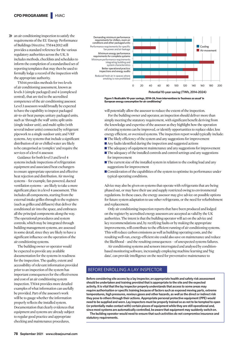 CPD PROGRAMME | HVAC an air conditioning inspection to satisfy the requirements of the EU Energy Performance of Buildings Directive. TM44:2012 still provides a standard reference for the various regulatory authorities across the UK. It includes methods, checklists and schedules to inform the completion of a standardised set of reporting templates that may then be used to formally lodge a record of the inspection with the appropriate authority. TM44 provides methods for two levels of air conditioning assessment, known as levels 3 (simple packaged) and 4 (complexed central), that are tied to the accredited competence of the air conditioning assessor. Level 3 assessors would broadly be expected to have the capability to inspect packaged air-to-air heat pumps; unitary packaged units, such as through the wall units; split units (single indoor unit), and multi-splits (with several indoor units) connected by refrigerant pipework to a single outdoor unit; and VRF systems. Any systems that include a significant distribution of air or chilled water are likely to be categorised as complex and require the services of a level 4 assessor. Guidance for both level 3 and level 4 systems include inspections of refrigeration equipment and associated heat exchangers to ensure appropriate operation and effective heat rejection and distribution. Air moving systems for example, fan-powered, ducted ventilation systems are likely to take a more significant place in a level 4 assessment. This includes all components, starting from the external intake grilles through to the registers (such as grilles and diffusers) that deliver the conditioned air into the space, and embraces all the principal components along the way. The operational procedures and system controls, which may be integrated through building management systems, are assessed in some detail, since they are likely to have a significant influence on the operation of the air conditioning systems. The building owner or operator would be expected to provide any available documentation for the systems in readiness for the inspection. The quality, extent and accessibility of relevant information provided prior to an inspection of the system has important consequences for the effectiveness and cost of an air conditioning system inspection. TM44 provides more detailed examples of what information can usefully be provided. Part of the assessors work will be to gauge whether the information properly reflects the installed system. Documentation that clearly evidences that equipment and systems are already subject to regular good practice and appropriate checking and maintenance procedures, Demanding minimum performance requirements for chillers, room air conditions and other packaged units Cooling Air movement fan power and air leakage Minimum energy performance requirements for complete systems Minimum performance requirements integrating building and system characteristics Better operational practice: inspections and energy audits Reduced fresh air in spaces where smoking is now prohibited 0 20 40 60 80 100 120 140 160 180 200 Potential 10-year saving (TWh, 2014-2024) Figure 1: Realisable 10-year savings, 2014-24, from interventions to business as usual in European energy consumption for air conditioning3 will potentially allow the assessor to reduce the extent of the inspection. For the building owner and operator, an inspection should deliver more than simply meeting the statutory requirement, with significant benefit deriving from the knowledge and expertise of the assessor as they highlight how the operation of existing systems can be improved, or identify opportunities to replace older, less energy efficient, or oversized systems. The inspection report would typically include: The likely efficiency of the system and any suggestions for improvement Any faults identified during the inspection and suggested actions The adequacy of equipment maintenance and any suggestions for improvement The adequacy of the installed controls and control settings and any suggestions for improvement The current size of the installed system in relation to the cooling load and any suggestions for improvement Consideration of the capabilities of the system to optimise its performance under typical operating conditions. Advice may also be given on systems that operate with refrigerants that are being phased out, or may have their use and supply restricted owing to environmental regulations. In these cases, the energy assessor may give advice on possible options for future system adaptation to use other refrigerants, or the need for refurbishment and replacement. Only air conditioning inspection reports that have been produced and lodged on the register by accredited energy assessors are accepted as valid by the UK authorities. The intent is that the building operator will act on the advice and key recommendations and, by rectifying faults or by making the appropriate improvements, will contribute to the efficient running of air conditioning systems. This will reduce carbon emissions as well as building operating costs, and the resulting well-run, energy-efficient site could also save on maintenance and reduce the likelihood and the resulting consequences of unexpected systems failures. Air conditioning systems and sensors interrogated and analysed by conditionbased monitoring software, increasingly employing machine learning and big data, can provide intelligence on the need for preventative maintenance to BEFORE ENROLLING A LAY INSPECTOR Before considering site access by a lay inspector, an appropriate health and safety risk assessment should be undertaken and training provided that is appropriate to the site and the expected activity. It is vital that the lay inspector properly understands that access to some areas may temperatures, high pressures, noxious gases and other hazards, as well as the direct or indirect risk they pose to others through their actions. Appropriate perso