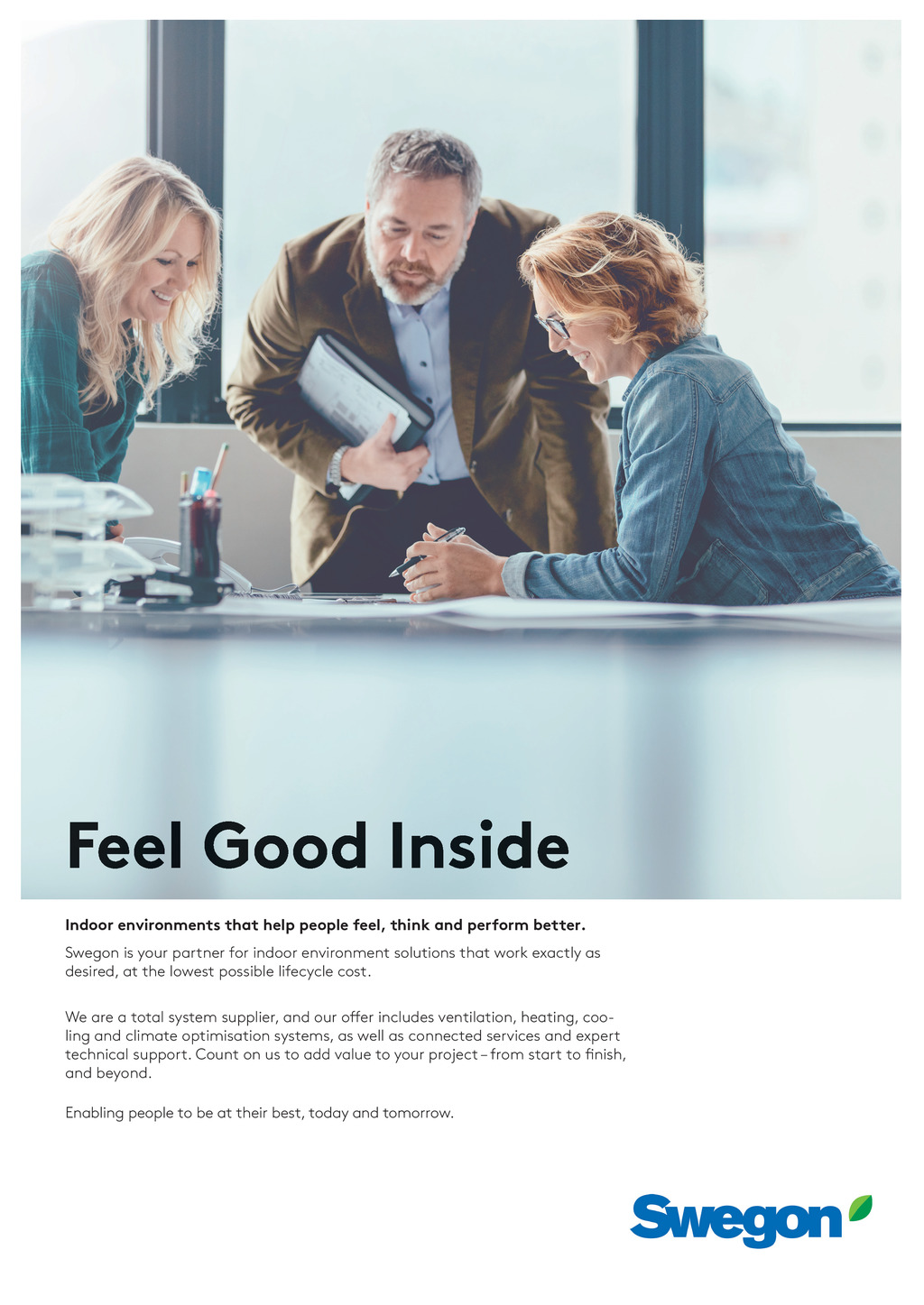 Indoor environments that help people feel, think and perform better. Swegon is your partner for indoor environment solutions that work exactly as desired, at the lowest possible lifecycle cost. :HDUHDWRWDOV\VWHPVXSSOLHUDQGRXURHULQFOXGHVYHQWLODWLRQKHDWLQJFRRling and climate optimisation systems, as well as connected services and expert WHFKQLFDOVXSSRUW&RXQWRQXVWRDGGYDOXHWR\RXUSURMHFWIURPVWDUWWRQLVK and beyond. Enabling people to be at their best, today and tomorrow. 48 December 2021 www.cibsejournal.com Swegon FP.indd 1 p48.CIBSEMagDec21.indd 48 16/11/2021 12:16 15:22 23/11/2021