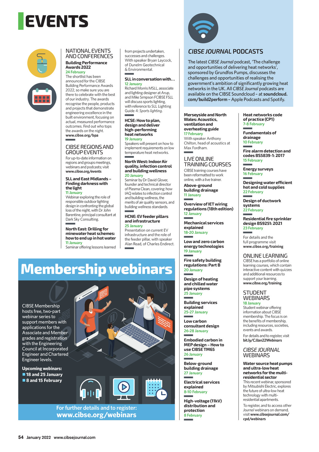 EVENTS NATIONAL EVENTS AND CONFERENCES Building Performance Awards 2022 24 February The shortlist has been announced for the CIBSE Building Performance Awards 2022, so make sure you are there to celebrate with the best of our industry. The awards recognise the people, products and projects that demonstrate engineering excellence in the built environment, focusing on actual, measured performance outcomes. Find out who tops the awards on the night. www.cibse.org/bpa CIBSE REGIONS AND GROUP EVENTS For up-to-date information on regions and groups meetings, webinars and podcasts; visit www.cibse.org/events SLL and East Midlands Finding darkness with the light 11 January Webinar exploring the role of responsible outdoor lighting design in confronting the global loss of the night, with Dr John Barentine, principal consultant at Dark Sky Consulting. North East: Drilling for minewater heat schemes: how to end up in hot water 11 January Seminar offering lessons learned from projects undertaken, successes and challenges. With speaker Bryan Laycock, of Dunelm Geotechnical & Environmental. SLL in conversation with 12 January Richard Morris MSLL, associate and lighting designer at Arup, and Mike Simpson FCIBSE FSLL will discuss sports lighting, with reference to SLL Lighting Guide 4: Sports lighting. HCSE: How to plan, design and deliver high-performing heat networks 19 January Speakers will present on how to implement requirements on low temperature heat networks. North West: Indoor Air quality, infection control and building wellness 20 January Seminar by Dr David Glover, founder and technical director of Plasma Clean, covering: how IAQ relates to infection control and building wellness, the merits of air quality sensors, and building wellness standards. HCNE: EV feeder pillars and infrastructure 25 January Presentation on current EV infrastructure and the role of the feeder pillar, with speaker Alan Read, of Charles Endirect. Membership webinars CIBSE JOURNAL PODCASTS The latest CIBSE Journal podcast, The challenge and opportunities of delivering heat networks, sponsored by Grundfos Pumps, discusses the challenges and opportunities of realising the governments ambition of signicantly growing heat networks in the UK. All CIBSE Journal podcasts are available on the CIBSE Soundcloud at soundcloud. com/build2perform Apple Podcasts and Spotify. Merseyside and North Wales: Acoustics, ventilation and overheating guide 17 February With speaker Anthony Chilton, head of acoustics at Max Fordham. LIVE ONLINE TRAINING COURSES CIBSE training courses have been reformatted to work online, with a live trainer. Above-ground building drainage 11 January Overview of IET wiring regulations (18th edition) 12 January Mechanical services explained 18-20 January Low and zero carbon energy technologies 19 January Fire safety building regulations: Part B 20 January Design of heating and chilled water pipe systems 25 January CIBSE Membership hosts free, two-part webinar series to support members with applications for the Associate and Member grades and registration with the Engineering Council at Incorporated Engineer and Chartered Engineer levels. Upcoming webinars: 18 and 25 January 8 and 15 February Building services explained 25-27 January Low carbon consultant design 26-28 January Embodied carbon in MEP design How to use CIBSE TM65 26 January Below-ground building drainage 27 January Electrical services explained 8-10 February For further details and to register: www.cibse.org/webinars High-voltage (11kV) distribution and protection 8 February Heat networks code of practice (CP1) 7-8 February Fundamentals of drainage 10 February Fire alarm detection and codes BS5839-1: 2017 15 February Energy surveys 16 February Designing water efficient hot and cold supplies 22 February Design of ductwork systems 22 February Residential fire sprinkler design BS9251: 2021 23 February For details and the full programme visit www.cibse.org/training ONLINE LEARNING CIBSE has a portfolio of online learning courses, which contain interactive content with quizzes and additional resources to support your learning. www.cibse.org/training STUDENT WEBINARS 18 January Student webinar offering information about CIBSE membership. The focus is on the benets of membership, including resources, societies, events and awards. For details and to register, visit bit.ly/CJJan22Webinars CIBSE JOURNAL WEBINARS Water source heat pumps and ultra-low heat networks for the multiresidential sector This recent webinar, sponsored by Mitsubishi Electric, explores the future of ultra-low heat technology with multiresidential apartments. To register, and to access other Journal webinars on demand, visit www.cibsejournal.com/ cpd/webinars 54 January 2022 www.cibsejournal.com CIBSE Jan 22 pp54 Events.indd 54 23/12/2021 13:04