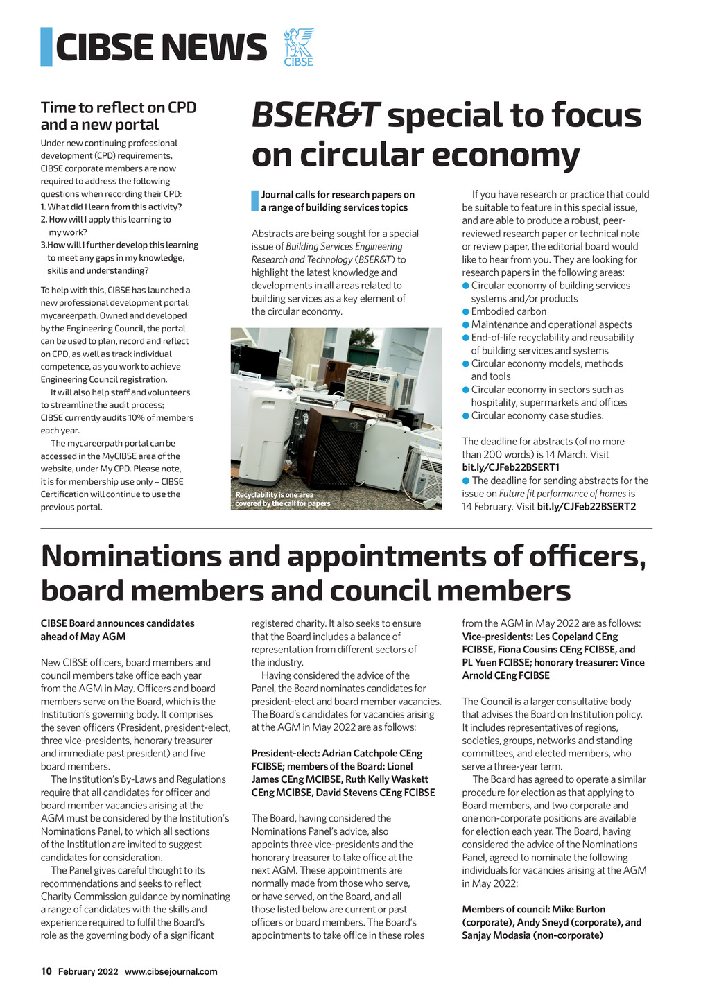CIBSE NEWS Time to reflect on CPD and a new portal Under new continuing professional development (CPD) requirements, CIBSE corporate members are now required to address the following questions when recording their CPD: 1. What did I learn from this activity? 2. How will I apply this learning to my work? 3.How will I further develop this learning to meet any gaps in my knowledge, skills and understanding? To help with this, CIBSE has launched a new professional development portal: mycareerpath. Owned and developed by the Engineering Council, the portal can be used to plan, record and reflect on CPD, as well as track individual competence, as you work to achieve Engineering Council registration. It will also help staff and volunteers to streamline the audit process; CIBSE currently audits 10% of members each year. The mycareerpath portal can be accessed in the MyCIBSE area of the website, under My CPD. Please note, it is for membership use only CIBSE Certification will continue to use the previous portal. BSER&T special to focus on circular economy Journal calls for research papers on a range of building services topics Abstracts are being sought for a special issue of Building Services Engineering Research and Technology (BSER&T) to highlight the latest knowledge and developments in all areas related to building services as a key element of the circular economy. Recyclability is one area covered by the call for papers If you have research or practice that could be suitable to feature in this special issue, and are able to produce a robust, peerreviewed research paper or technical note or review paper, the editorial board would like to hear from you. They are looking for research papers in the following areas: Circular economy of building services systems and/or products Embodied carbon Maintenance and operational aspects End-of-life recyclability and reusability of building services and systems Circular economy models, methods and tools Circular economy in sectors such as hospitality, supermarkets and offices Circular economy case studies. The deadline for abstracts (of no more than 200 words) is 14 March. Visit bit.ly/CJFeb22BSERT1 The deadline for sending abstracts for the issue on Future fit performance of homes is 14 February. Visit bit.ly/CJFeb22BSERT2 Nominations and appointments of officers, board members and council members CIBSE Board announces candidates ahead of May AGM New CIBSE officers, board members and council members take office each year from the AGM in May. Officers and board members serve on the Board, which is the Institutions governing body. It comprises the seven officers (President, president-elect, three vice-presidents, honorary treasurer and immediate past president) and five board members. The Institutions By-Laws and Regulations require that all candidates for officer and board member vacancies arising at the AGM must be considered by the Institutions Nominations Panel, to which all sections of the Institution are invited to suggest candidates for consideration. The Panel gives careful thought to its recommendations and seeks to reflect Charity Commission guidance by nominating a range of candidates with the skills and experience required to fulfil the Boards role as the governing body of a significant registered charity. It also seeks to ensure that the Board includes a balance of representation from different sectors of the industry. Having considered the advice of the Panel, the Board nominates candidates for president-elect and board member vacancies. The Boards candidates for vacancies arising at the AGM in May 2022 are as follows: President-elect: Adrian Catchpole CEng FCIBSE; members of the Board: Lionel James CEng MCIBSE, Ruth Kelly Waskett CEng MCIBSE, David Stevens CEng FCIBSE The Board, having considered the Nominations Panels advice, also appoints three vice-presidents and the honorary treasurer to take office at the next AGM. These appointments are normally made from those who serve, or have served, on the Board, and all those listed below are current or past officers or board members. The Boards appointments to take office in these roles from the AGM in May 2022 are as follows: Vice-presidents: Les Copeland CEng FCIBSE, Fiona Cousins CEng FCIBSE, and PL Yuen FCIBSE; honorary treasurer: Vince Arnold CEng FCIBSE The Council is a larger consultative body that advises the Board on Institution policy. It includes representatives of regions, societies, groups, networks and standing committees, and elected members, who serve a three-year term. The Board has agreed to operate a similar procedure for election as that applying to Board members, and two corporate and one non-corporate positions are available for election each year. The Board, having considered the advice of the Nominations Panel, agreed to nominate the following individuals for vacancies arising at the AGM in May 2022: Members of council: Mike Burton (corporate), Andy Sneyd (corporate), and Sanjay Modasia (non-corporate) 10 February 2022 www.cibsejournal.com CIBSE Feb22 pp10-11 CIBSE News v2.indd 10 28/01/2022 16:03