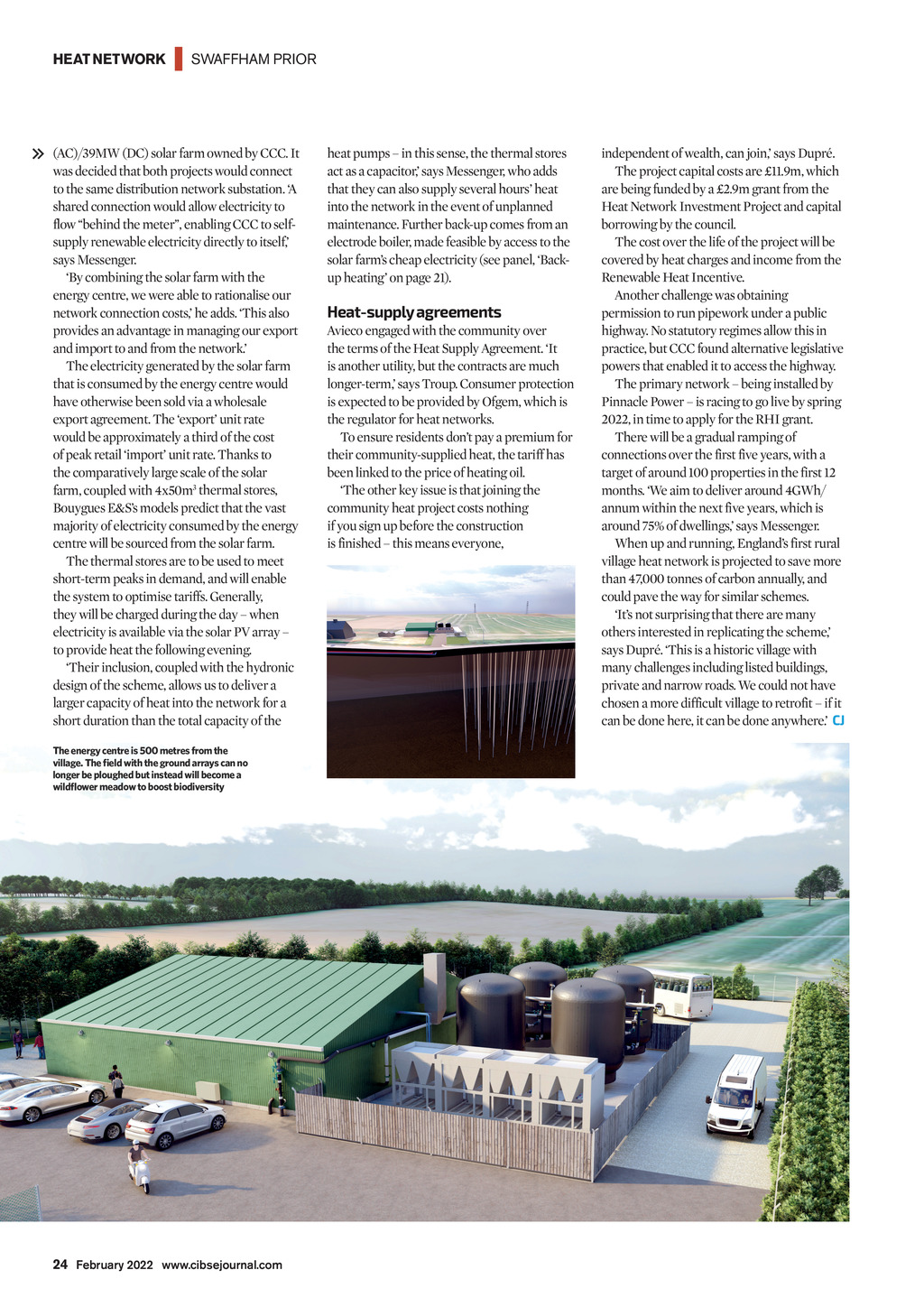 HEAT NETWORK | SWAFFHAM PRIOR (AC)/39MW (DC) solar farm owned by CCC. It was decided that both projects would connect to the same distribution network substation. A shared connection would allow electricity to flow behind the meter, enabling CCC to selfsupply renewable electricity directly to itself, says Messenger. By combining the solar farm with the energy centre, we were able to rationalise our network connection costs, he adds. This also provides an advantage in managing our export and import to and from the network. The electricity generated by the solar farm that is consumed by the energy centre would have otherwise been sold via a wholesale export agreement. The export unit rate would be approximately a third of the cost of peak retail import unit rate. Thanks to the comparatively large scale of the solar farm, coupled with 4x50m3 thermal stores, Bouygues E&Ss models predict that the vast majority of electricity consumed by the energy centre will be sourced from the solar farm. The thermal stores are to be used to meet short-term peaks in demand, and will enable the system to optimise tariffs. Generally, they will be charged during the day when electricity is available via the solar PV array to provide heat the following evening. Their inclusion, coupled with the hydronic design of the scheme, allows us to deliver a larger capacity of heat into the network for a short duration than the total capacity of the heat pumps in this sense, the thermal stores act as a capacitor, says Messenger, who adds that they can also supply several hours heat into the network in the event of unplanned maintenance. Further back-up comes from an electrode boiler, made feasible by access to the solar farms cheap electricity (see panel, Backup heating on page 21). Heat-supply agreements Avieco engaged with the community over the terms of the Heat Supply Agreement. It is another utility, but the contracts are much longer-term, says Troup. Consumer protection is expected to be provided by Ofgem, which is the regulator for heat networks. To ensure residents dont pay a premium for their community-supplied heat, the tariff has been linked to the price of heating oil. The other key issue is that joining the community heat project costs nothing if you sign up before the construction is finished this means everyone, independent of wealth, can join, says Dupr. The project capital costs are 11.9m, which are being funded by a 2.9m grant from the Heat Network Investment Project and capital borrowing by the council. The cost over the life of the project will be covered by heat charges and income from the Renewable Heat Incentive. Another challenge was obtaining permission to run pipework under a public highway. No statutory regimes allow this in practice, but CCC found alternative legislative powers that enabled it to access the highway. The primary network being installed by Pinnacle Power is racing to go live by spring 2022, in time to apply for the RHI grant. There will be a gradual ramping of connections over the first five years, with a target of around 100 properties in the first 12 months. We aim to deliver around 4GWh/ annum within the next five years, which is around 75% of dwellings, says Messenger. When up and running, Englands first rural village heat network is projected to save more than 47,000 tonnes of carbon annually, and could pave the way for similar schemes. Its not surprising that there are many others interested in replicating the scheme, says Dupr. This is a historic village with many challenges including listed buildings, private and narrow roads. We could not have chosen a more difficult village to retrofit if it can be done here, it can be done anywhere. CJ The energy centre is 500 metres from the village. The field with the ground arrays can no longer be ploughed but instead will become a wildflower meadow to boost biodiversity 24 February 2022 www.cibsejournal.com CIBSE Feb22 pp20-22, 24 Swaffham Prior.indd 24 28/01/2022 16:19